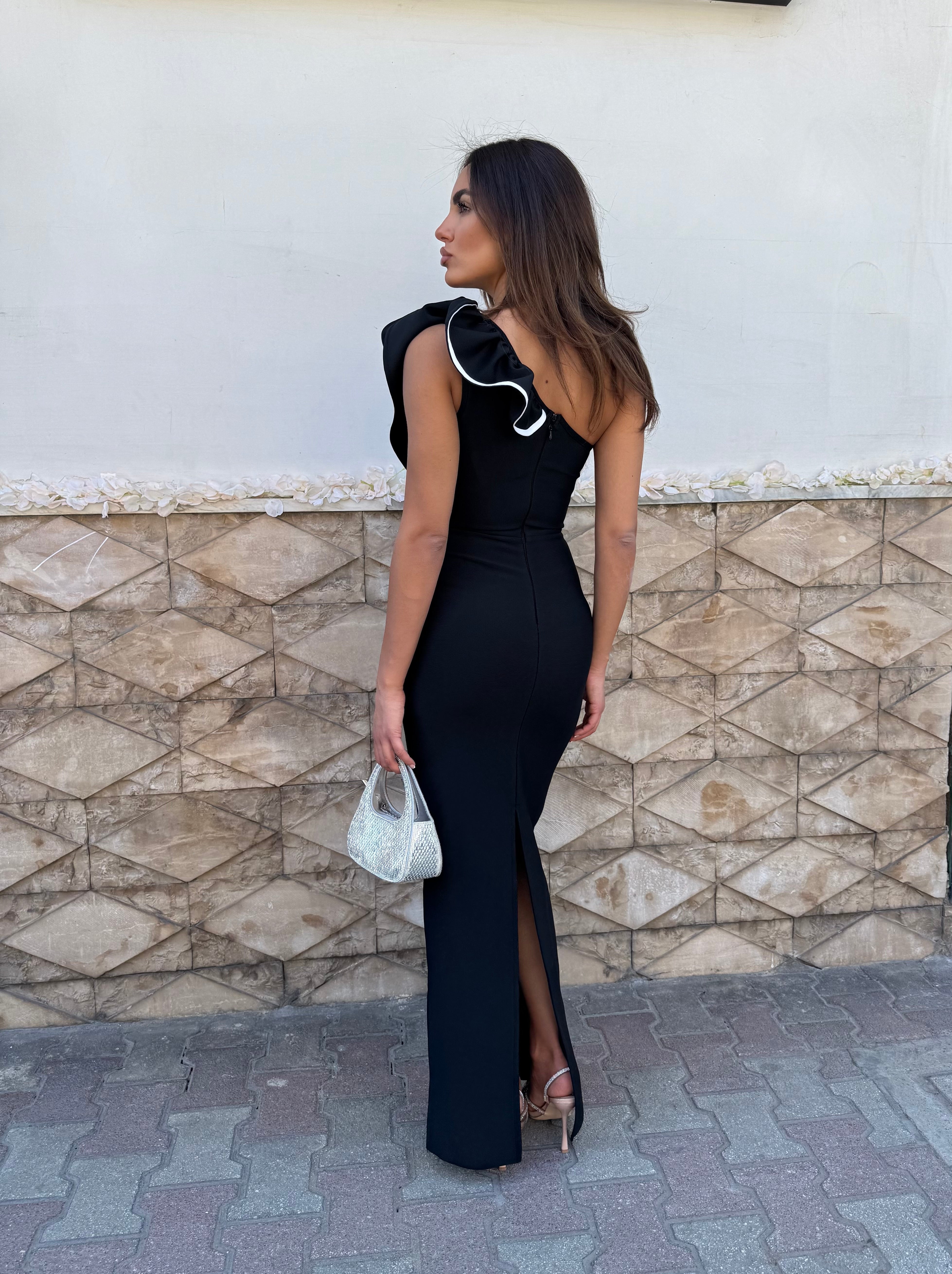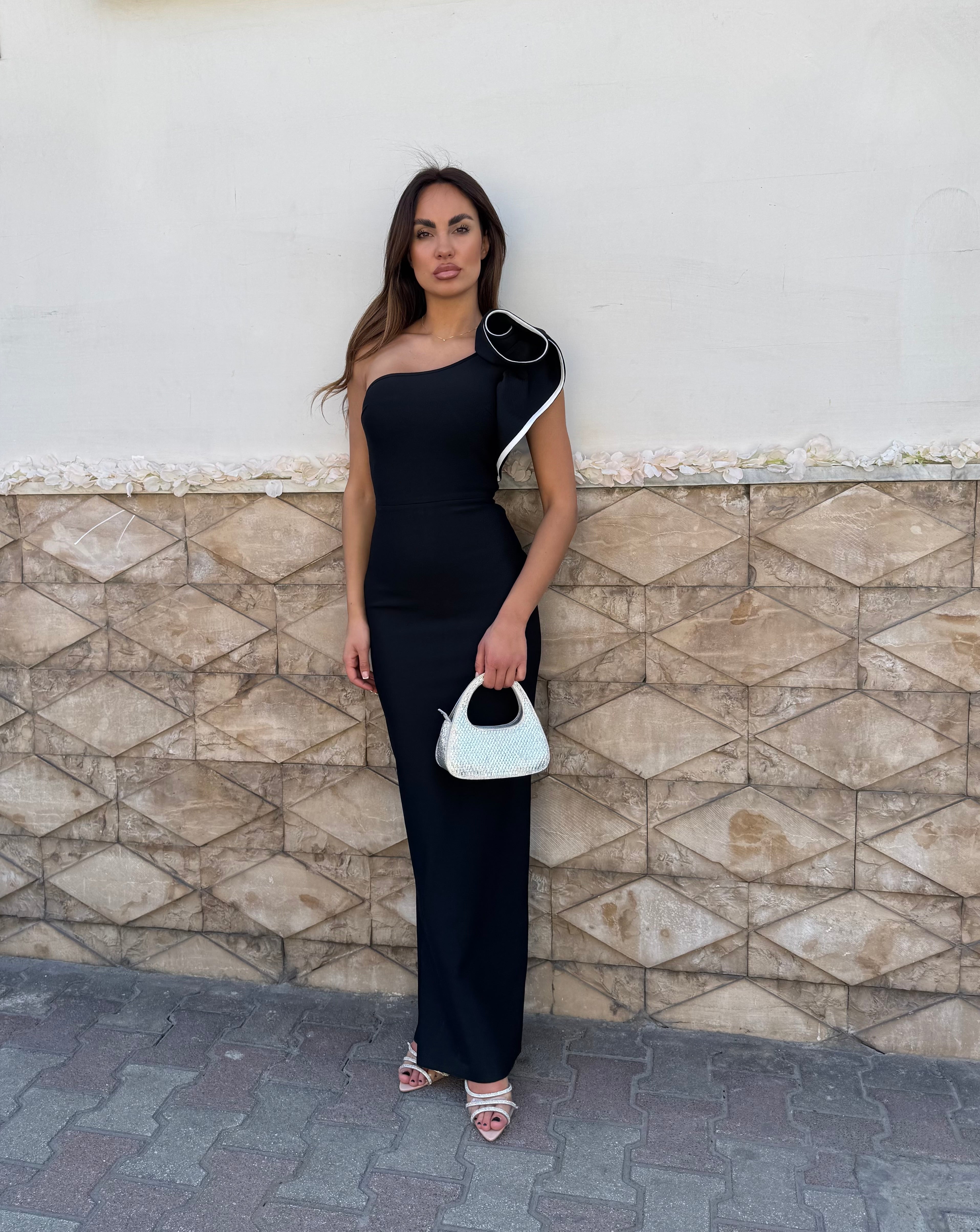 Abito bandage (tessuto elastico) con ruches su spalla che forma una bellissima rosa.