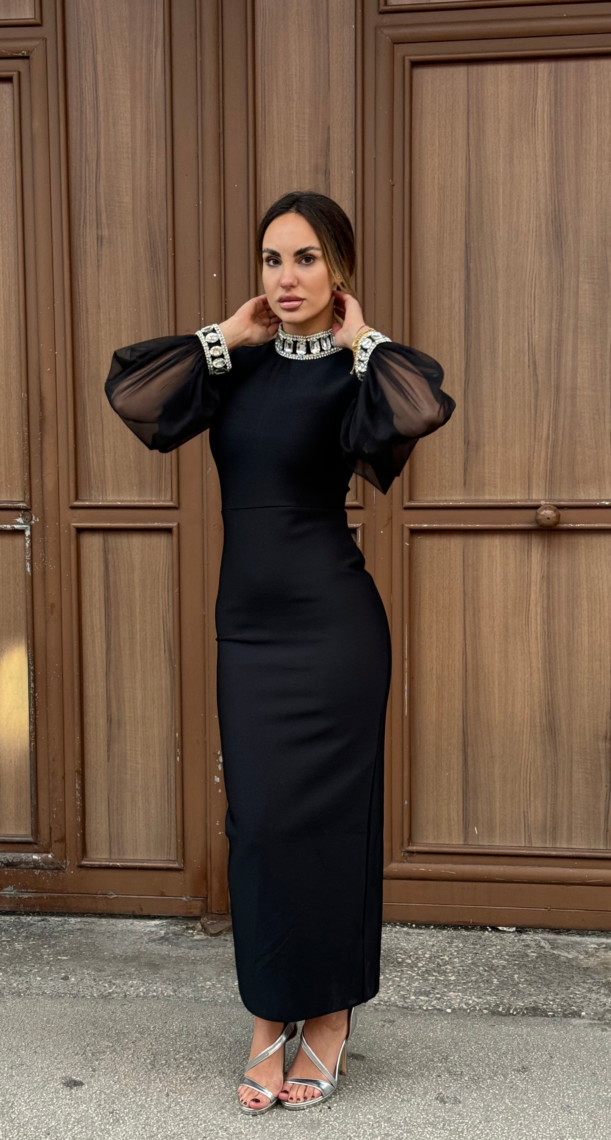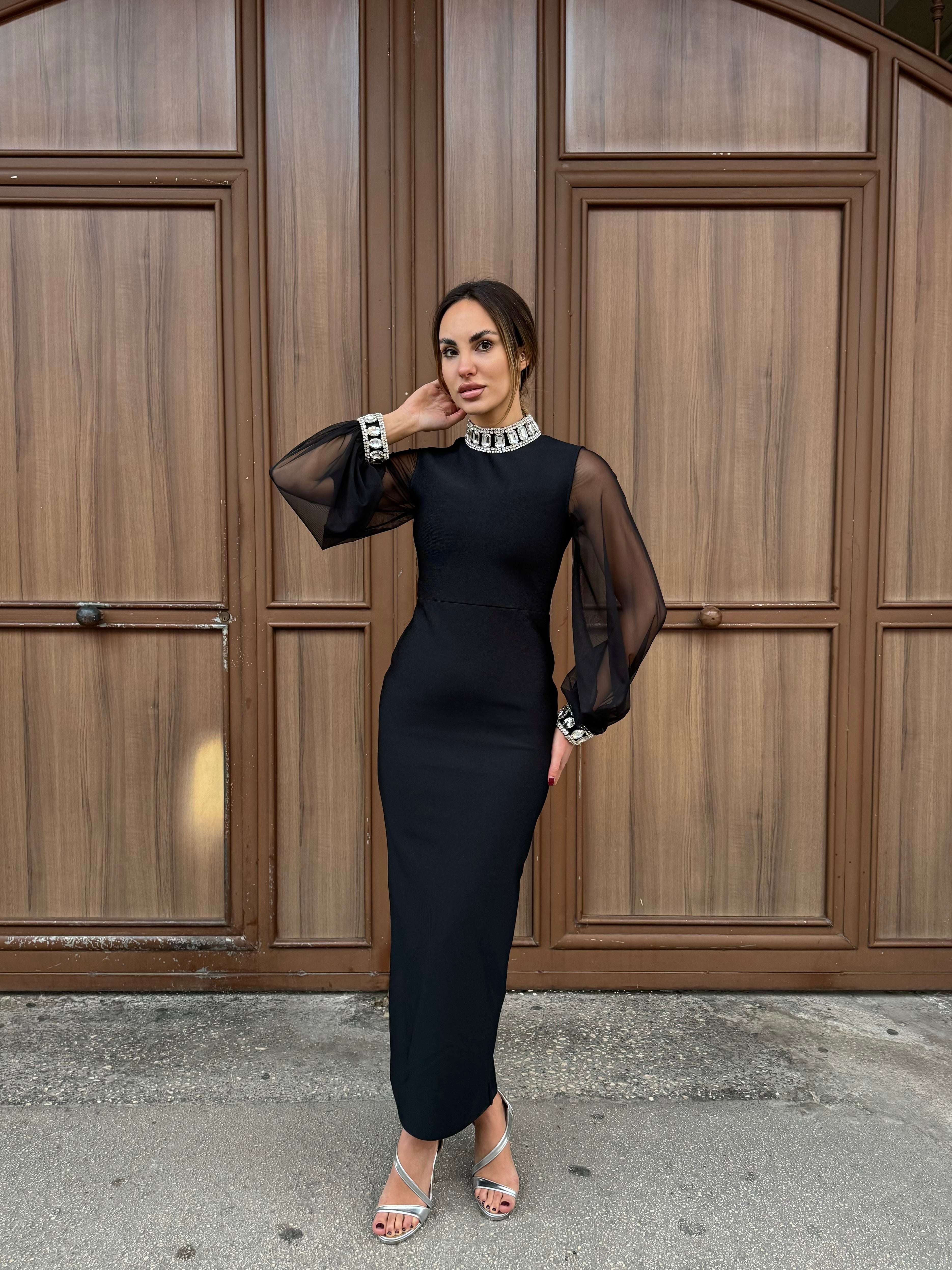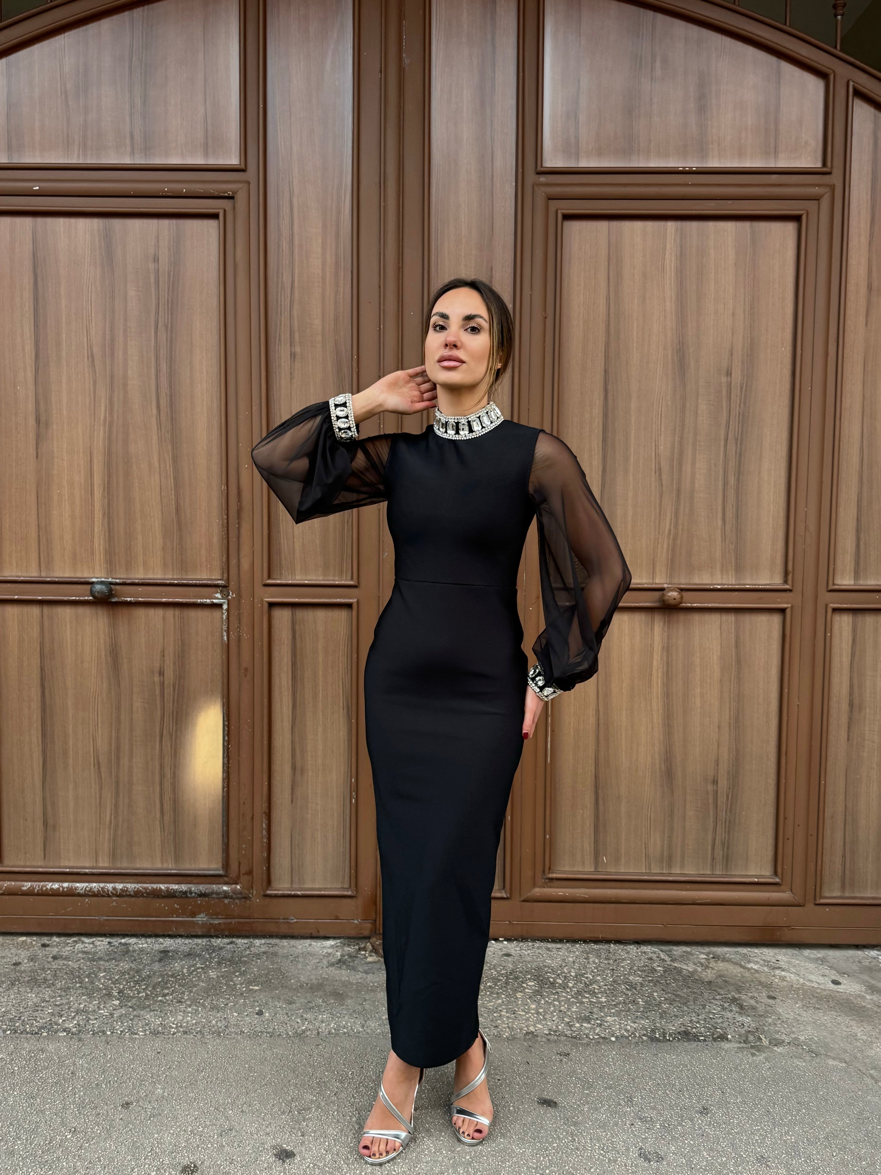 I dettagli in swarovski al collo e sui polsini aggiungono eleganza e raffinatezza a questo bellissimo abito.