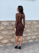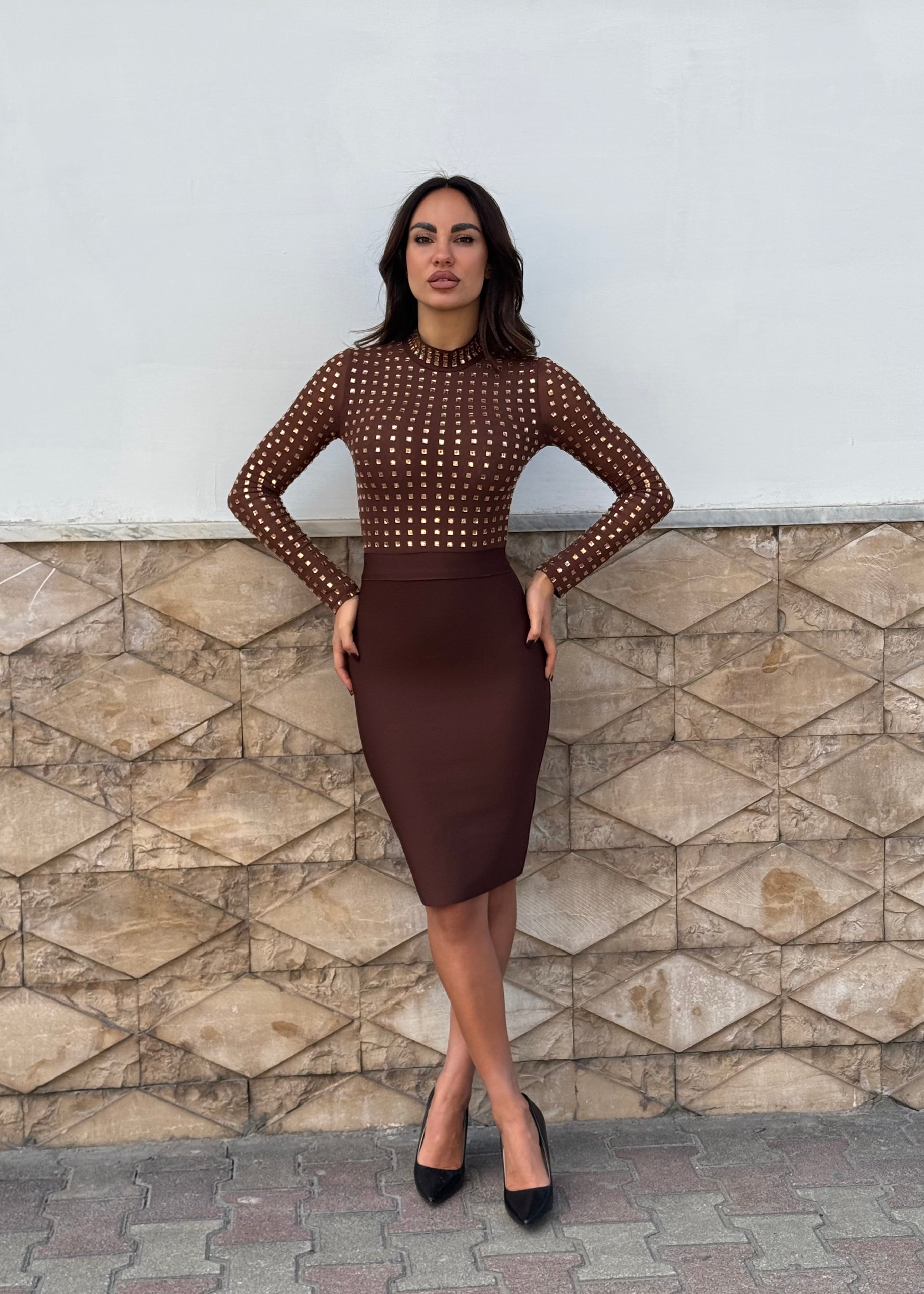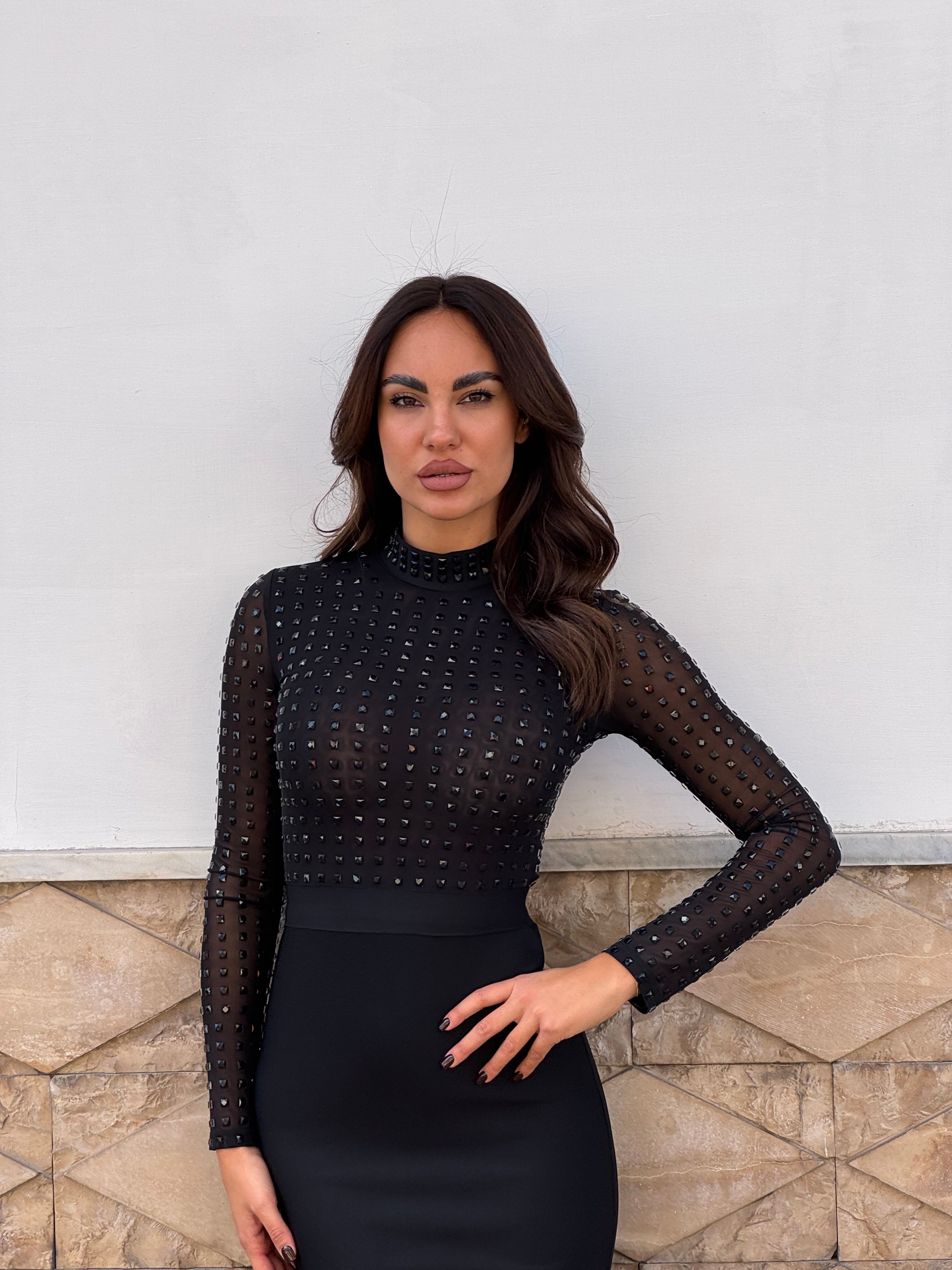 Bellissimo abito bandage con corpetto in velo tempestato di pailletes quadrate ,la gonna effetto modellante avvolge le forme in un modo sensuale .
