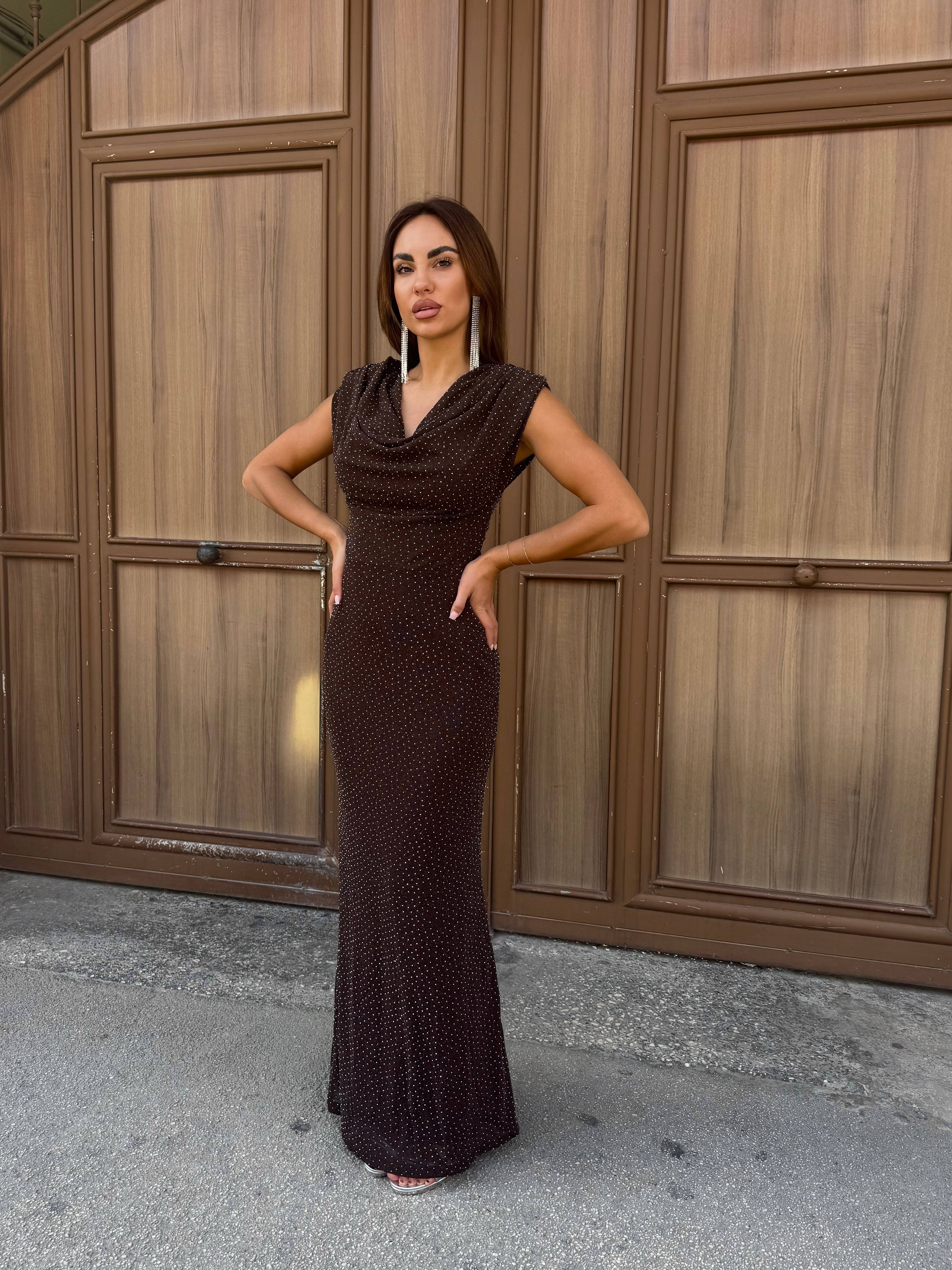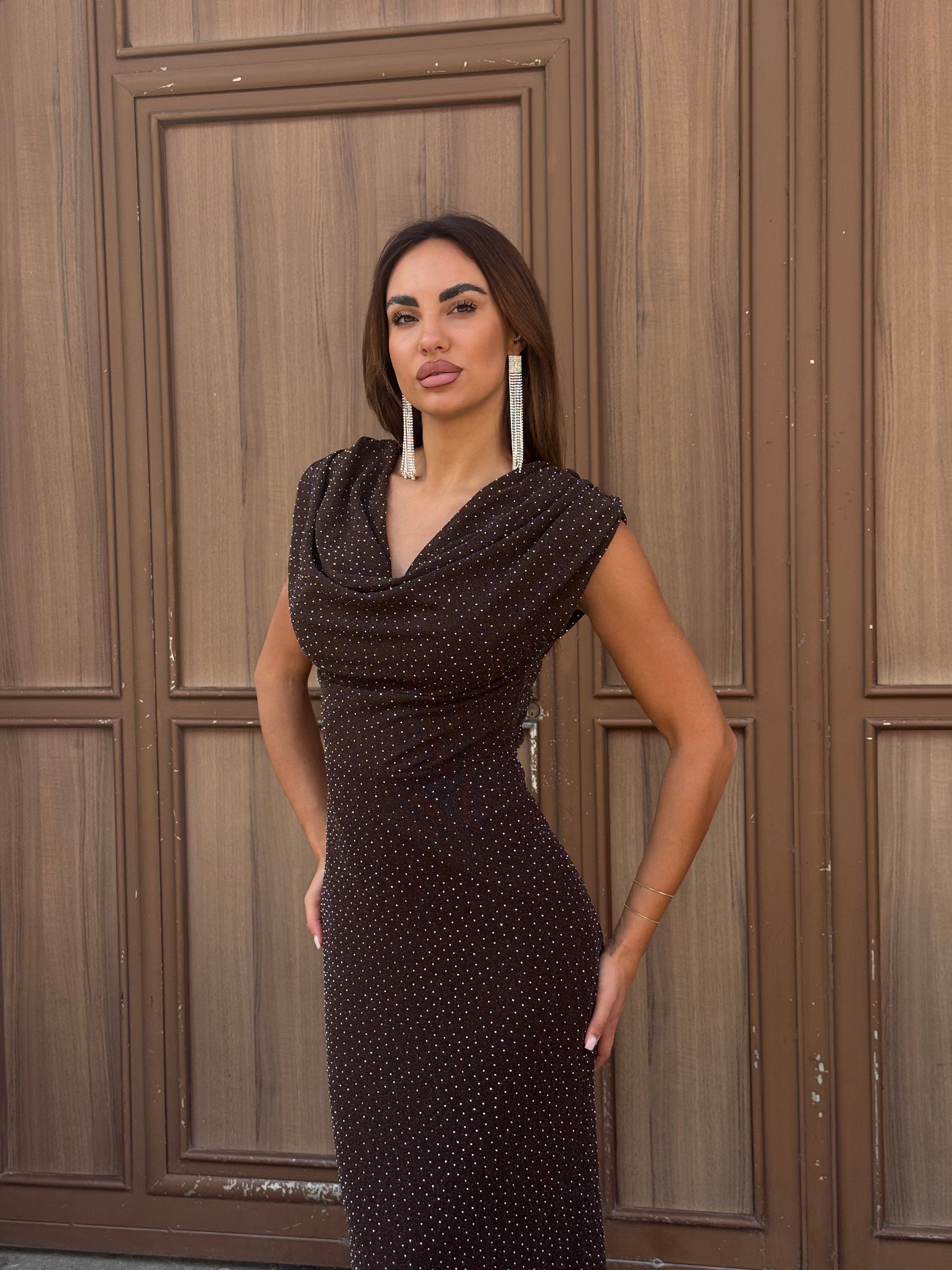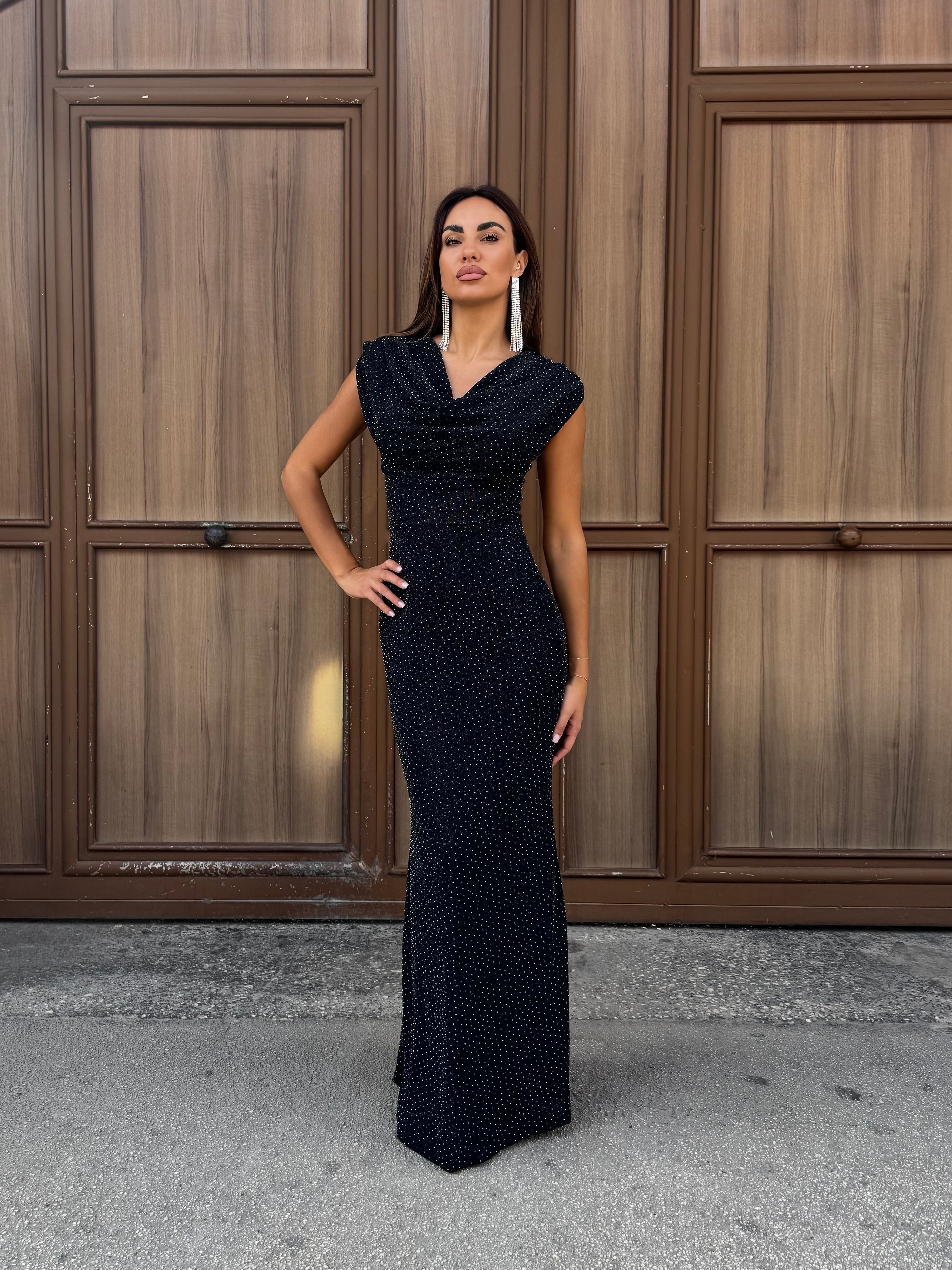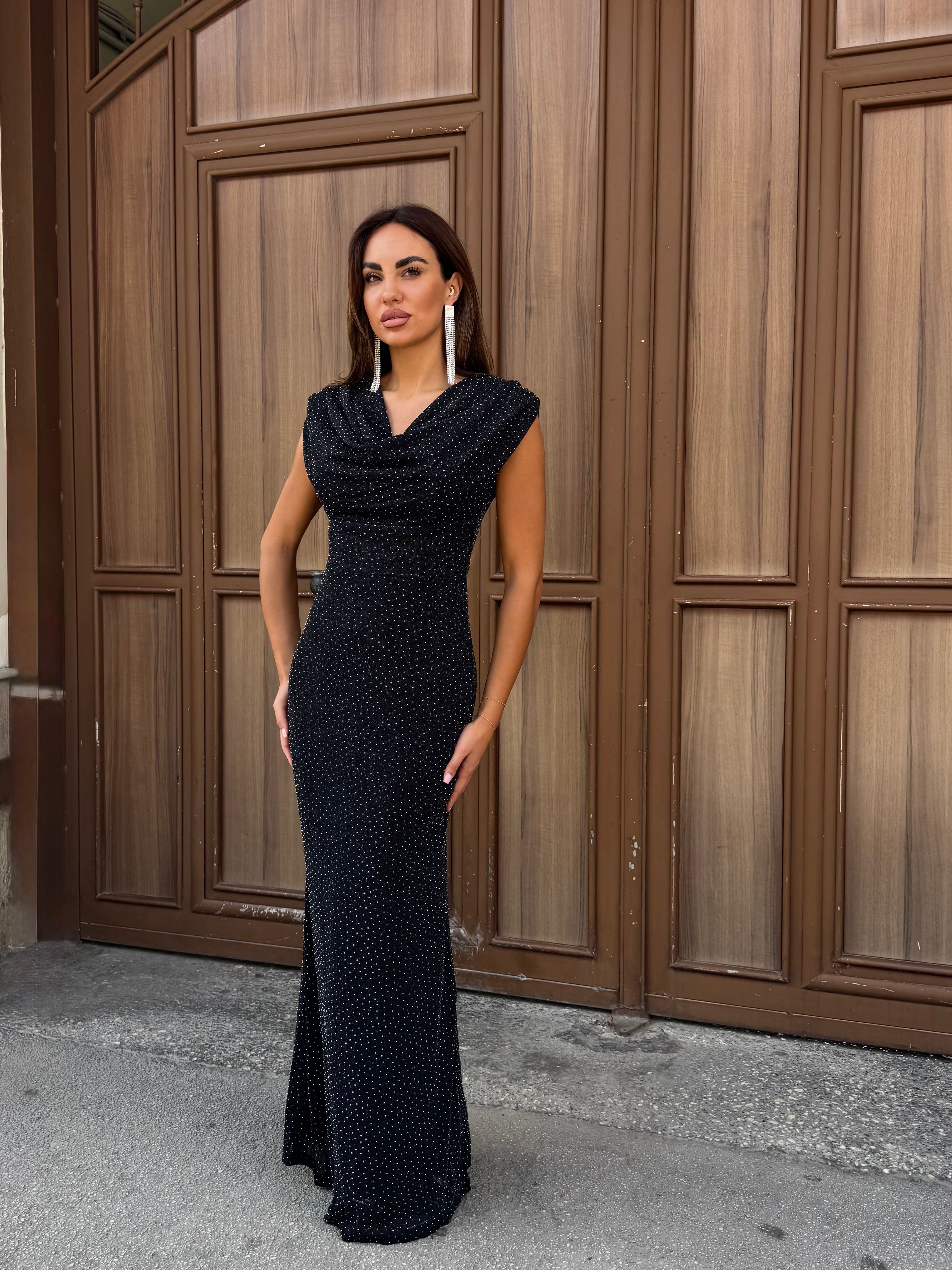 Bellissimo abito lungo tempestato di brillantini .