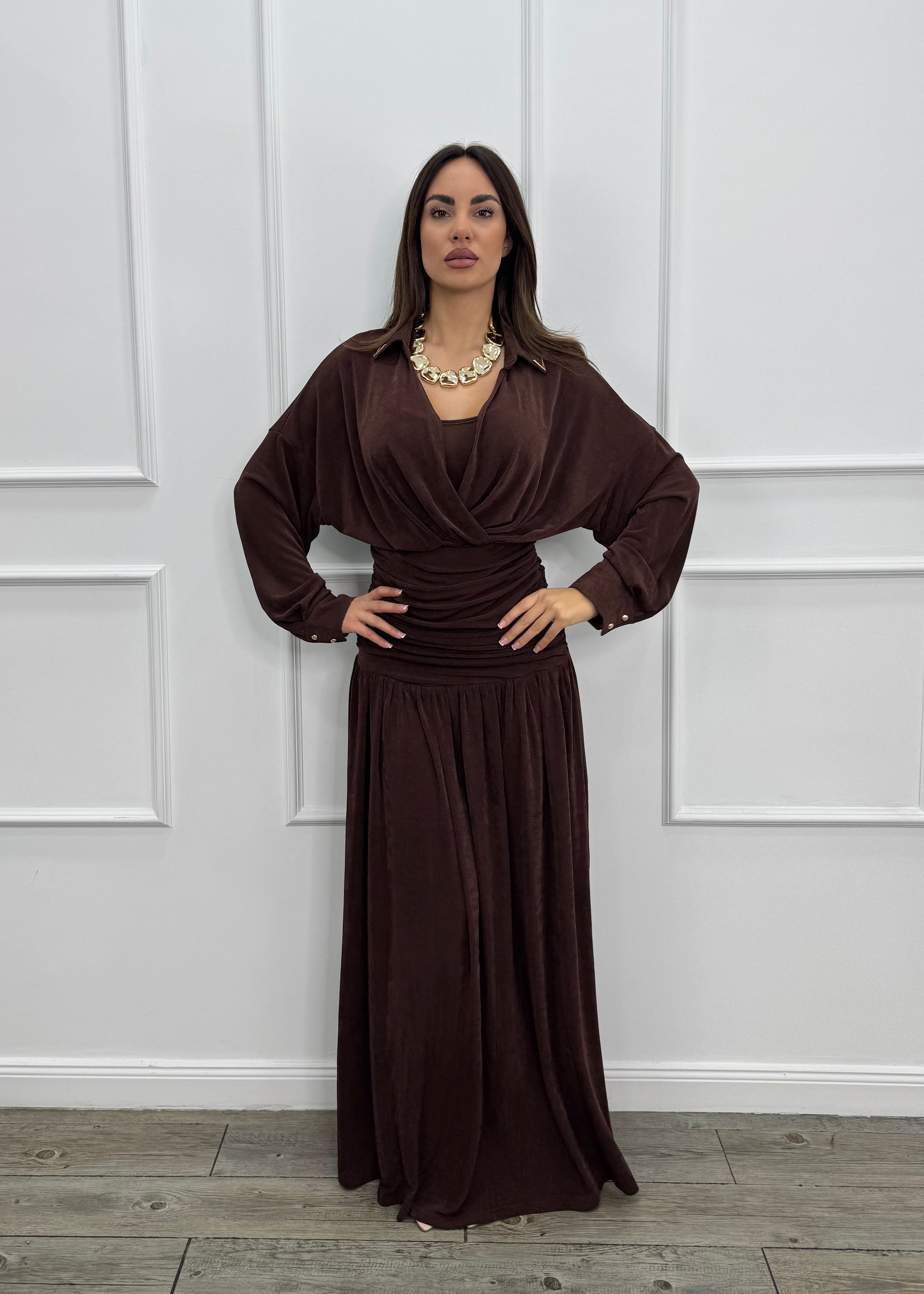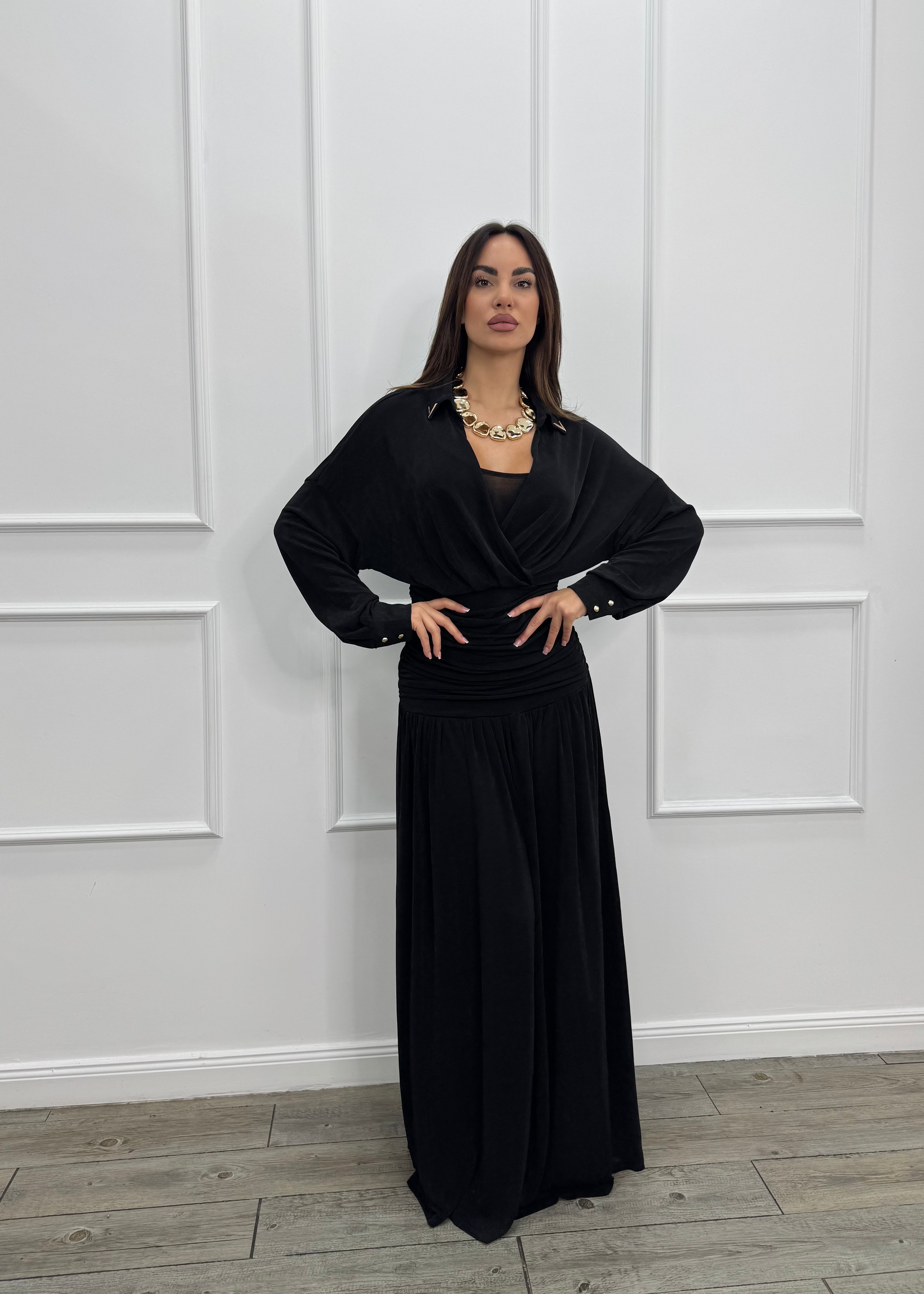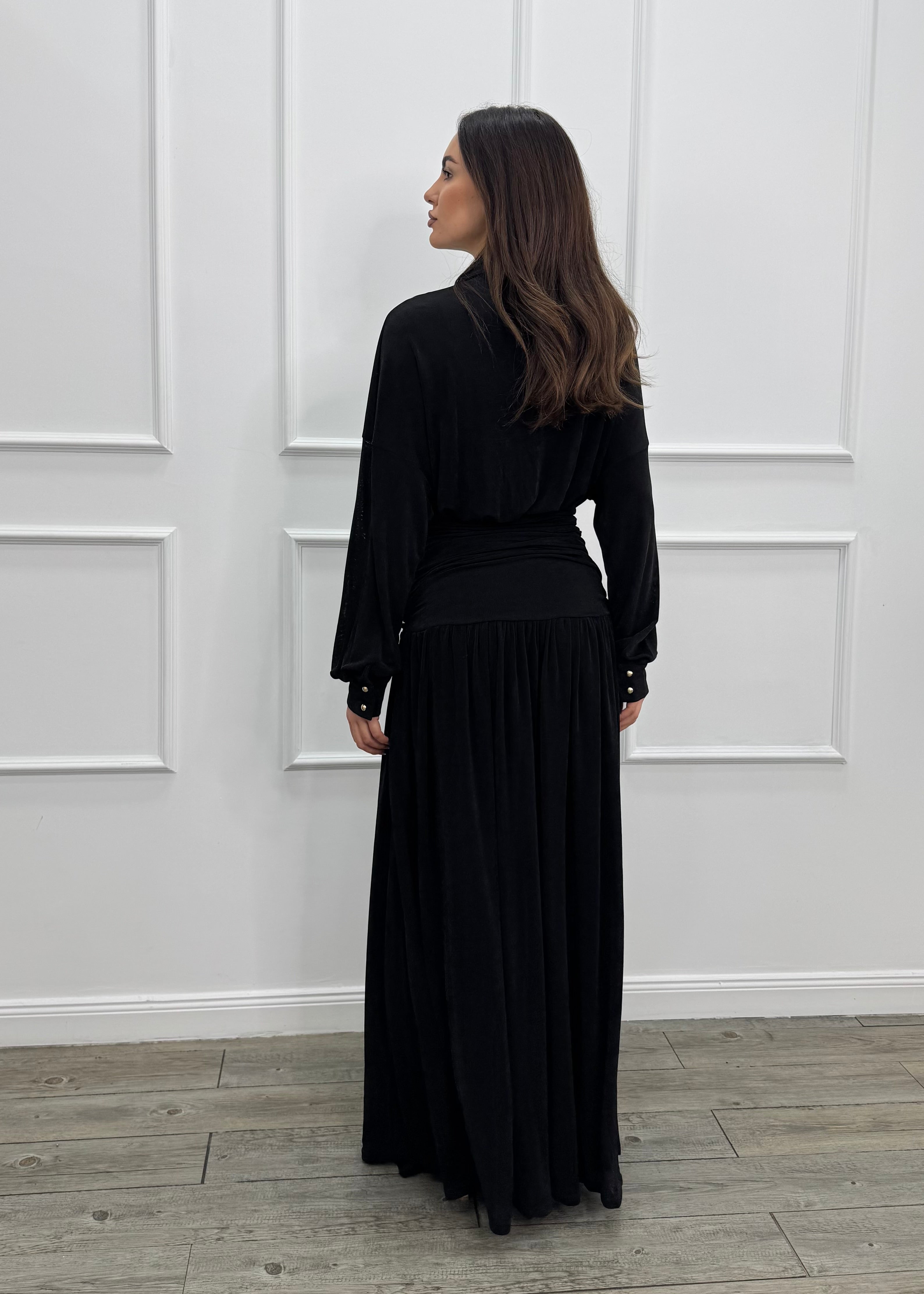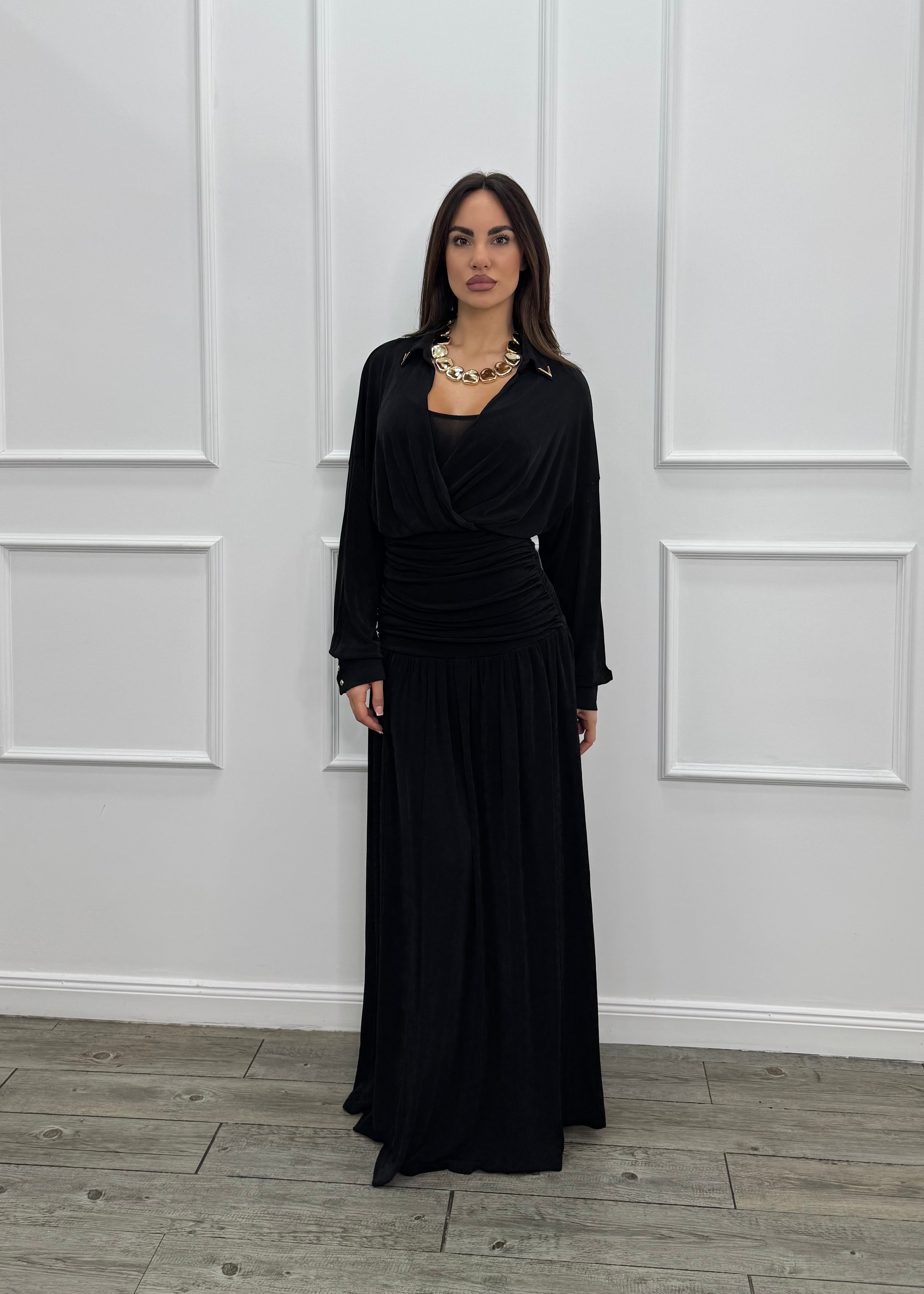 Meraviglioso abito lungo in tessuto elastico, con collo a camicia e gonna morbida .