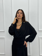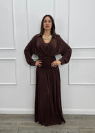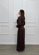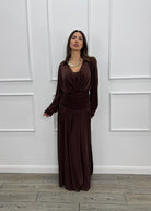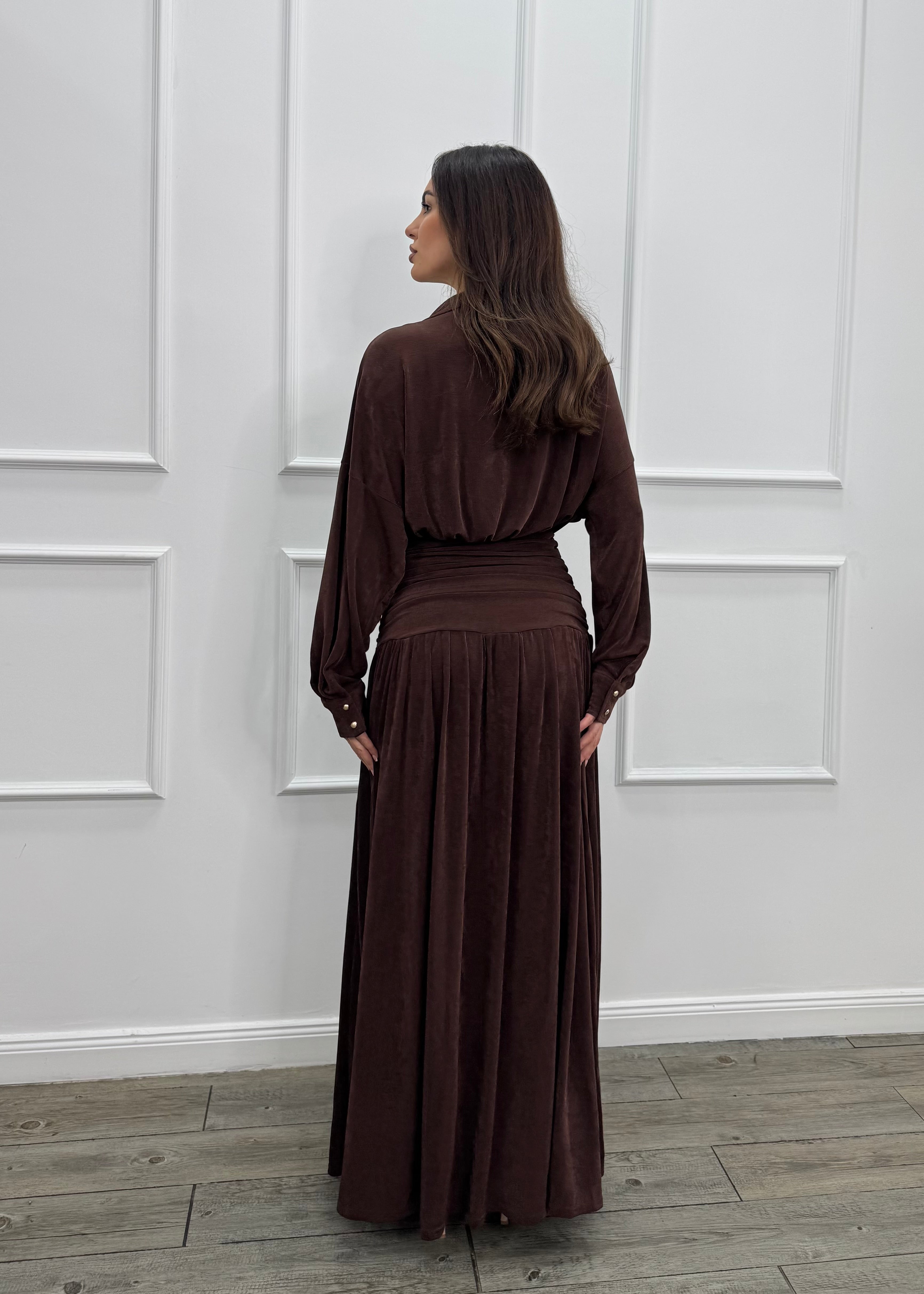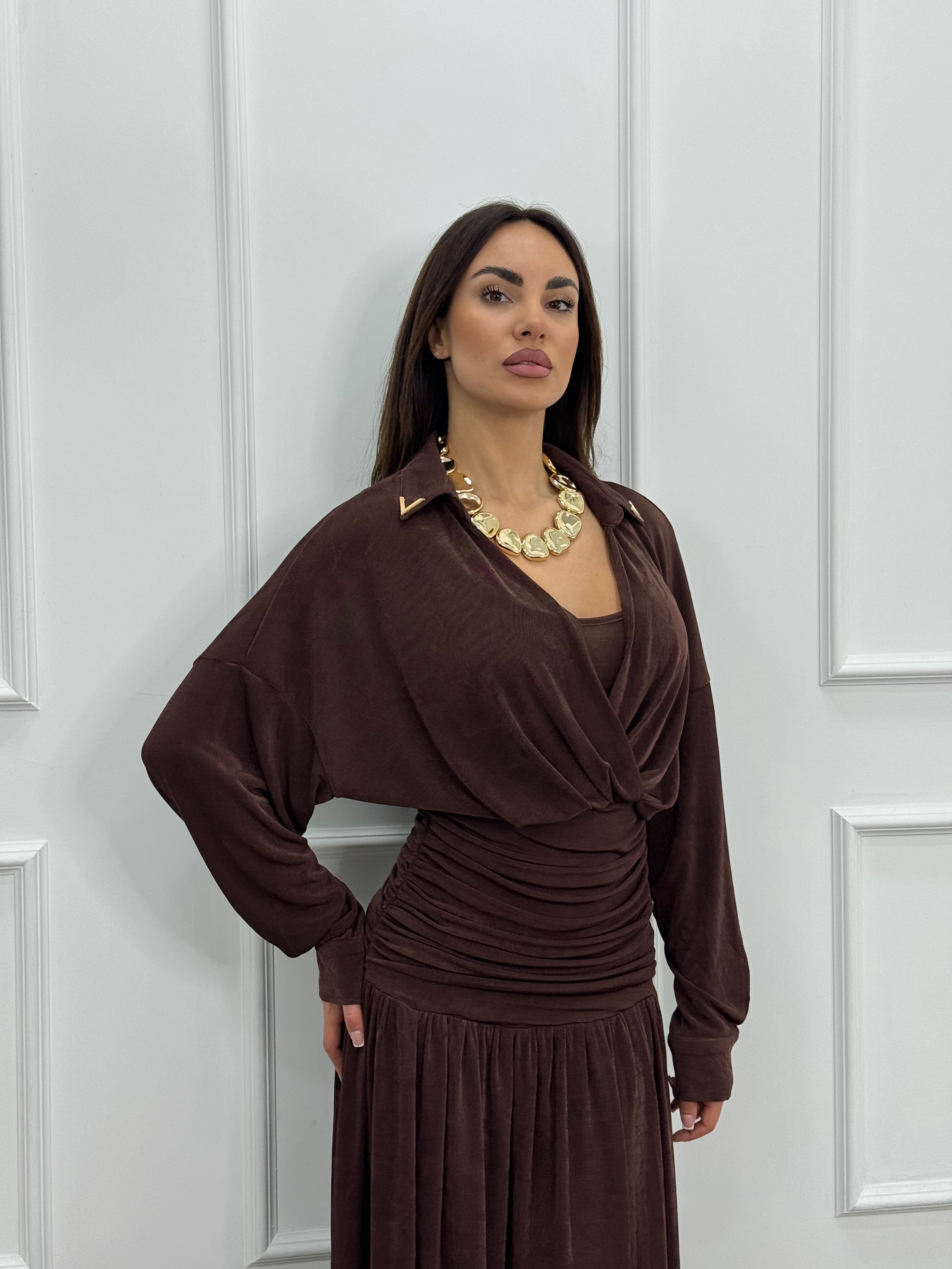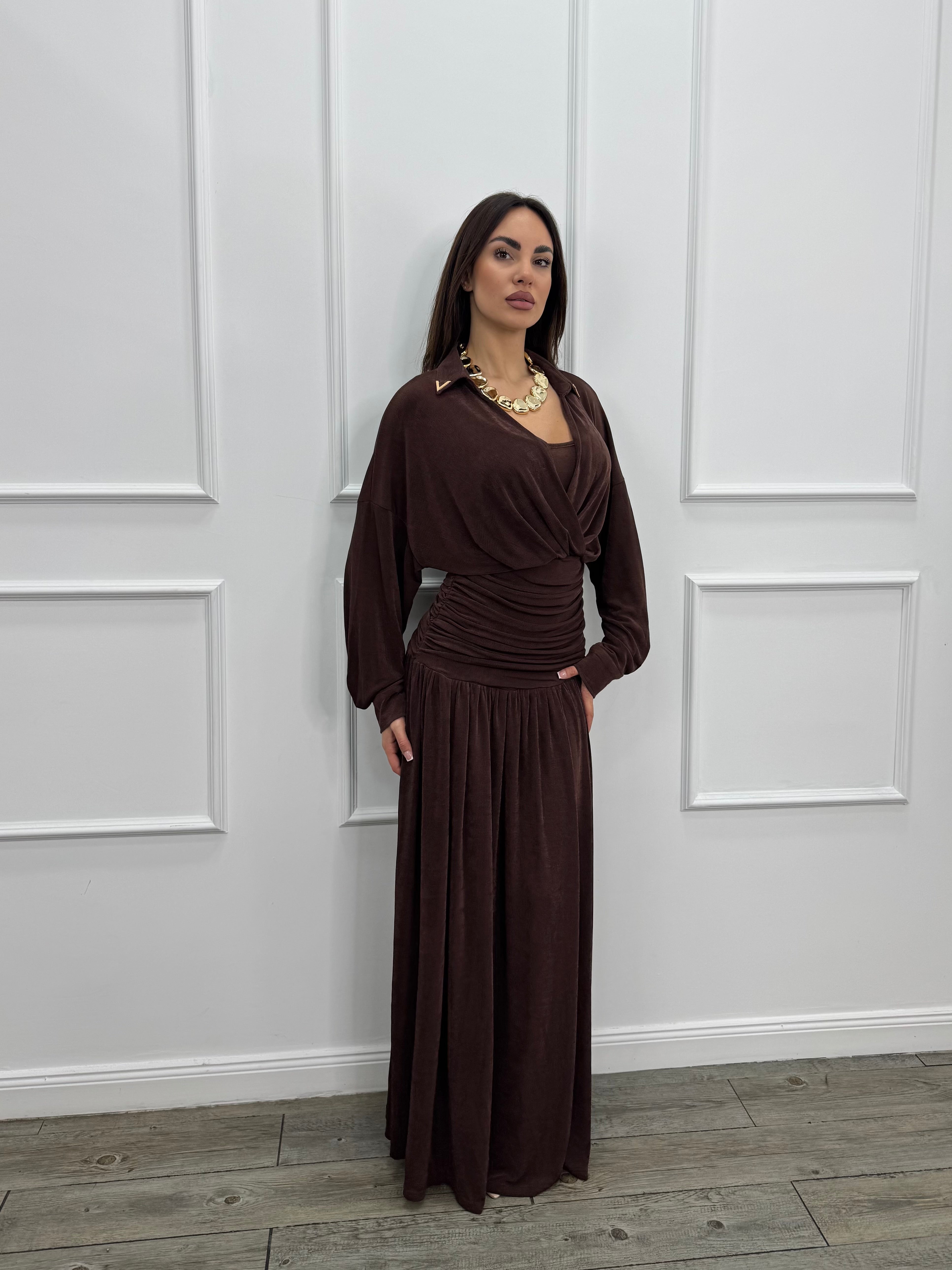 Meraviglioso abito lungo in tessuto elastico, con collo a camicia e gonna morbida .