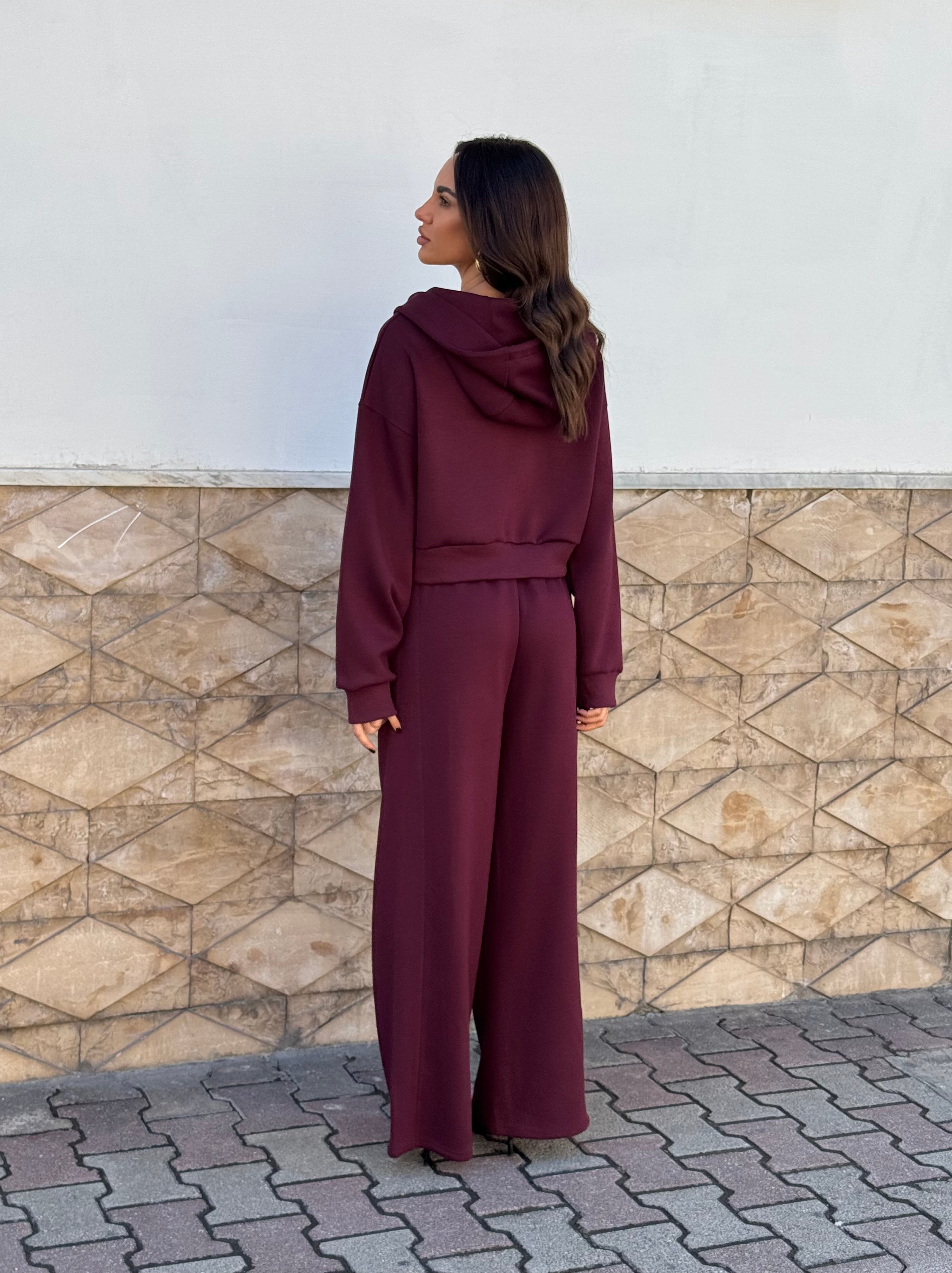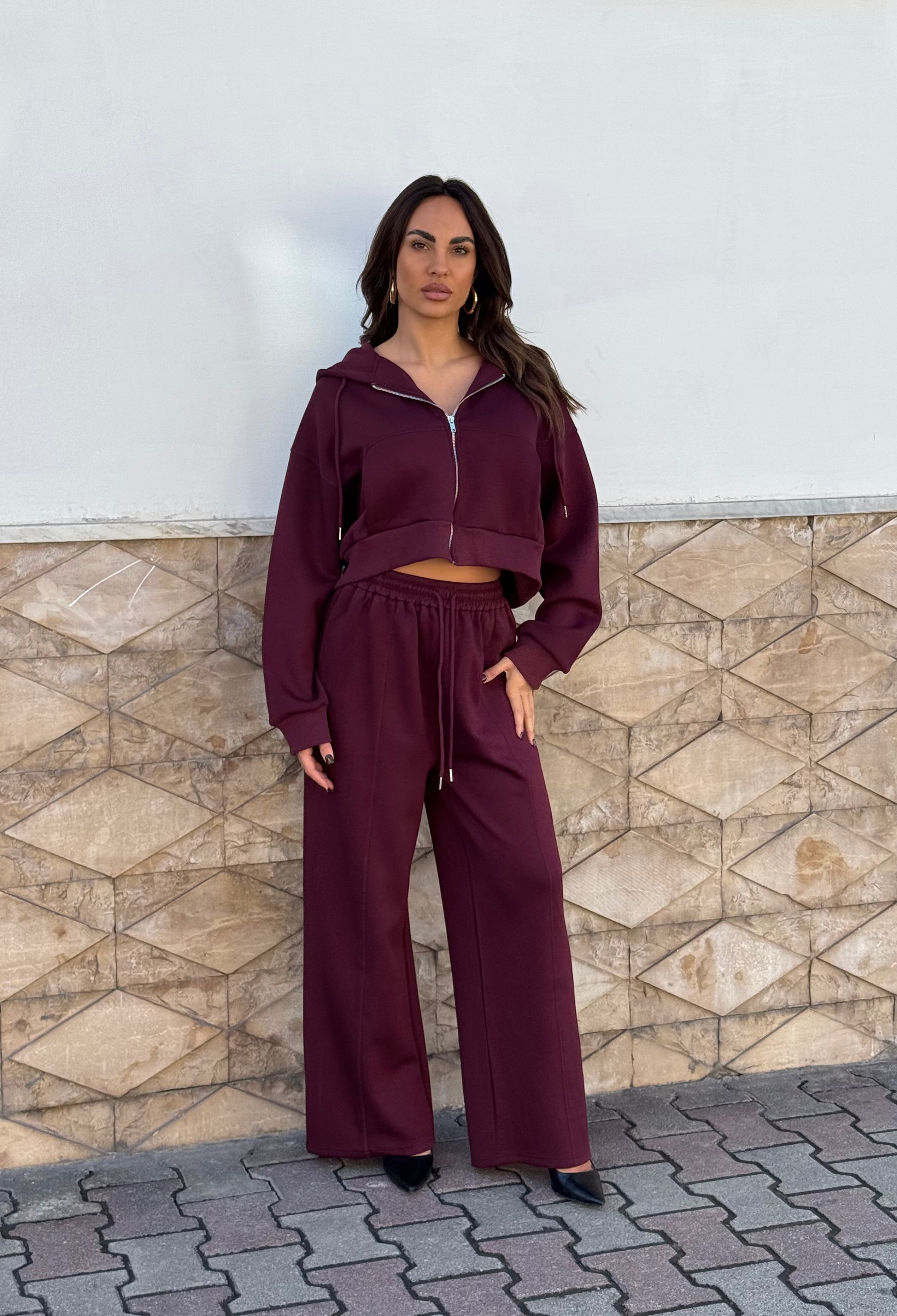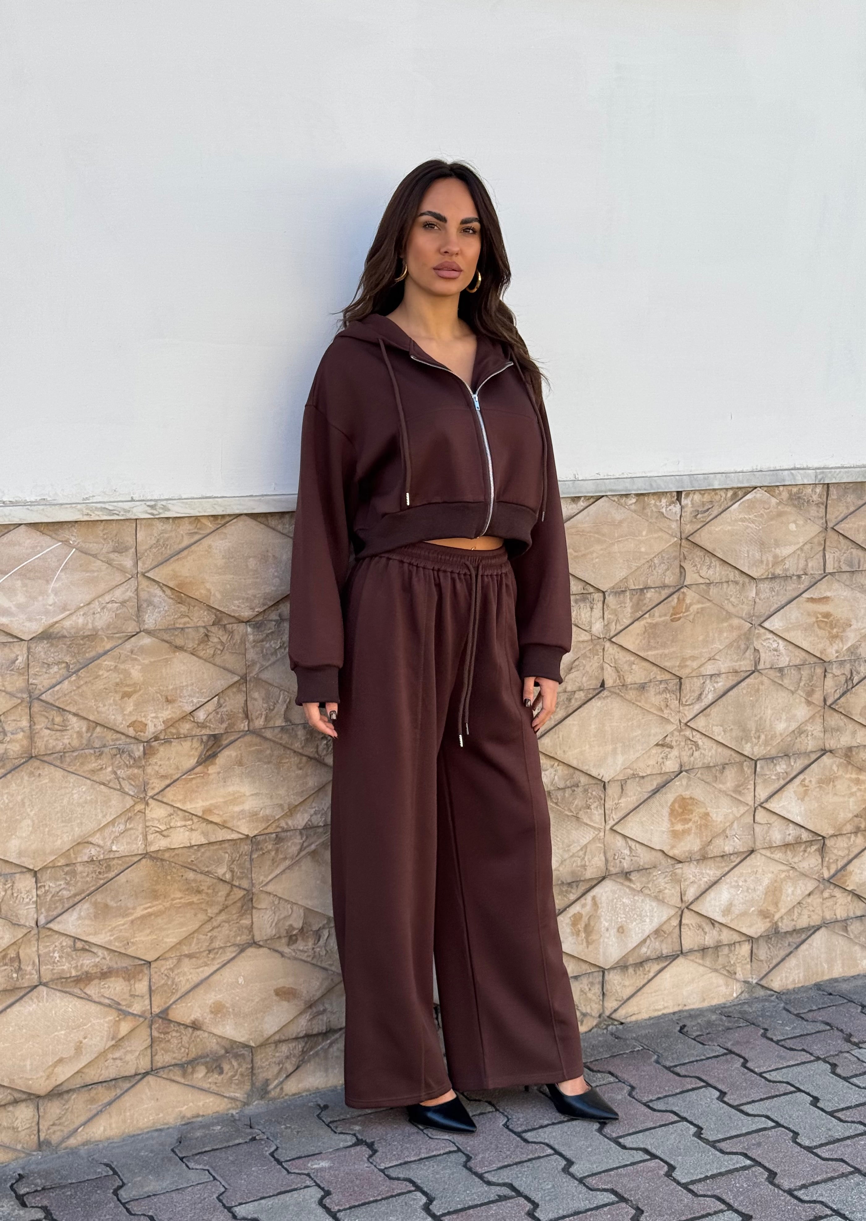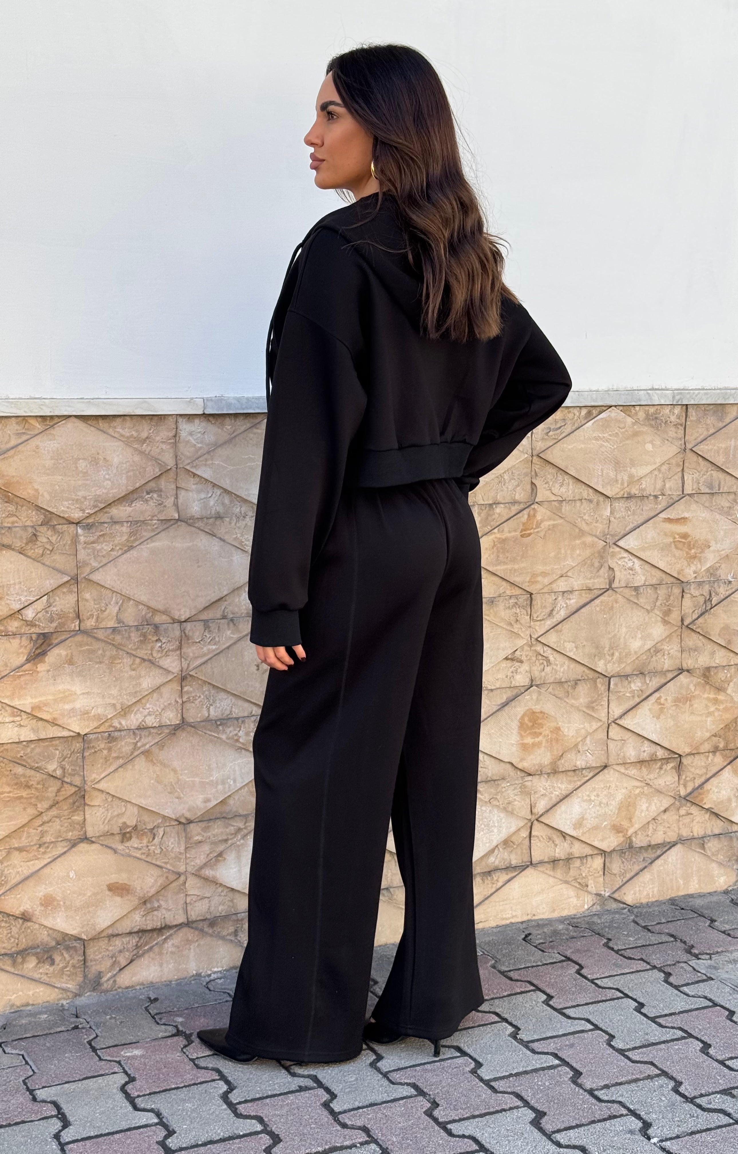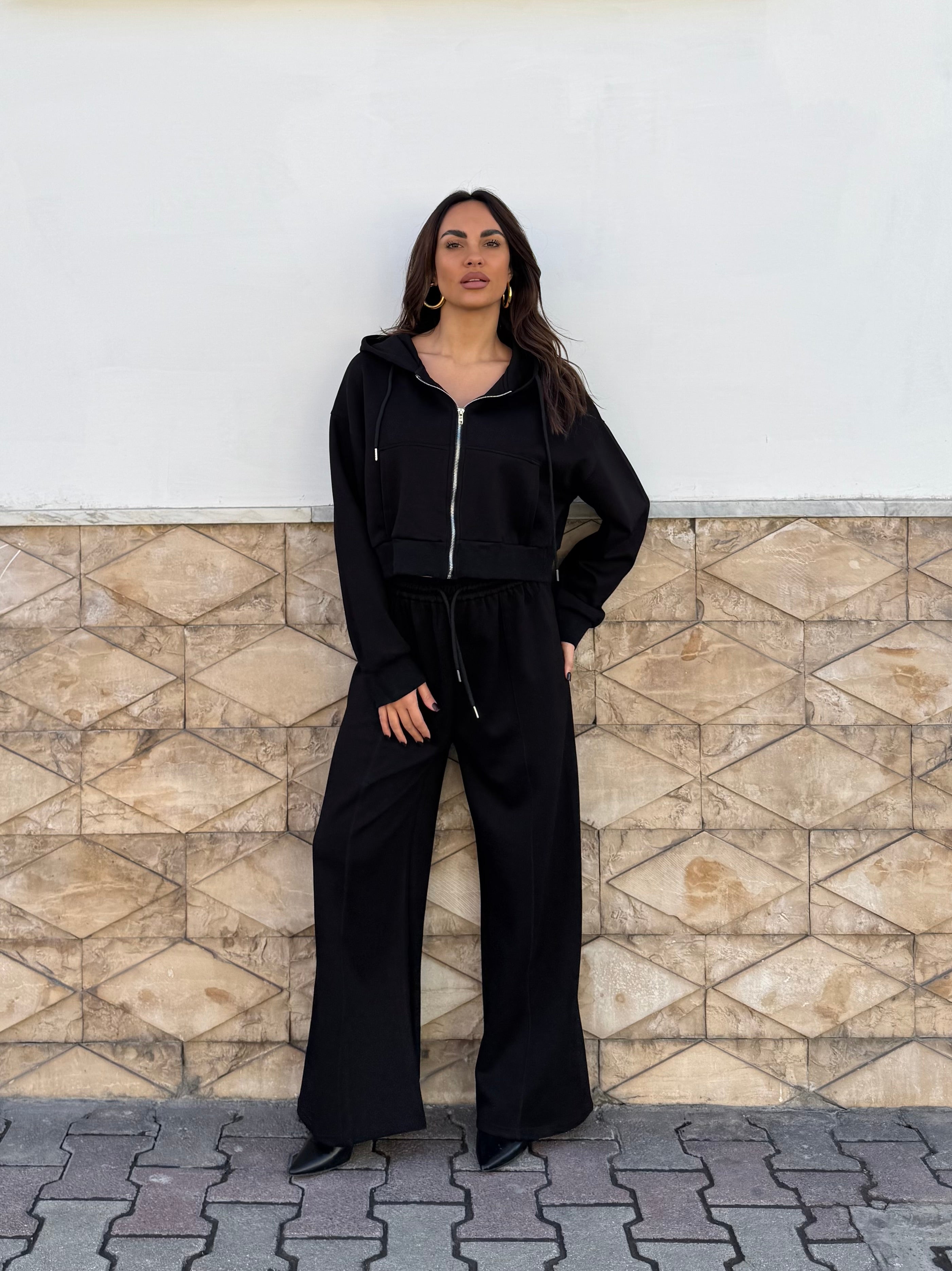 Felpa aperta con cappuccio e pantaloni a a gamba larga con elastico in vita .