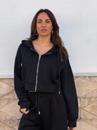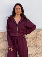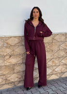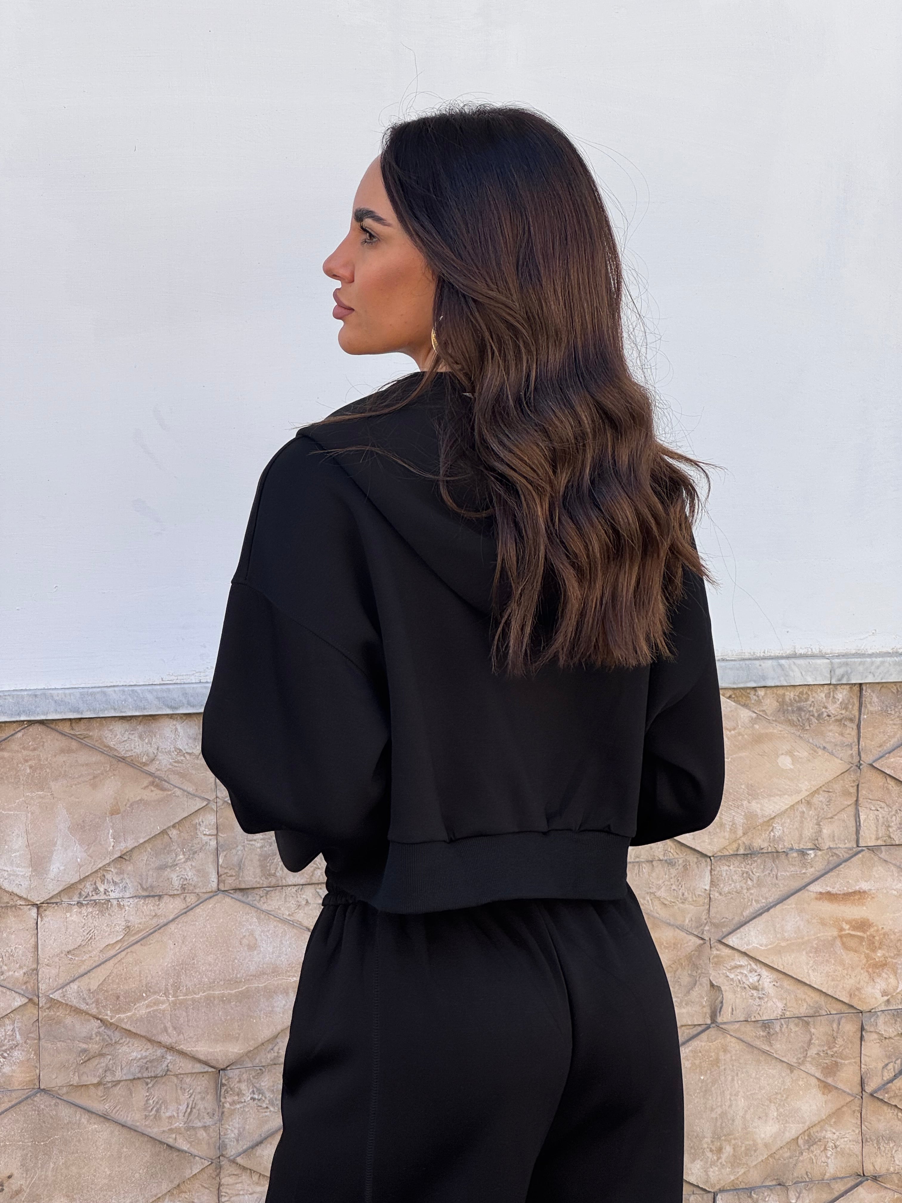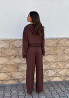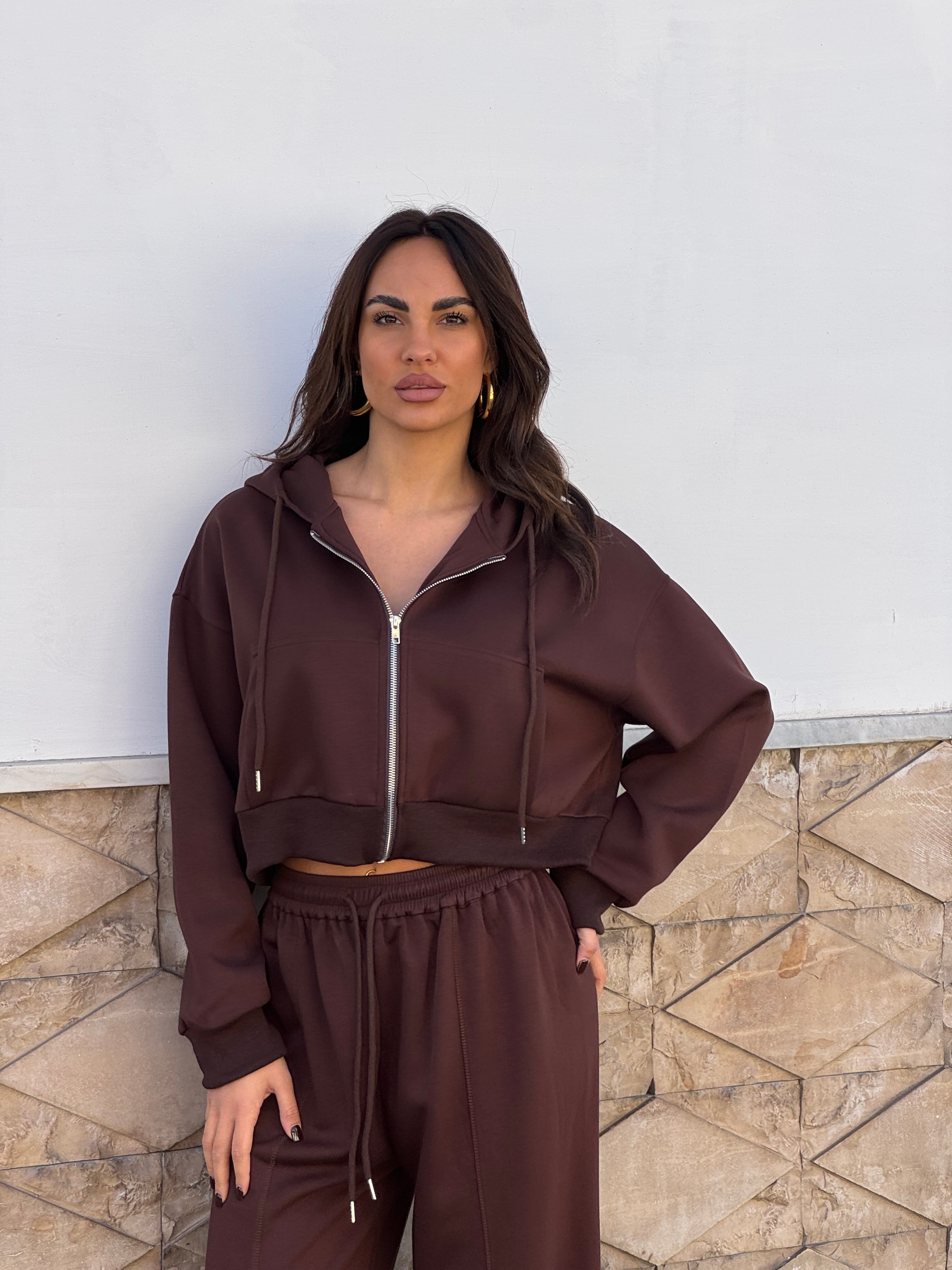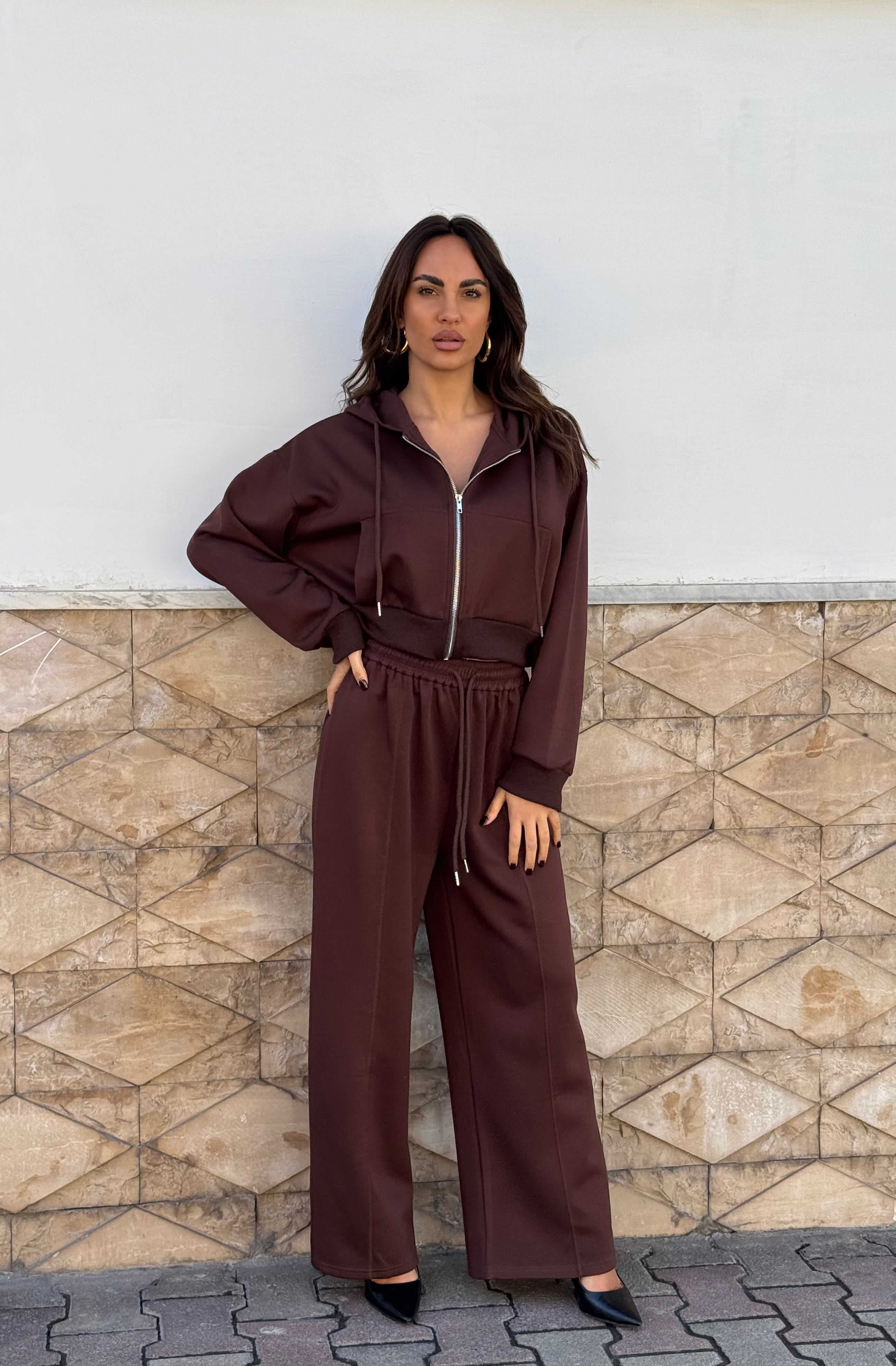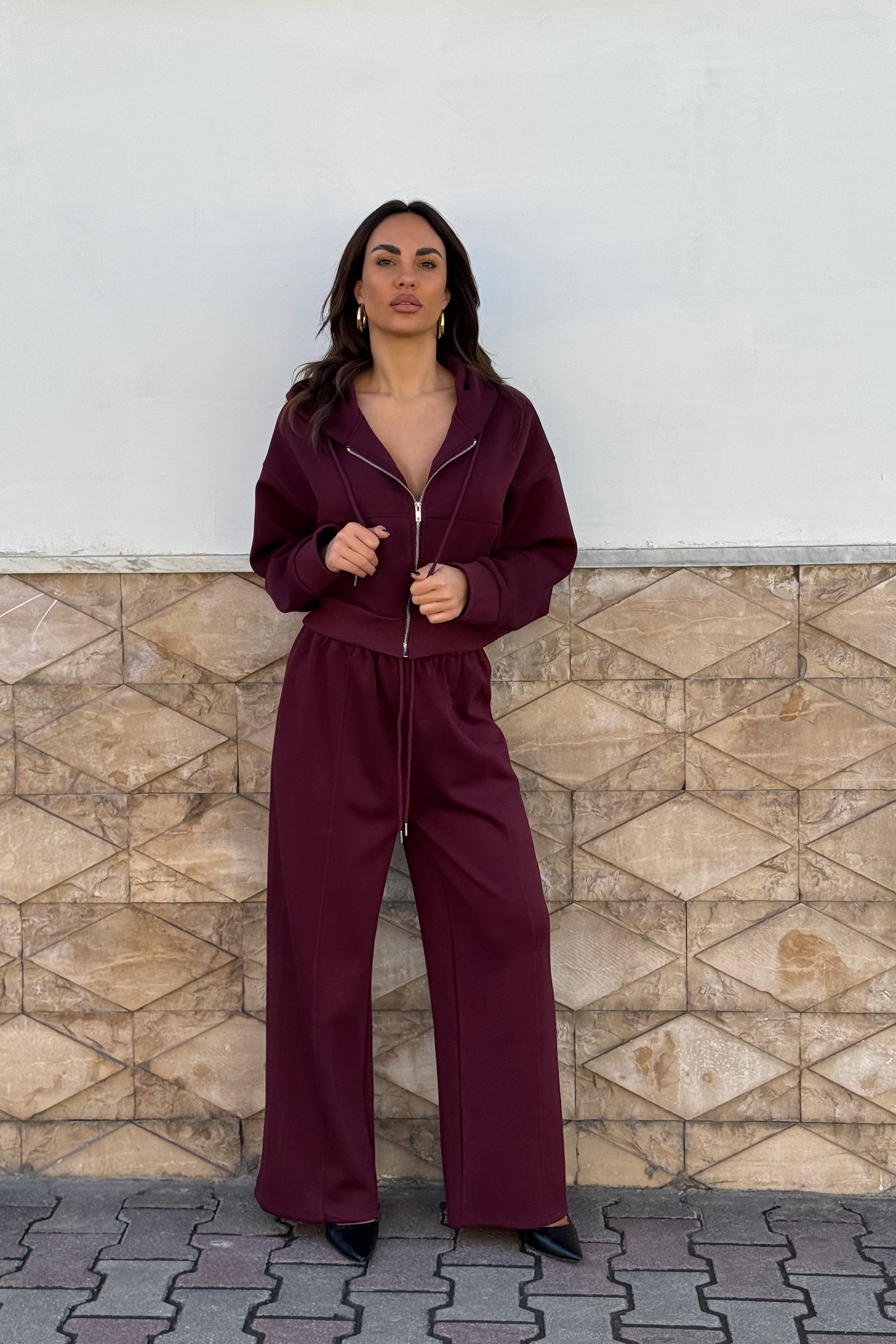 Felpa aperta con cappuccio e pantaloni a a gamba larga con elastico in vita .