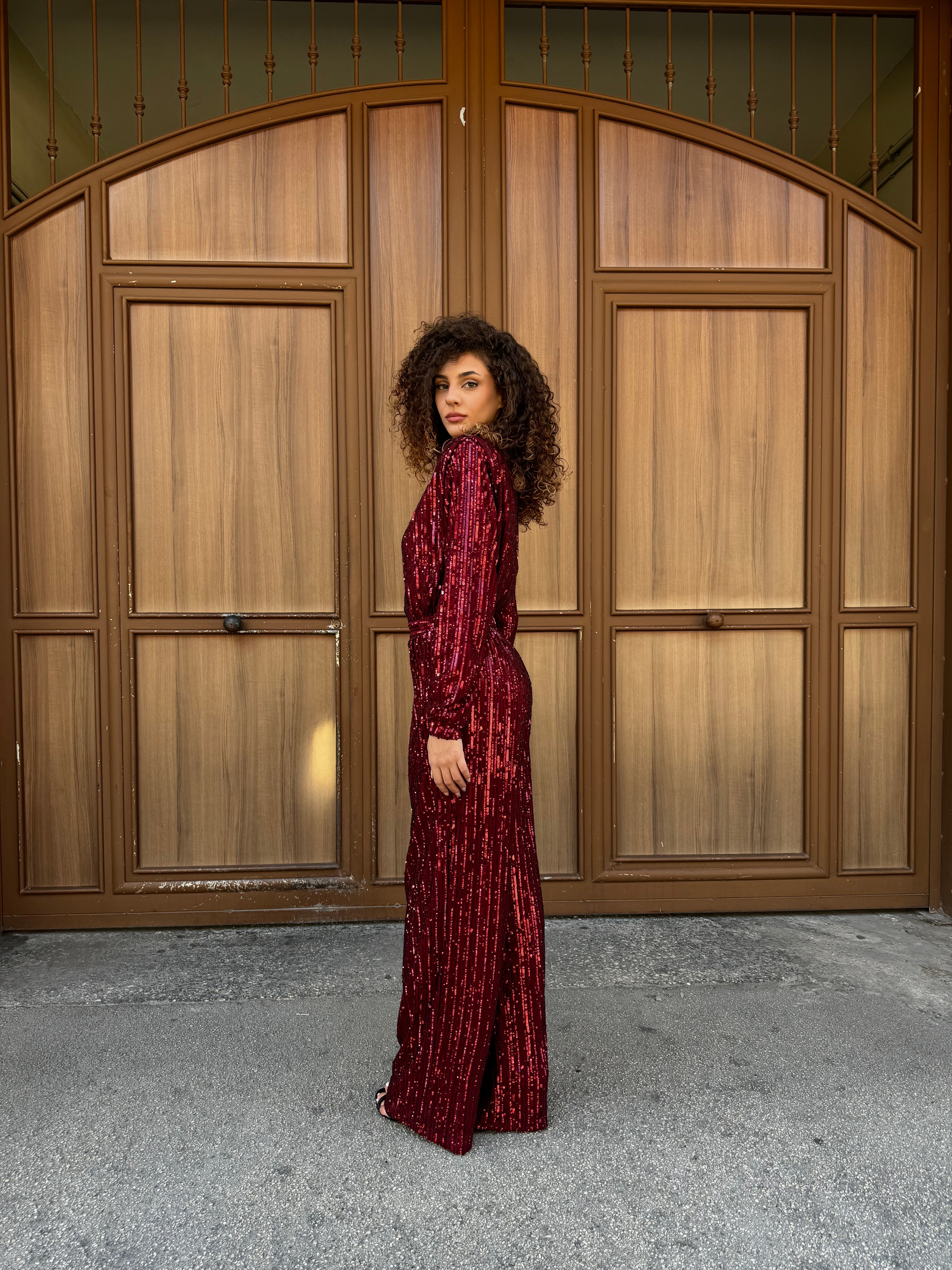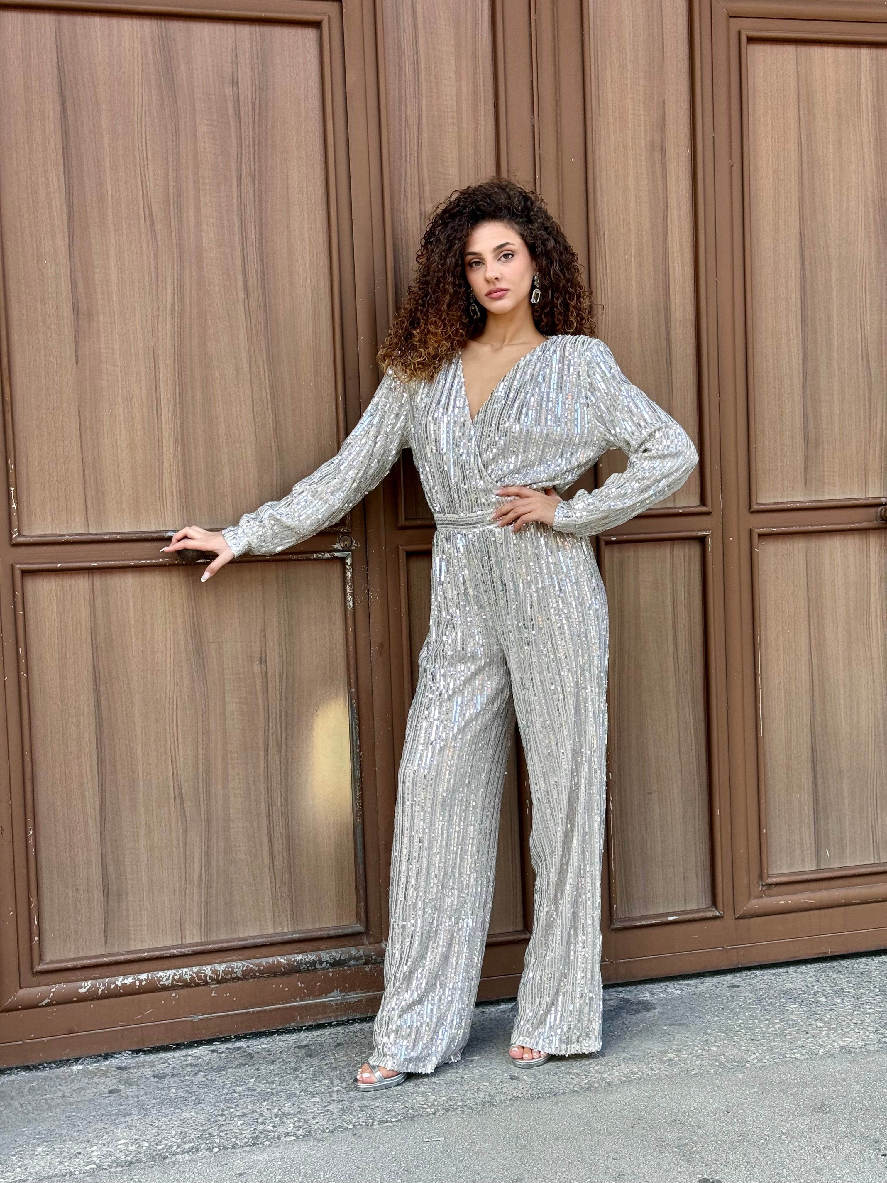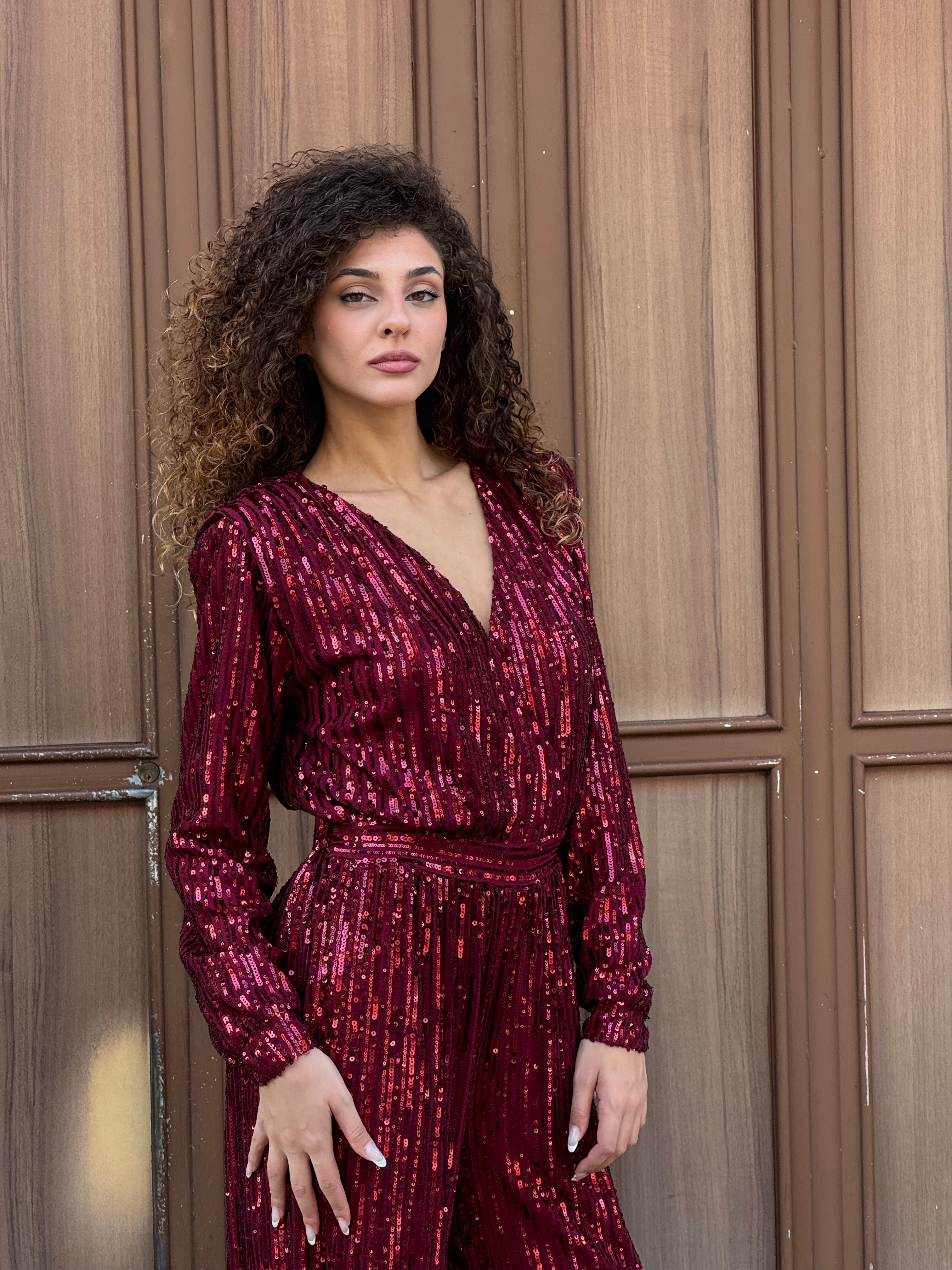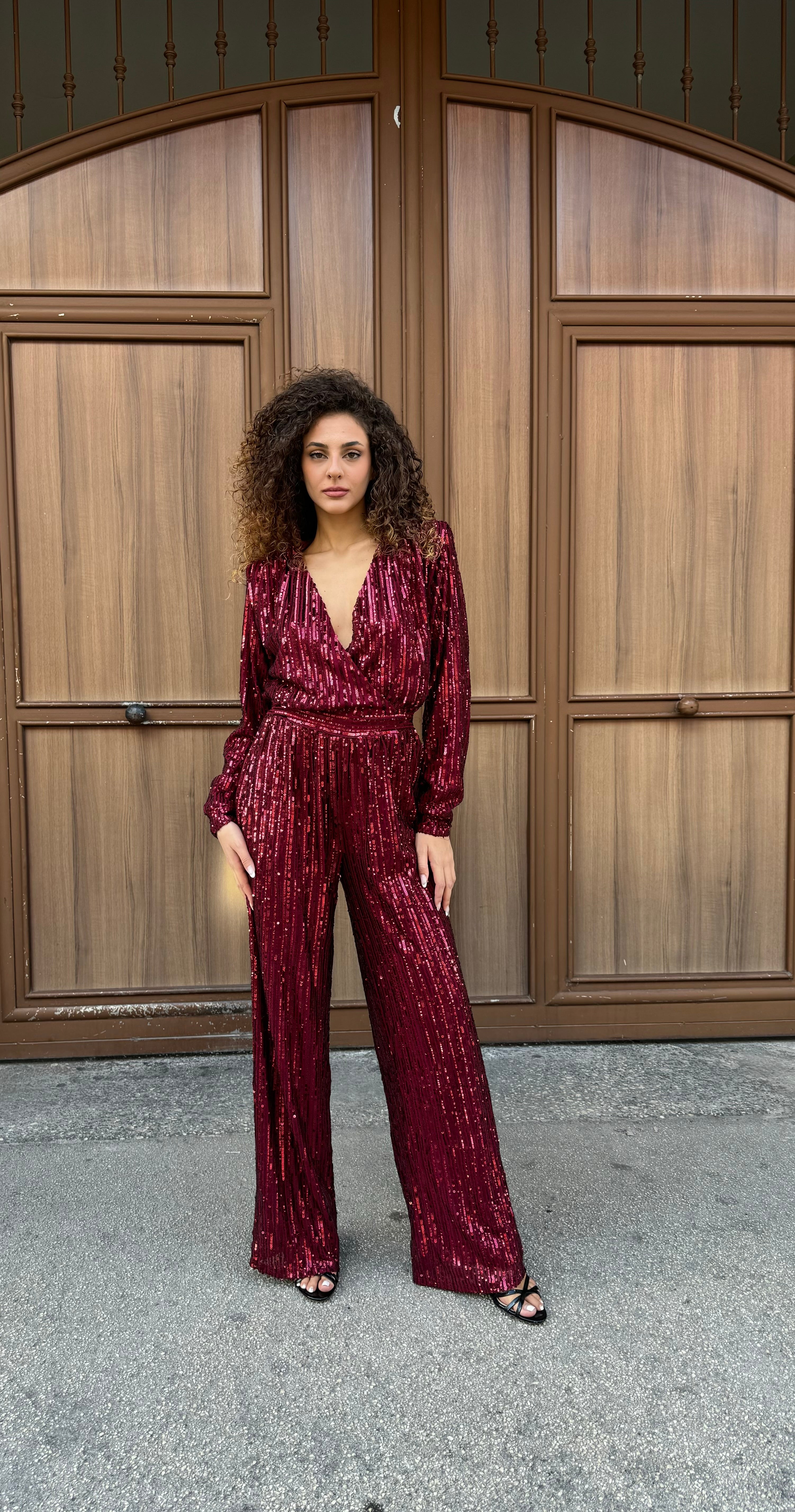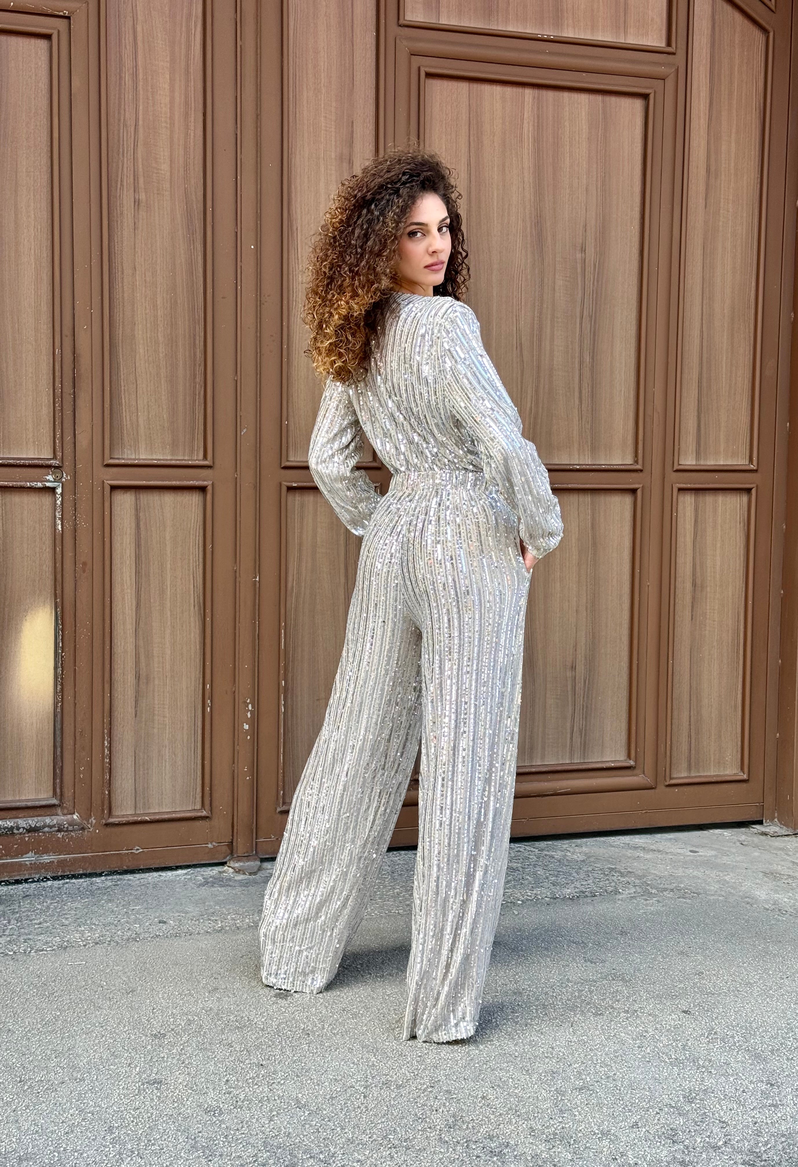 mentre al punto vita un elastico che aggiunge confort a questo capo raffinato che scende con un pantalone a gamba larga