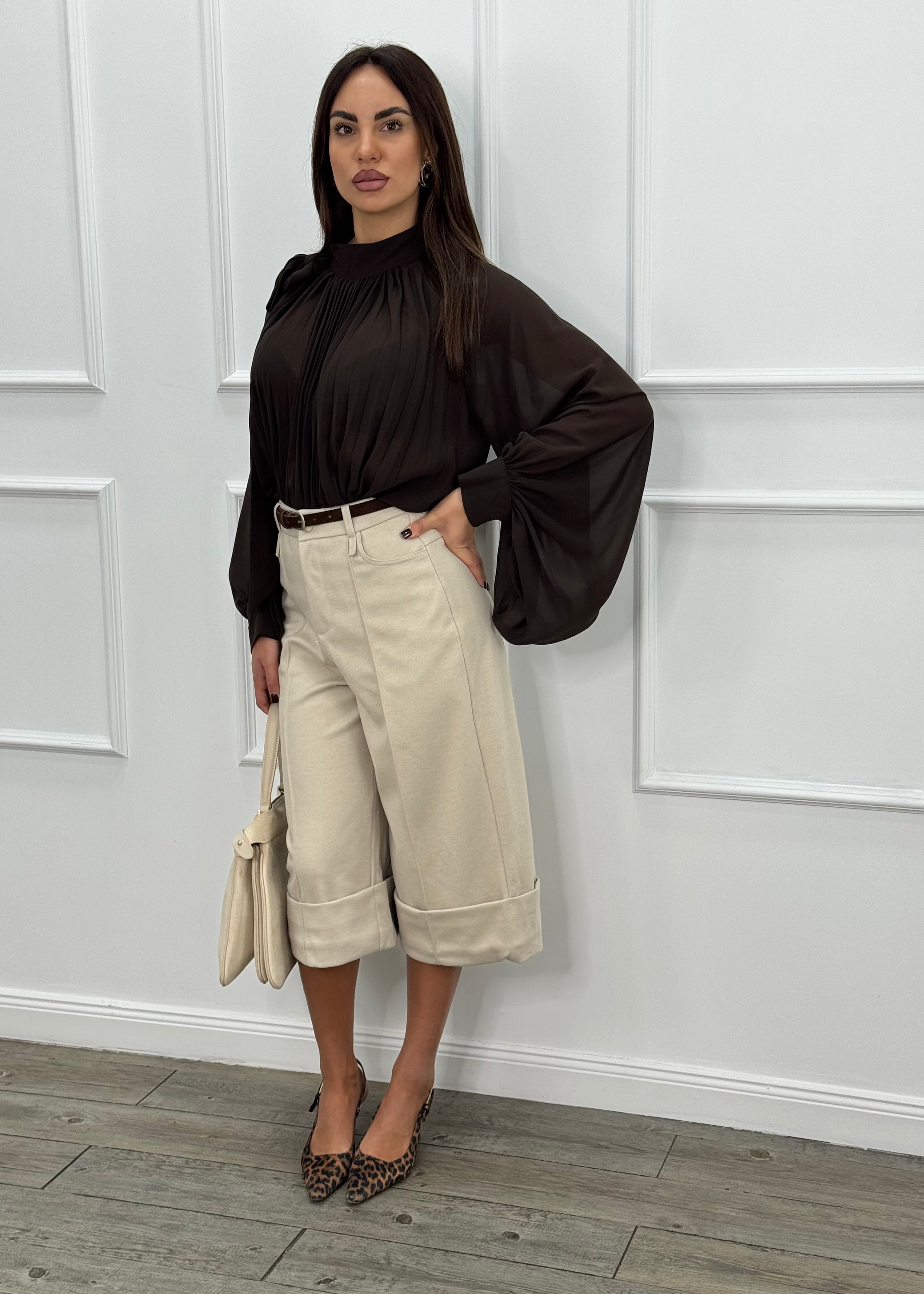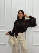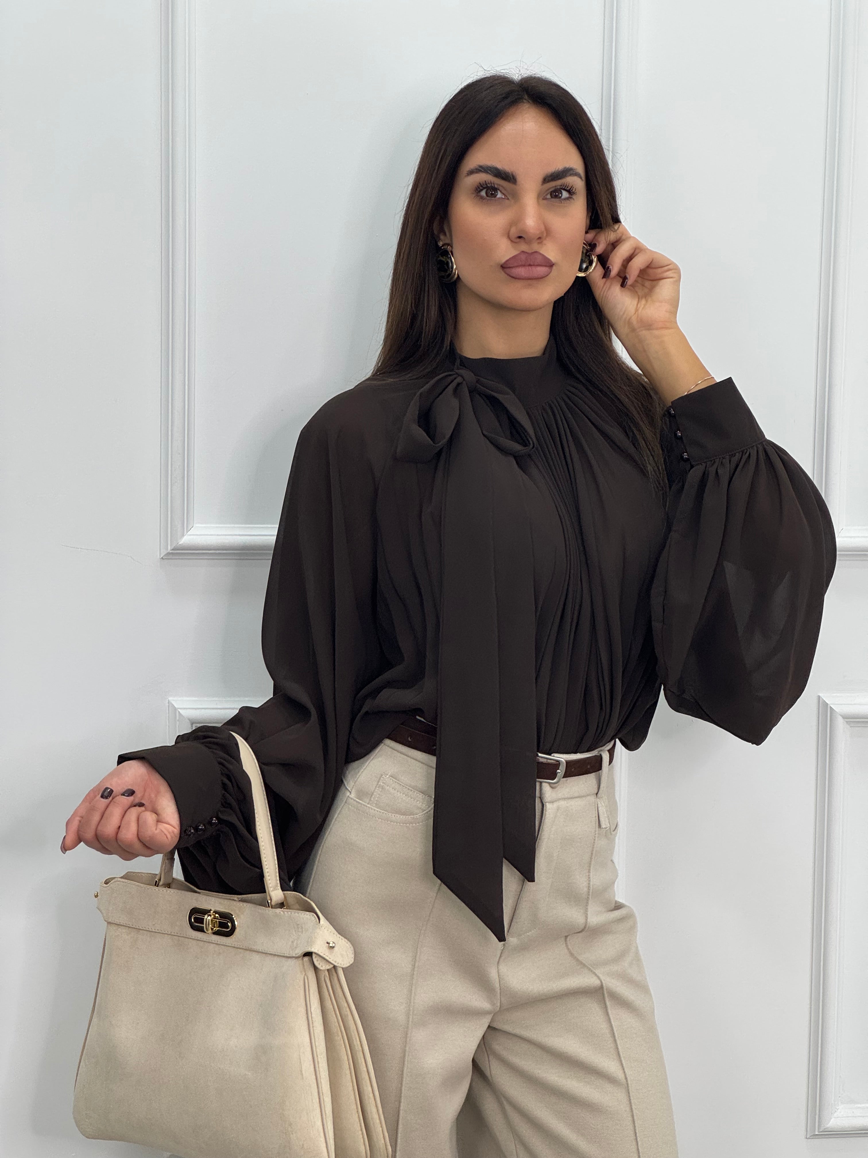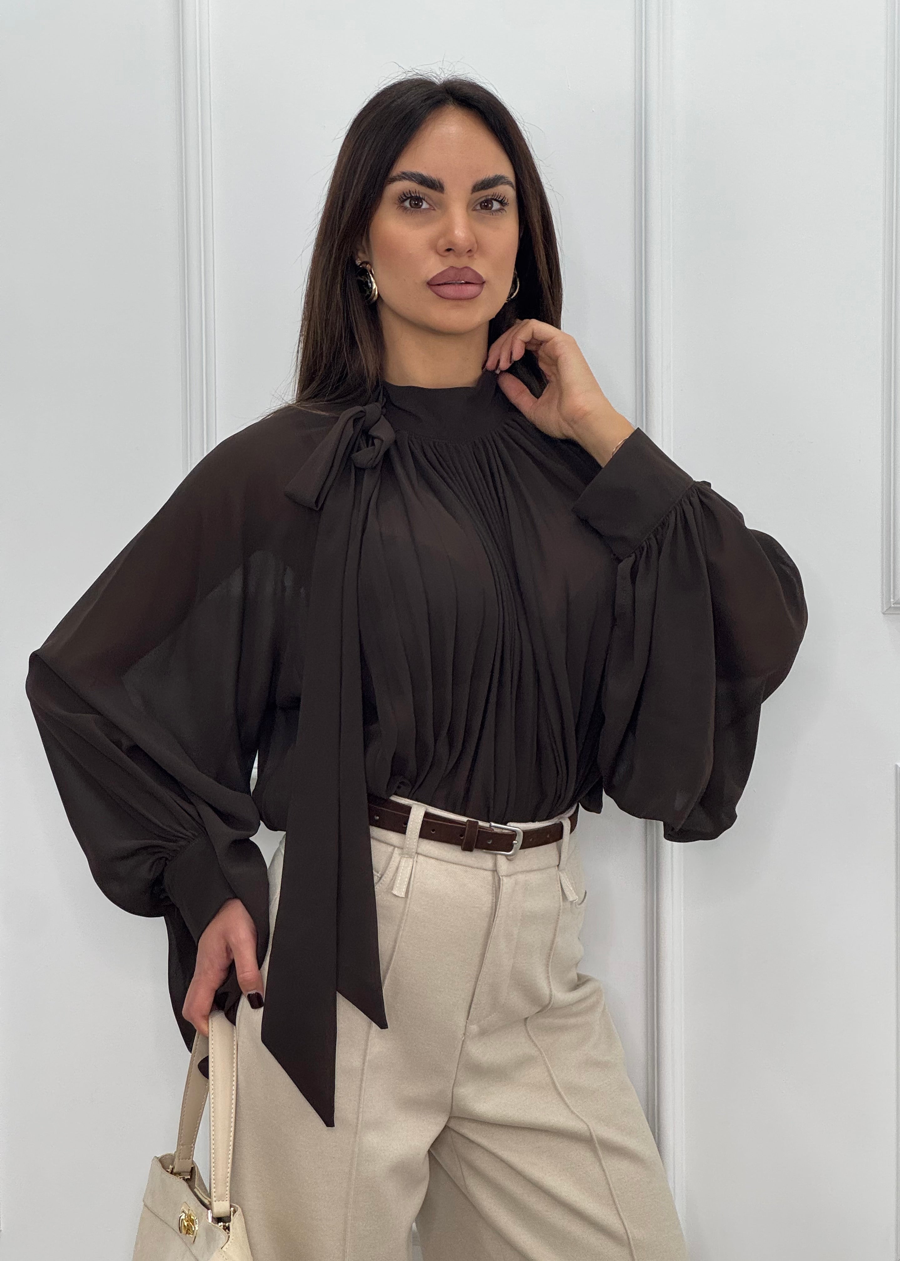 Meravigliosa camicia in georgette con Fiocco chic al collo e dettagli plissettati.