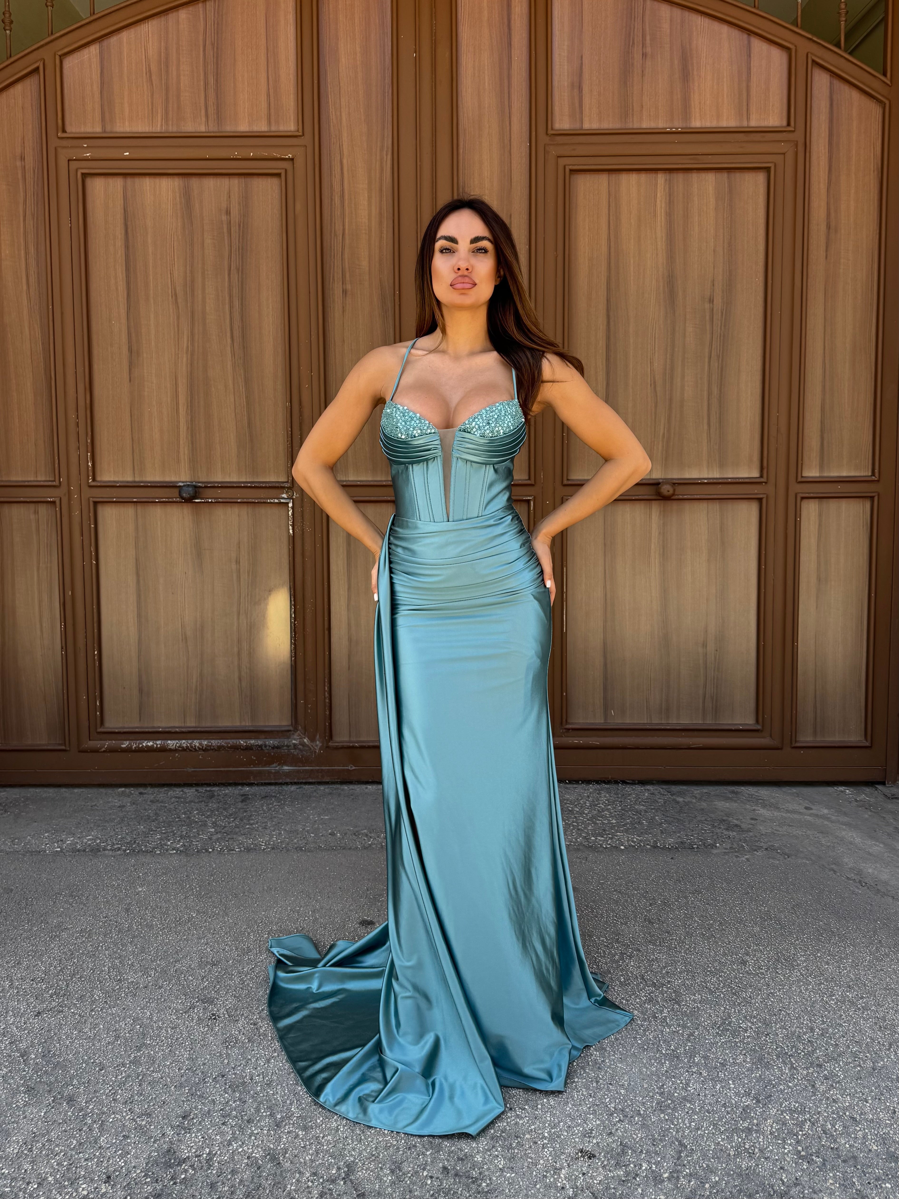 Abito lungo a sirena con scollo a cuore che accentua il dècolletè in modo sensuale, il bustino steccato accentua la femminilità di quest' abito, mentre la gonna in raso con drappeggi su lato si apre in uno spacco con aggiunta di una raffinata fusciacca.