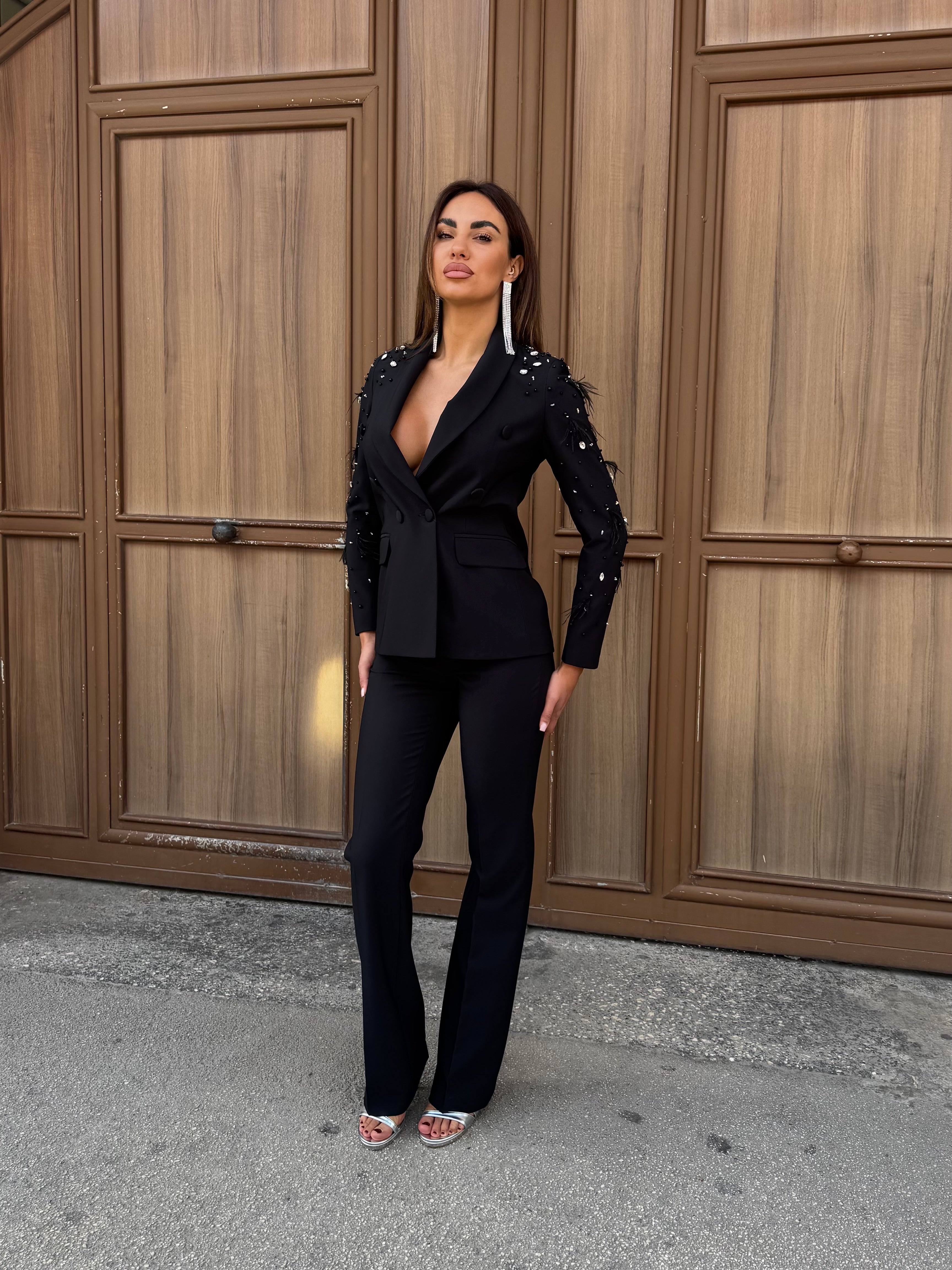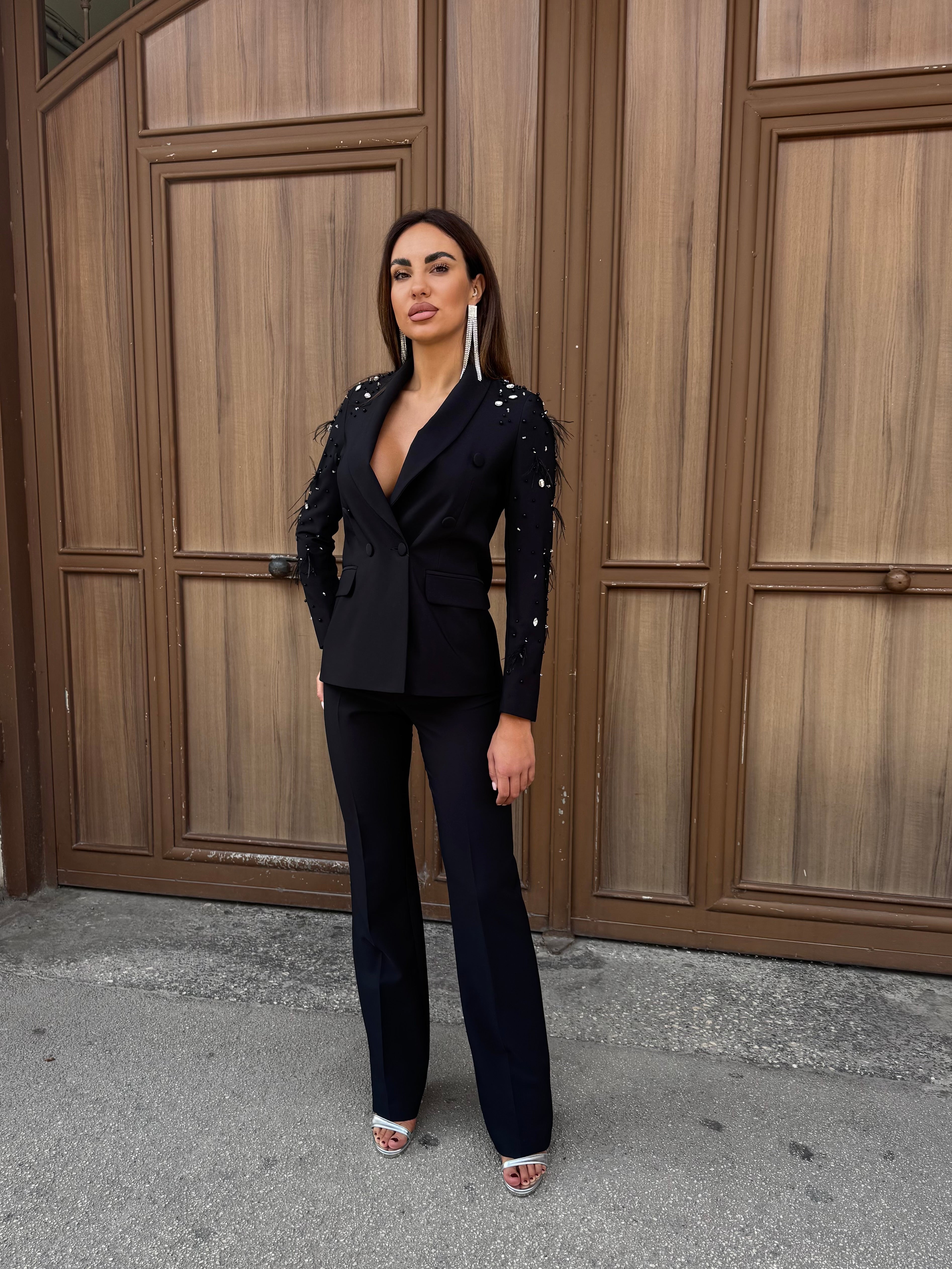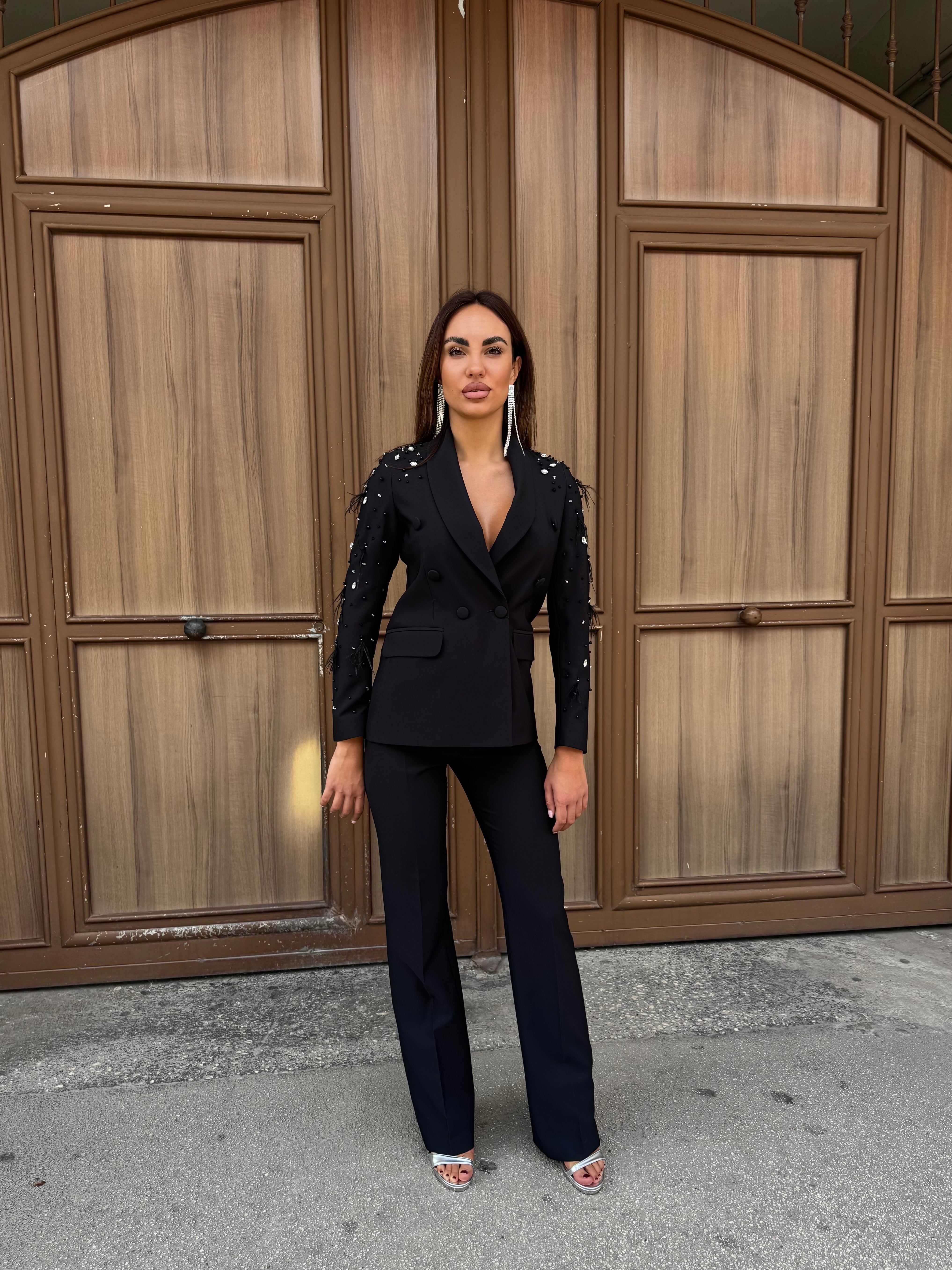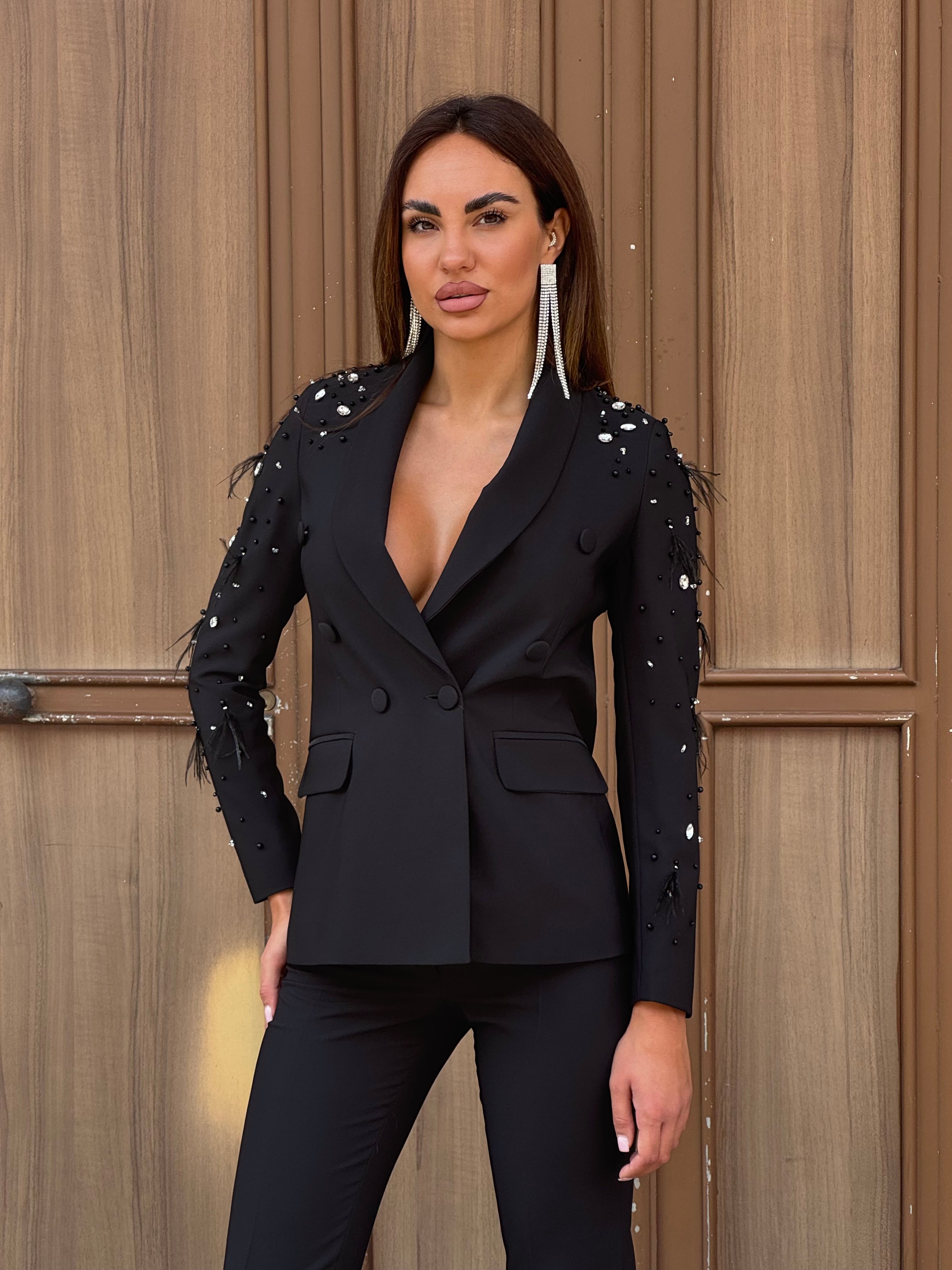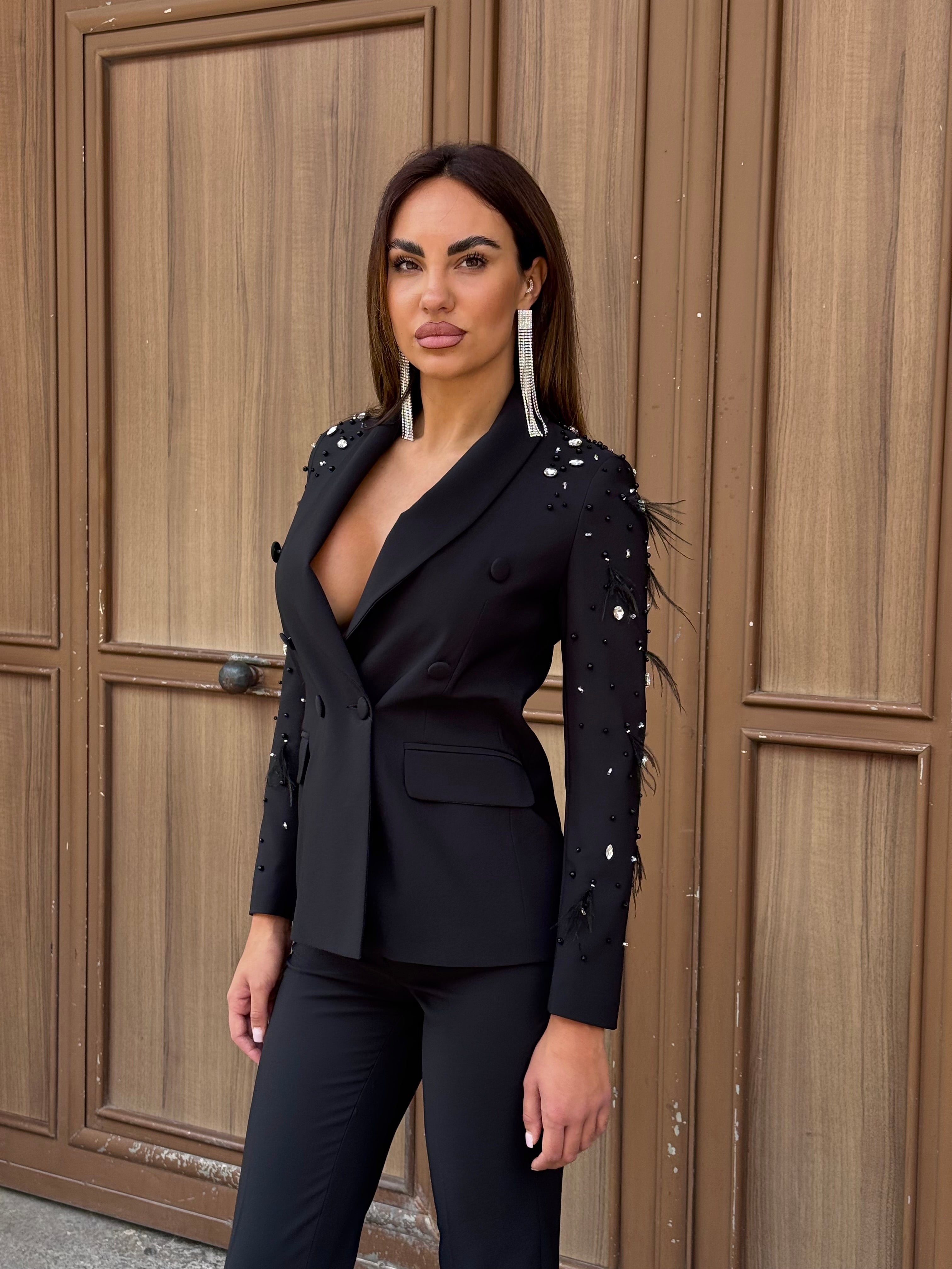 Meraviglioso tailleur composto da giacca a doppiopetto con applicazioni a mano in micro perline, swarovski e delicate piume .Curato nei minimi dettagli.