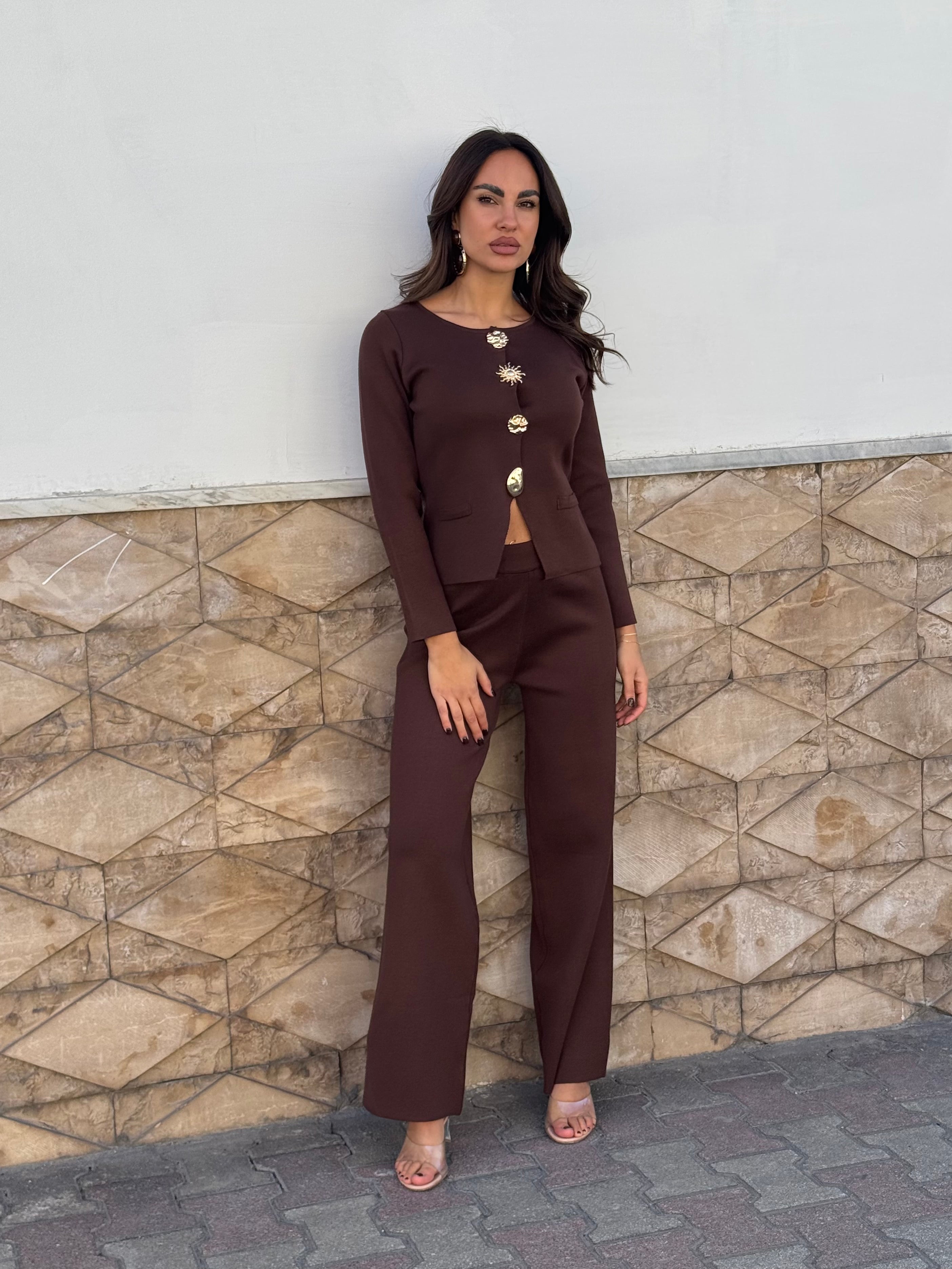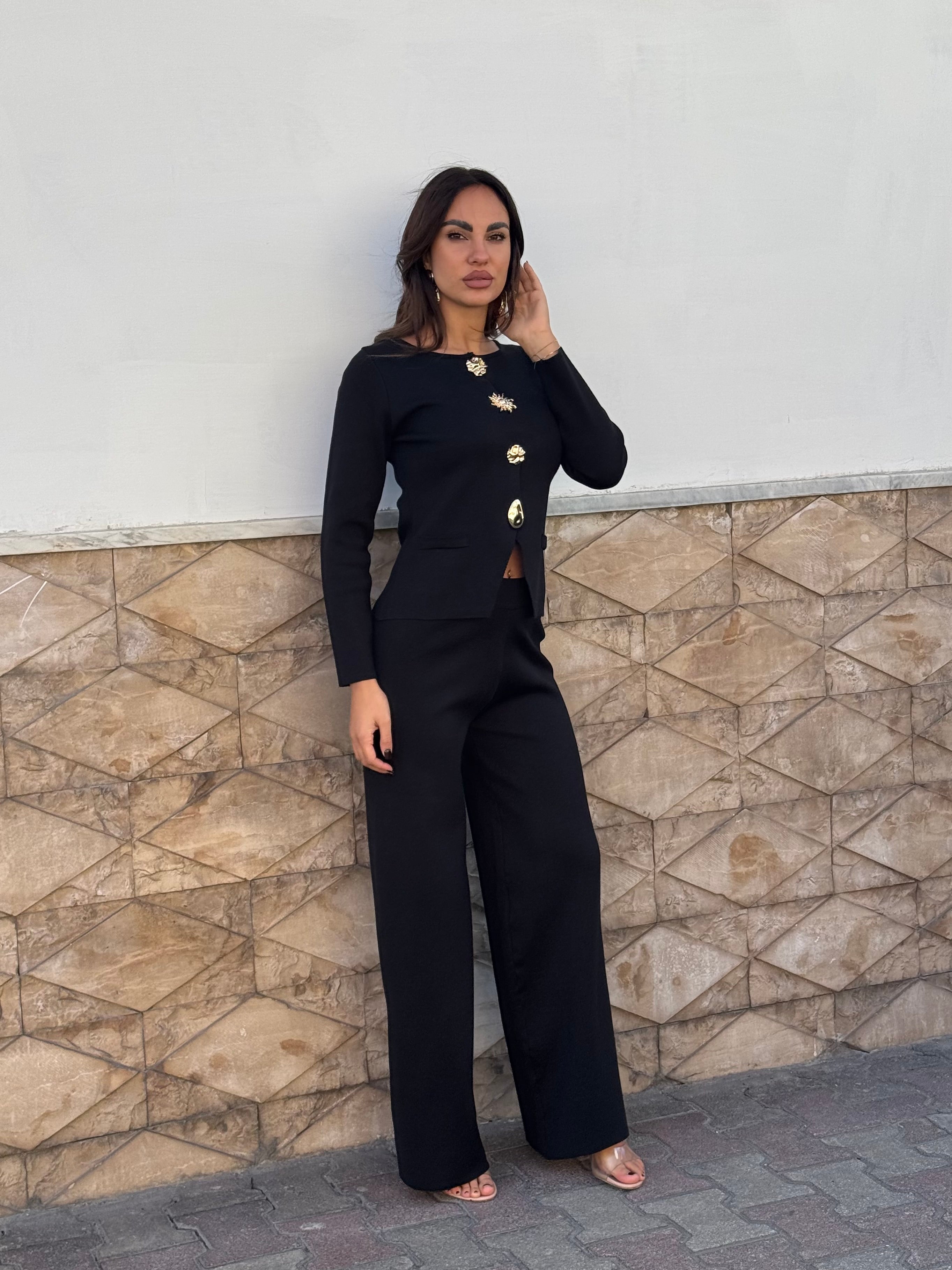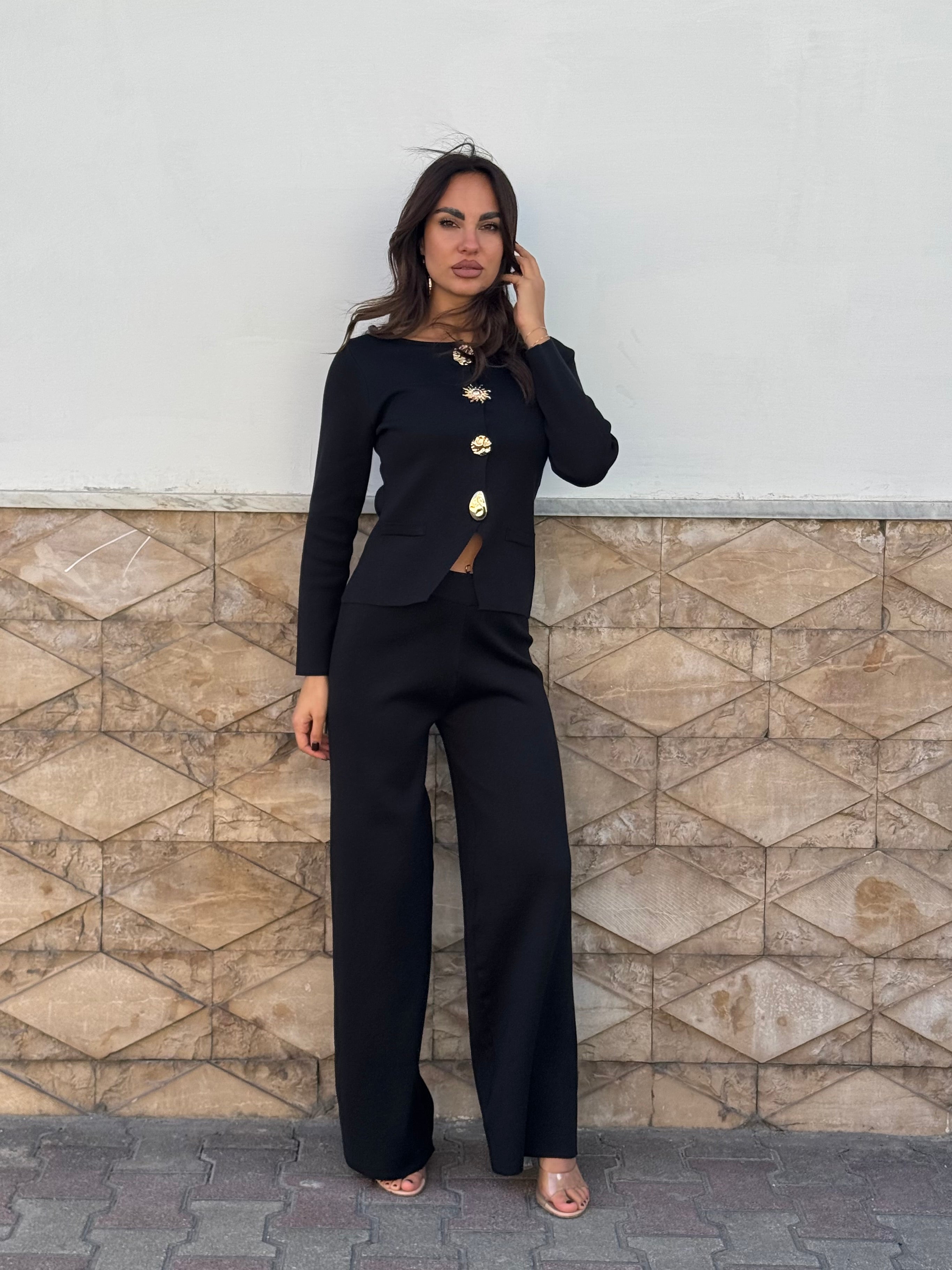 Coordinato in filo composto da cardigan con chiusura frontale in bottoni gold e pantaloni a gamba larga.