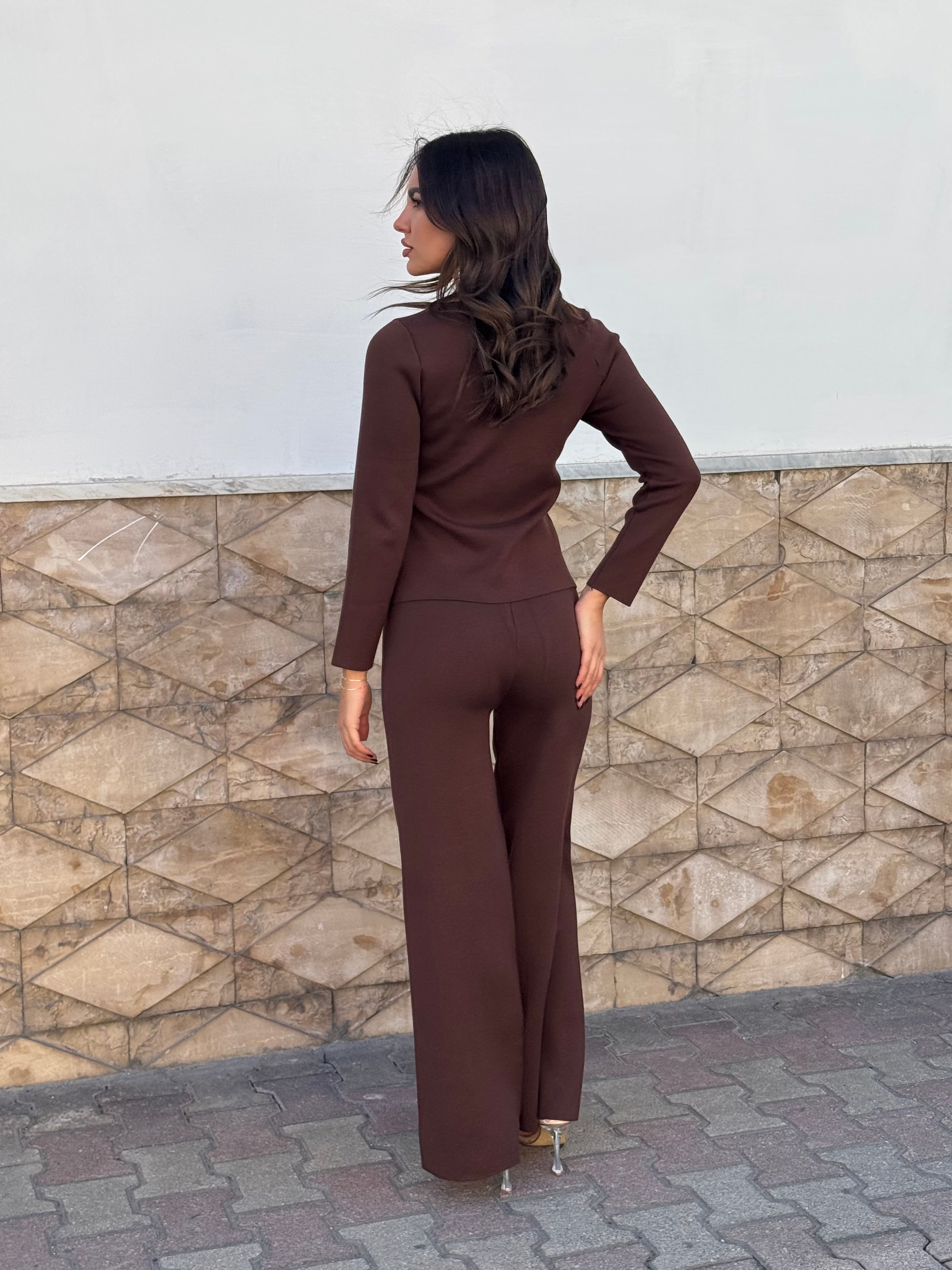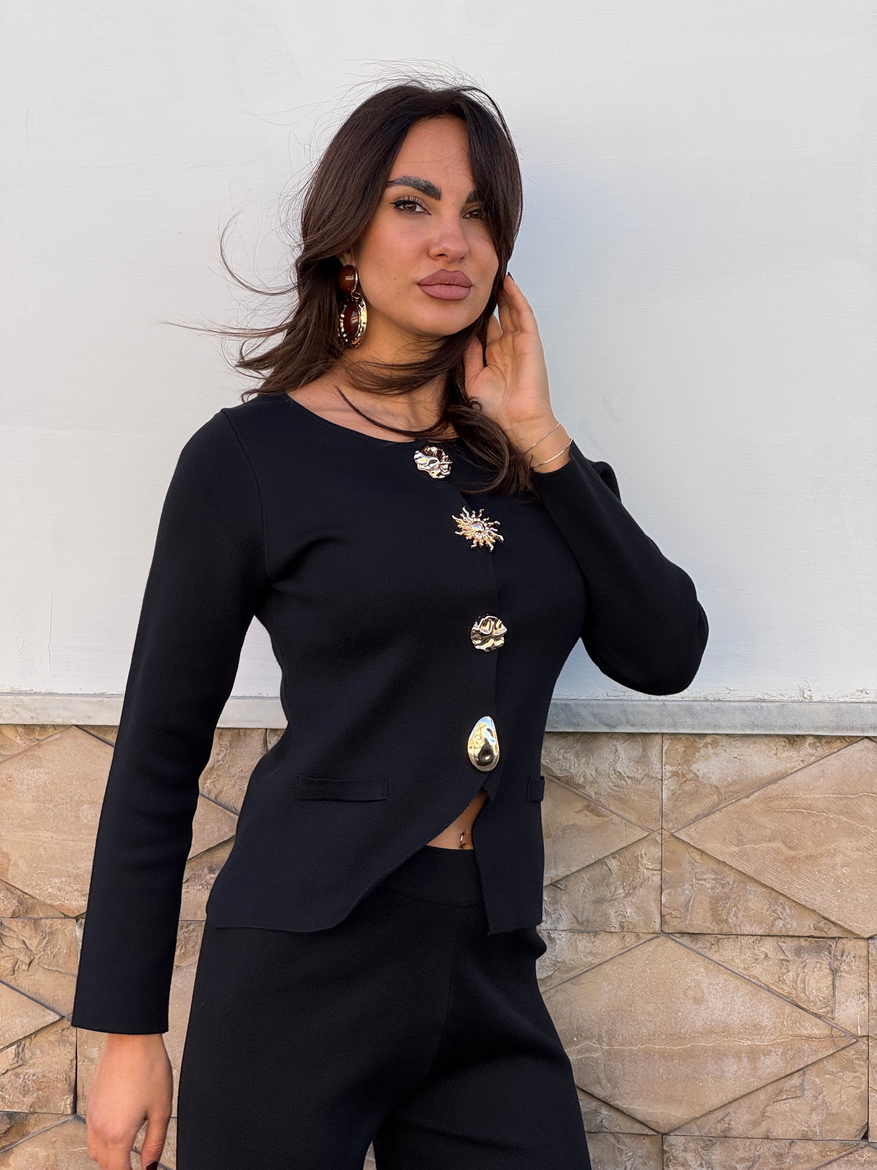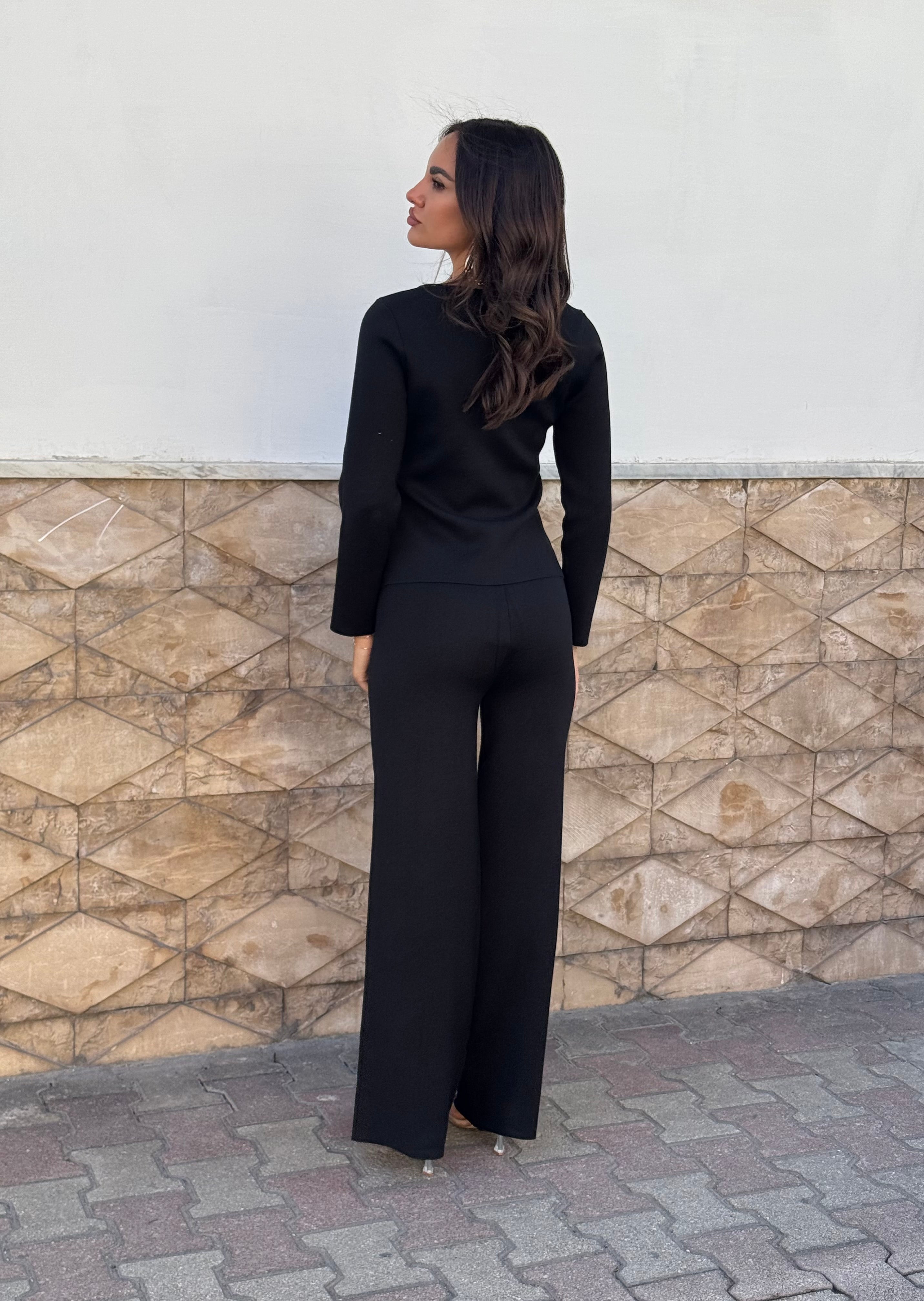 Coordinato in filo composto da cardigan con chiusura frontale in bottoni gold e pantaloni a gamba larga.