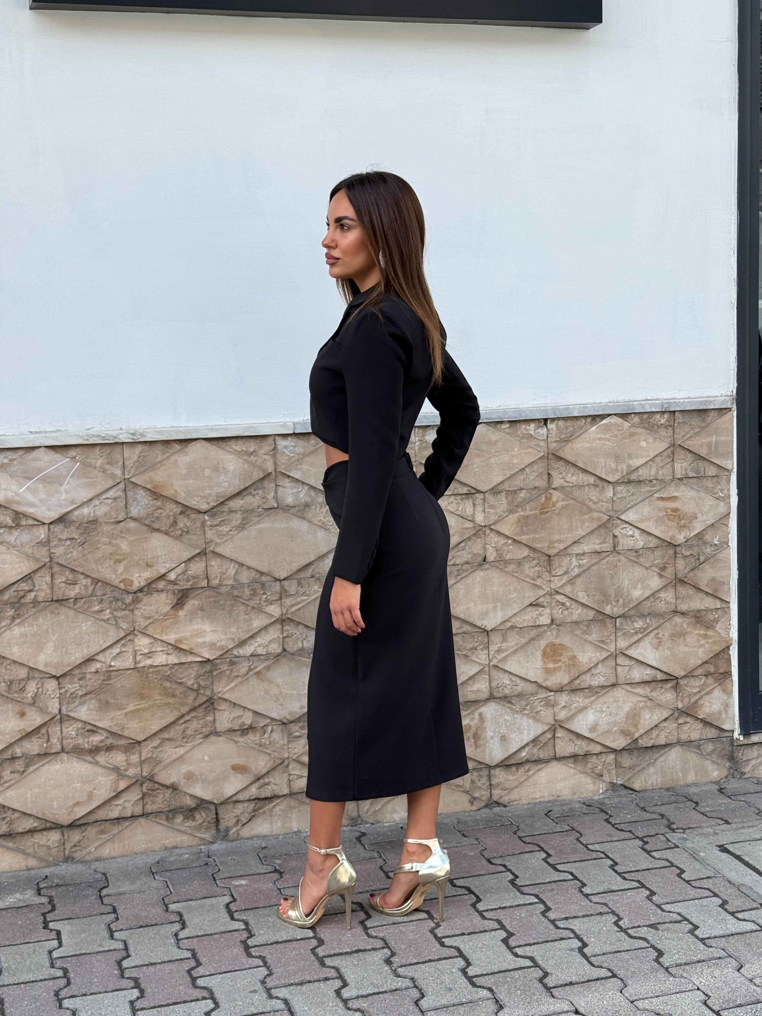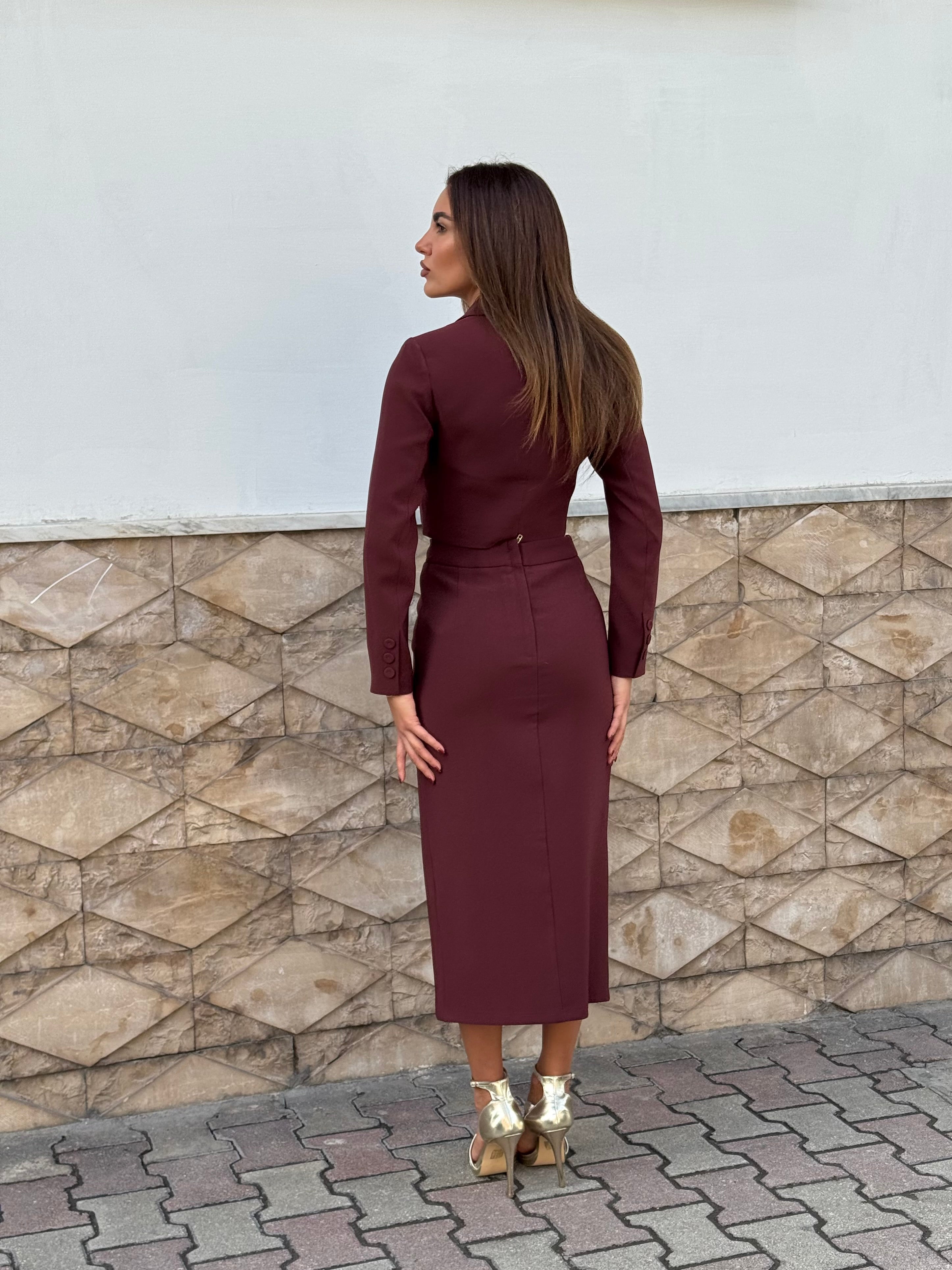Tailleur composto da blazer corto con spallina imbottita e chiusura frontale in gancetto.