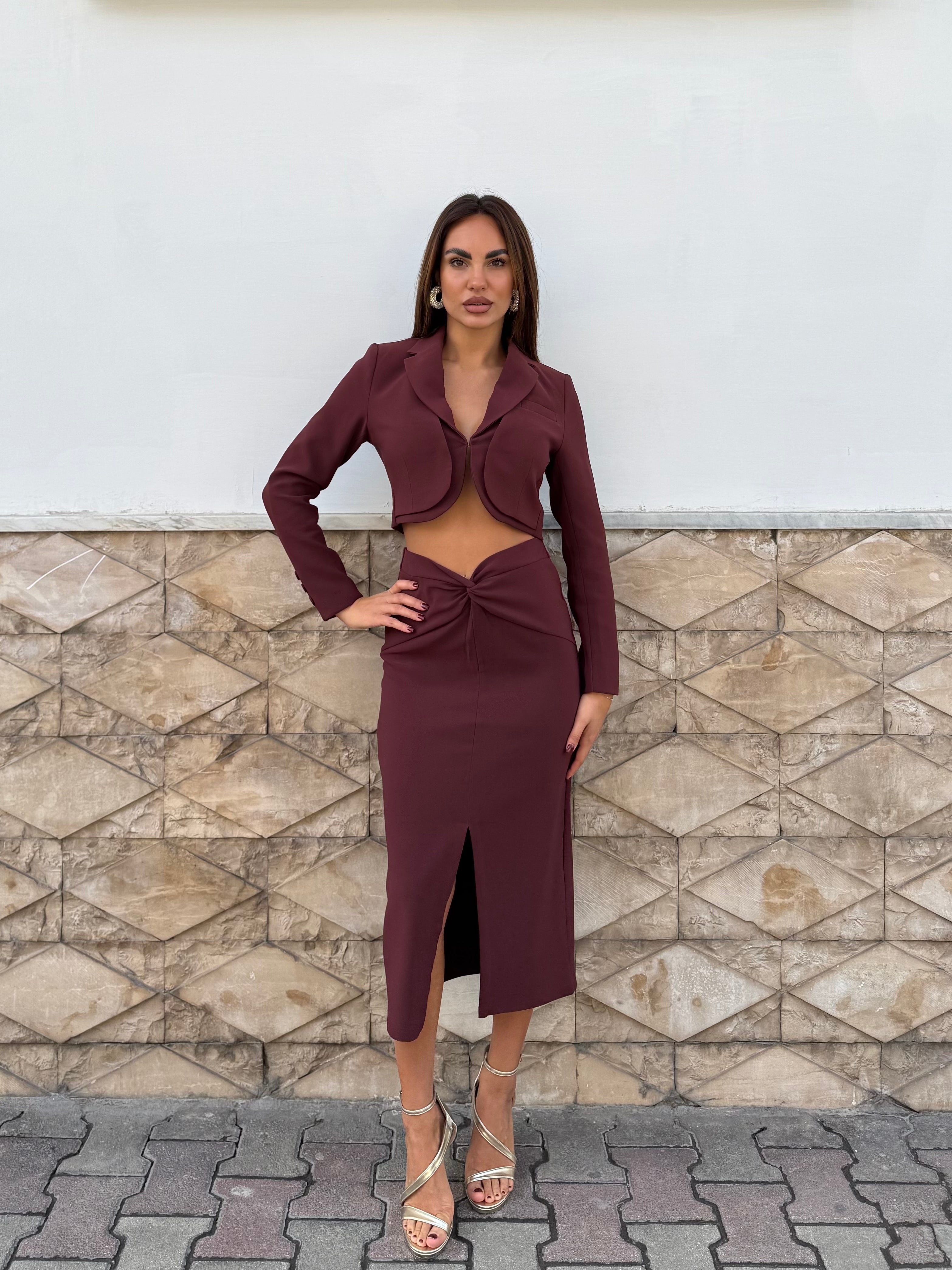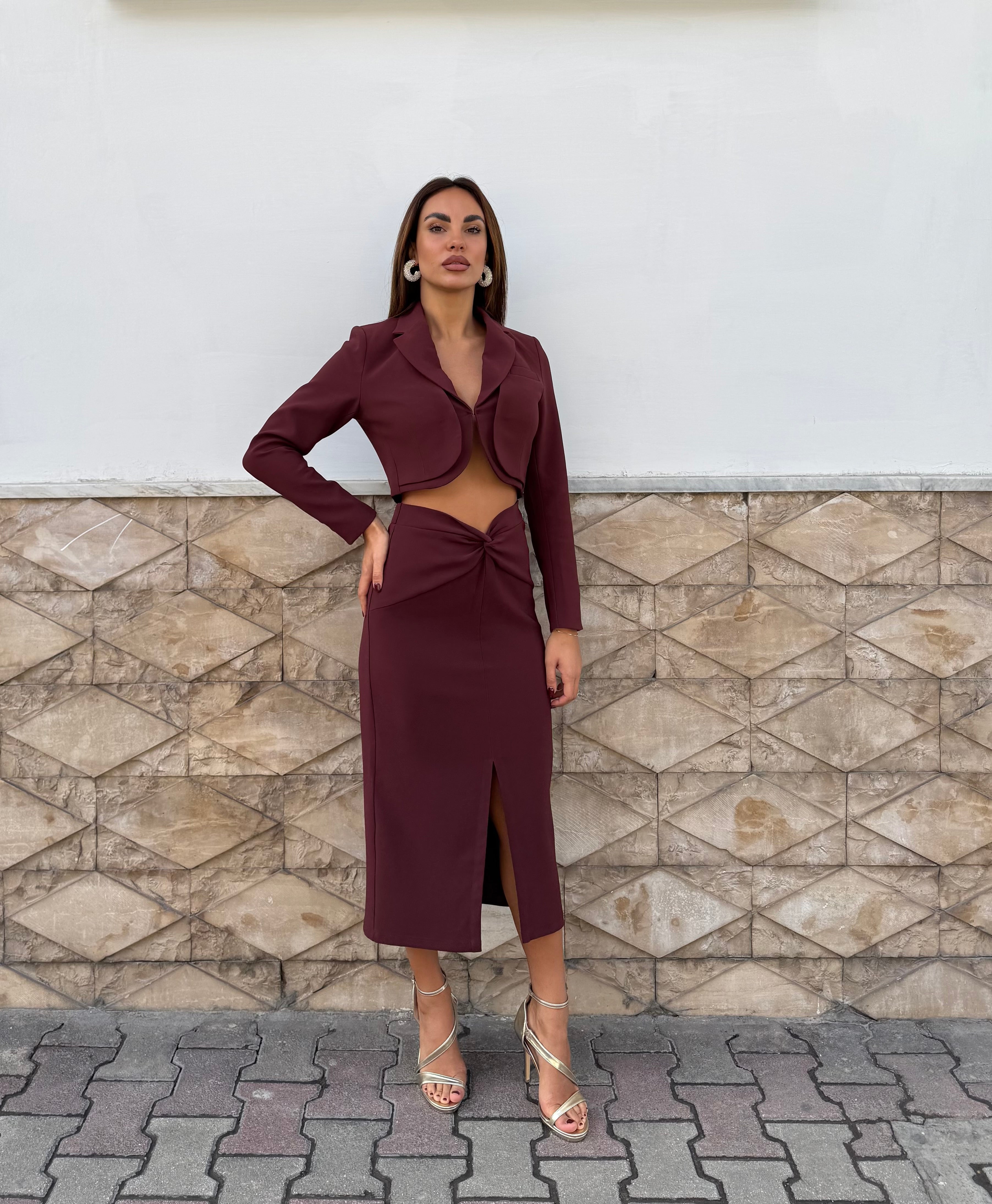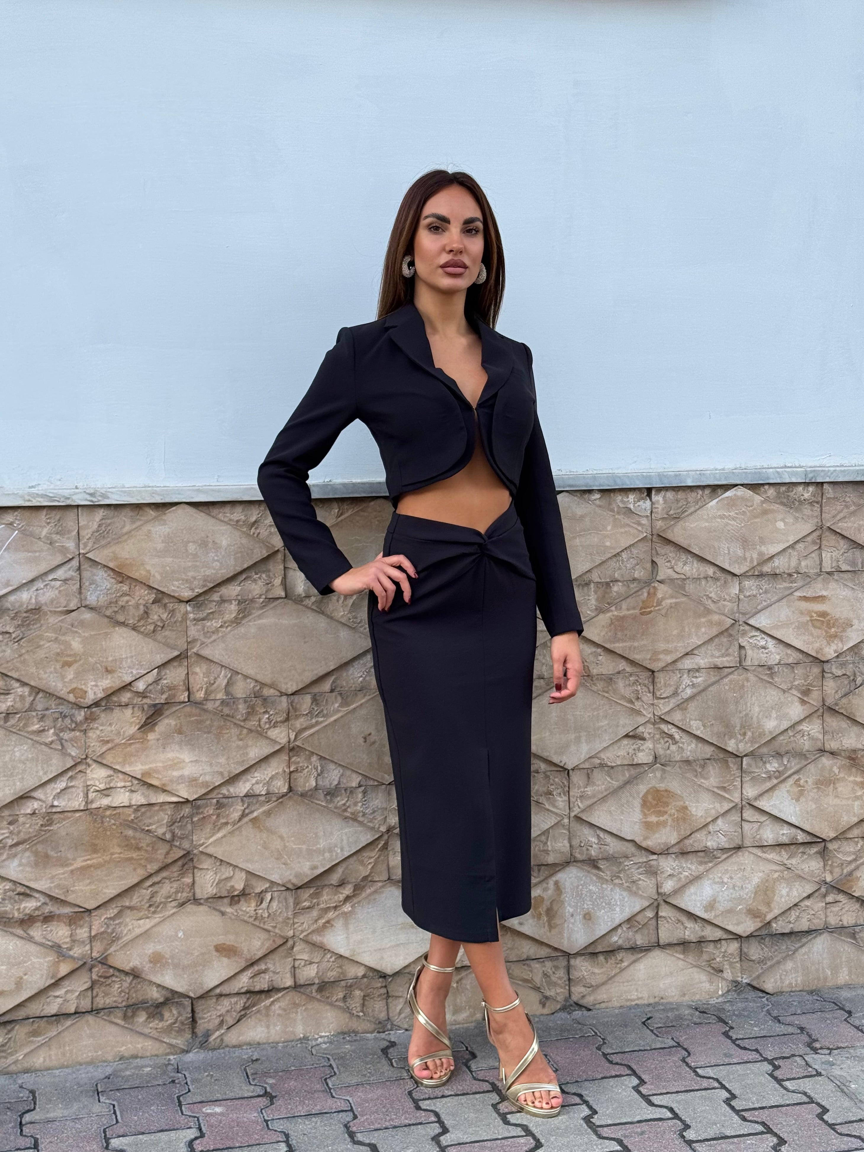 Gonna midi con dettaglio nodo in vita e raffinato spacco sul fondo.
