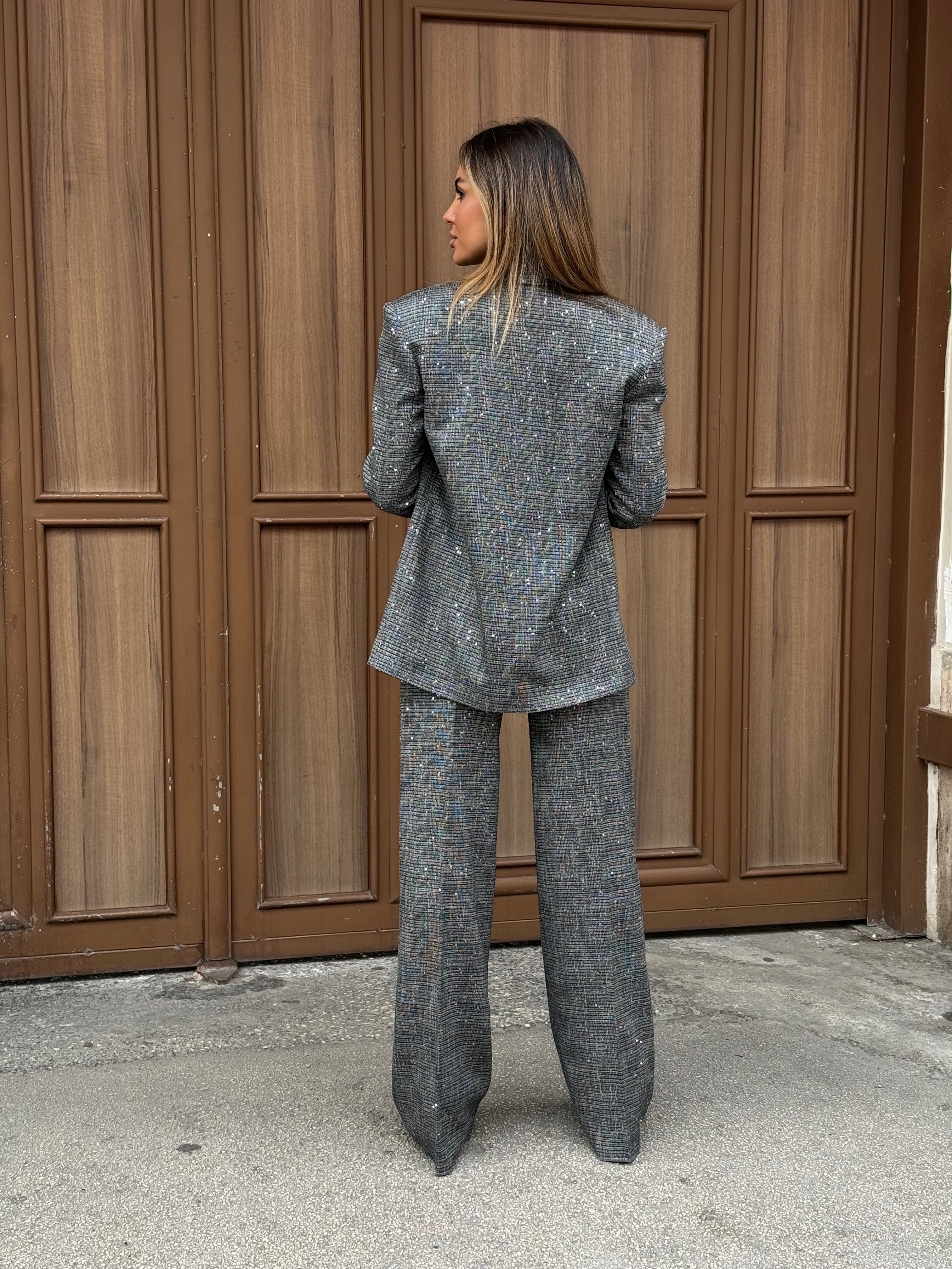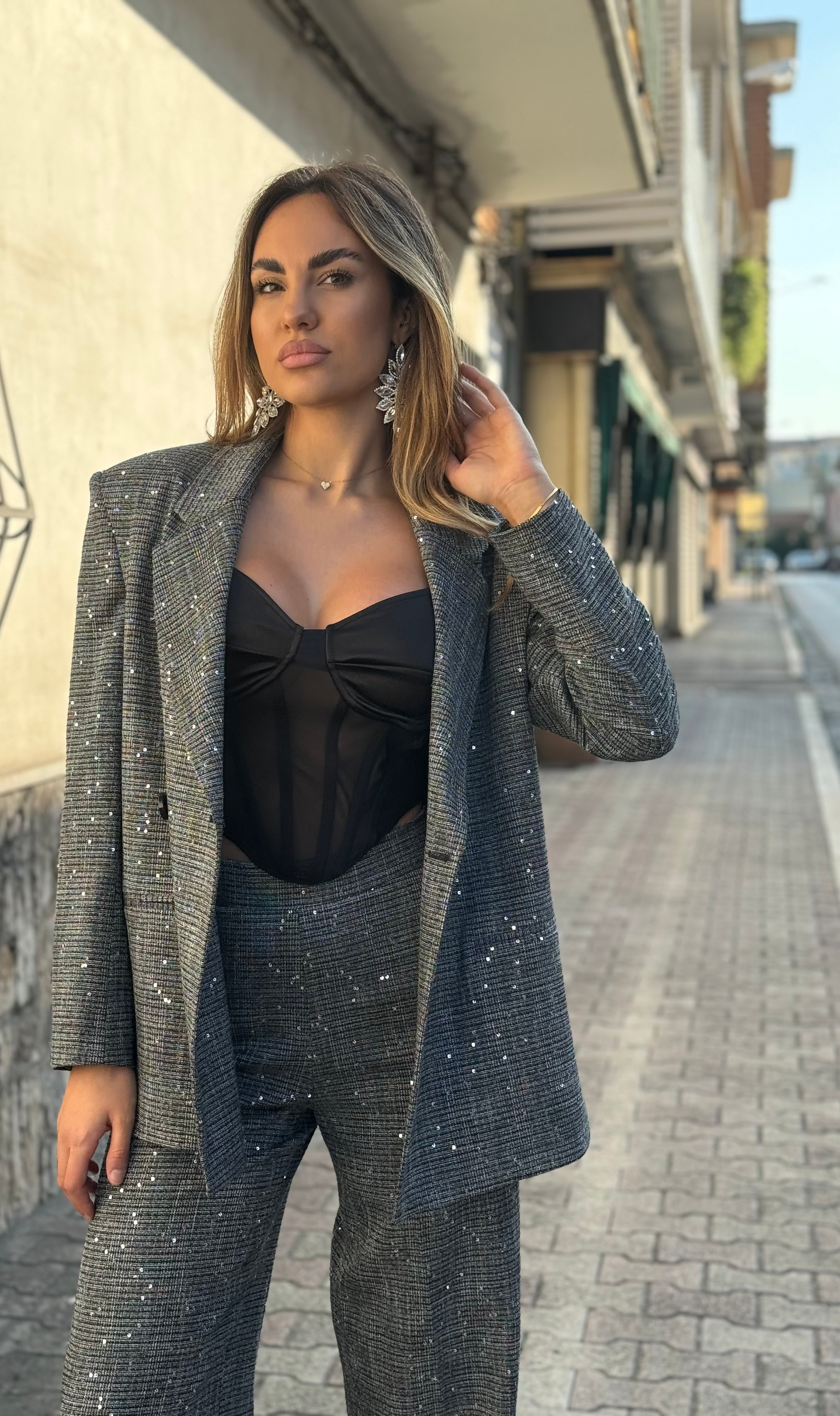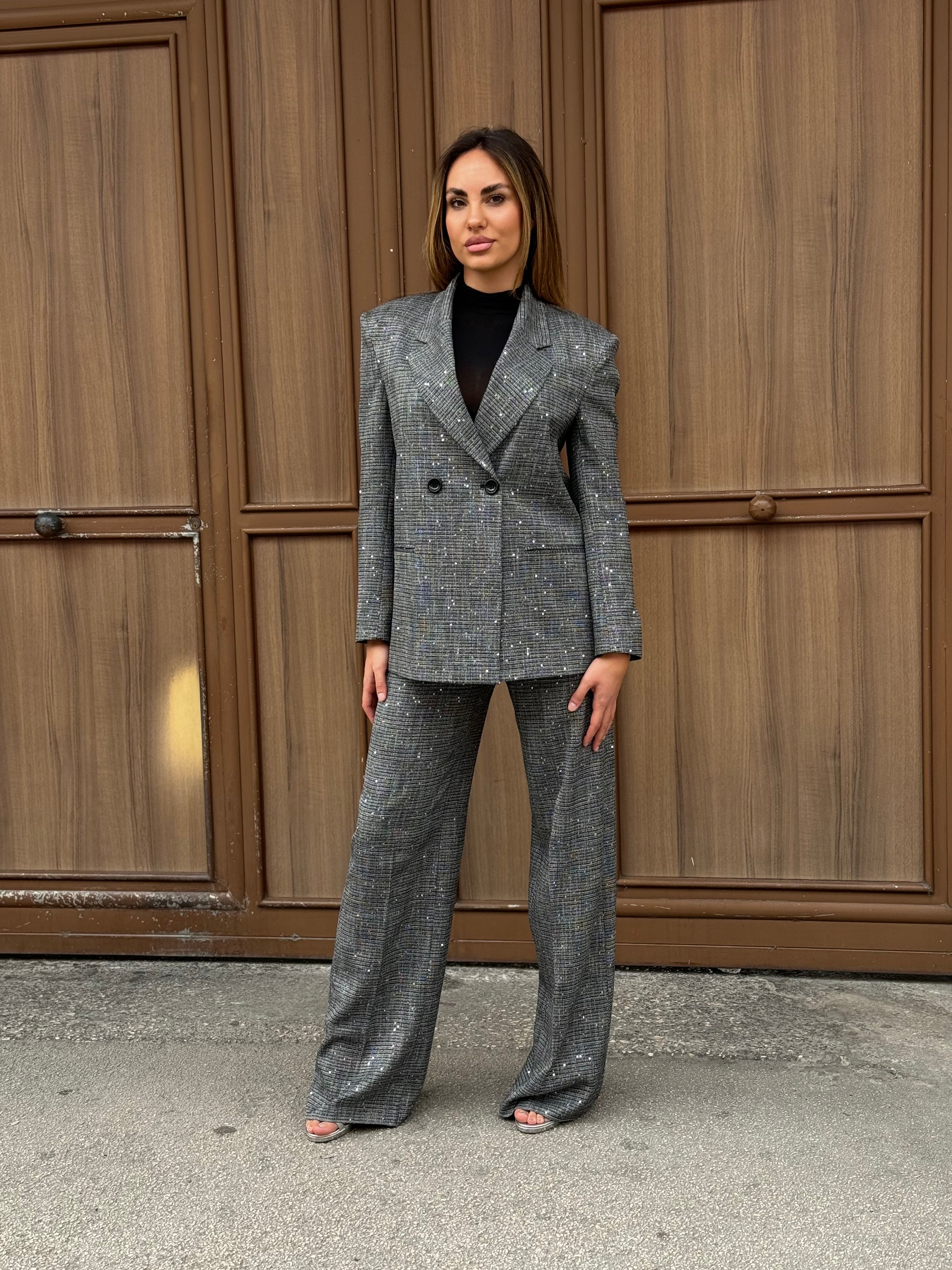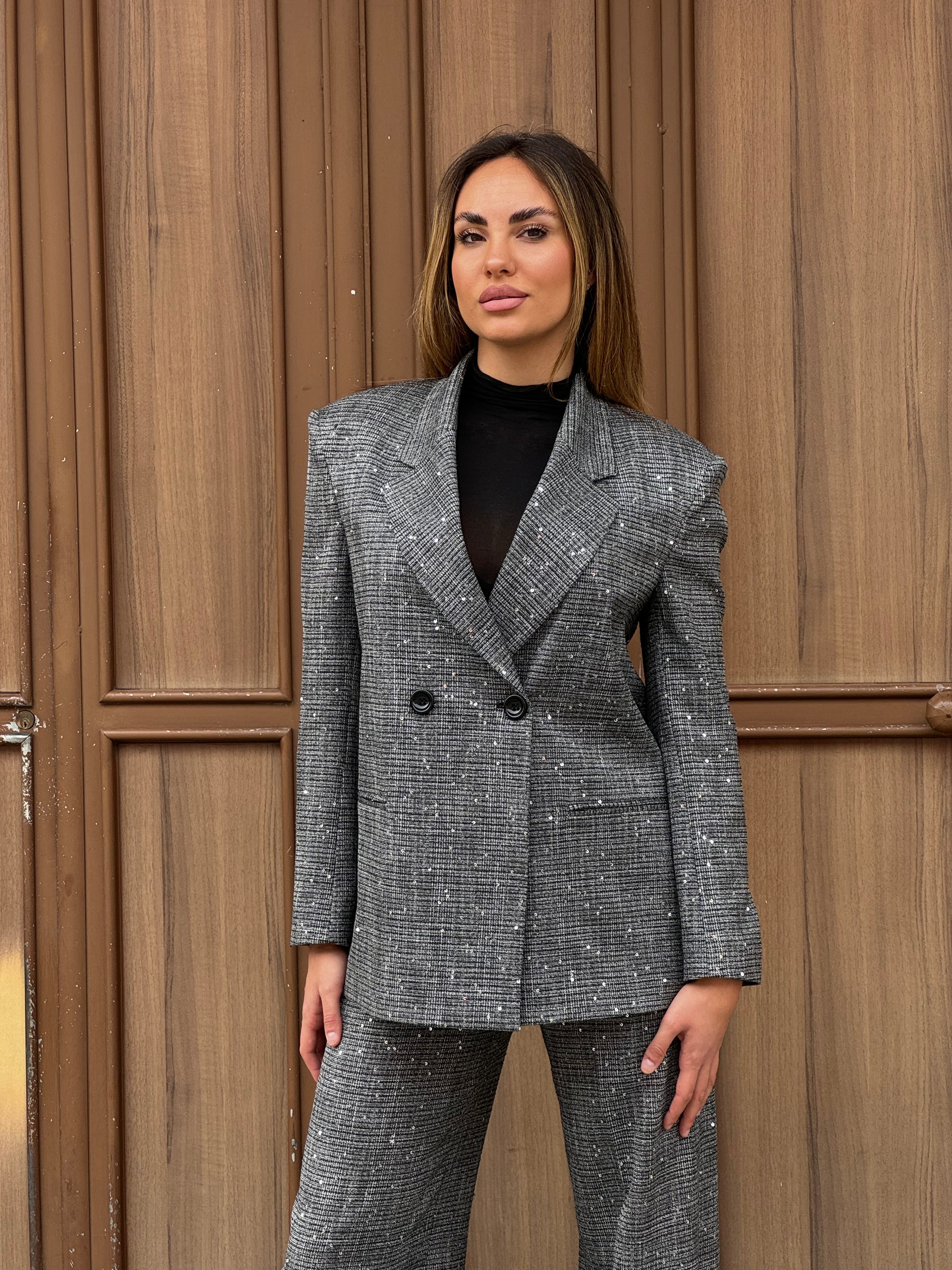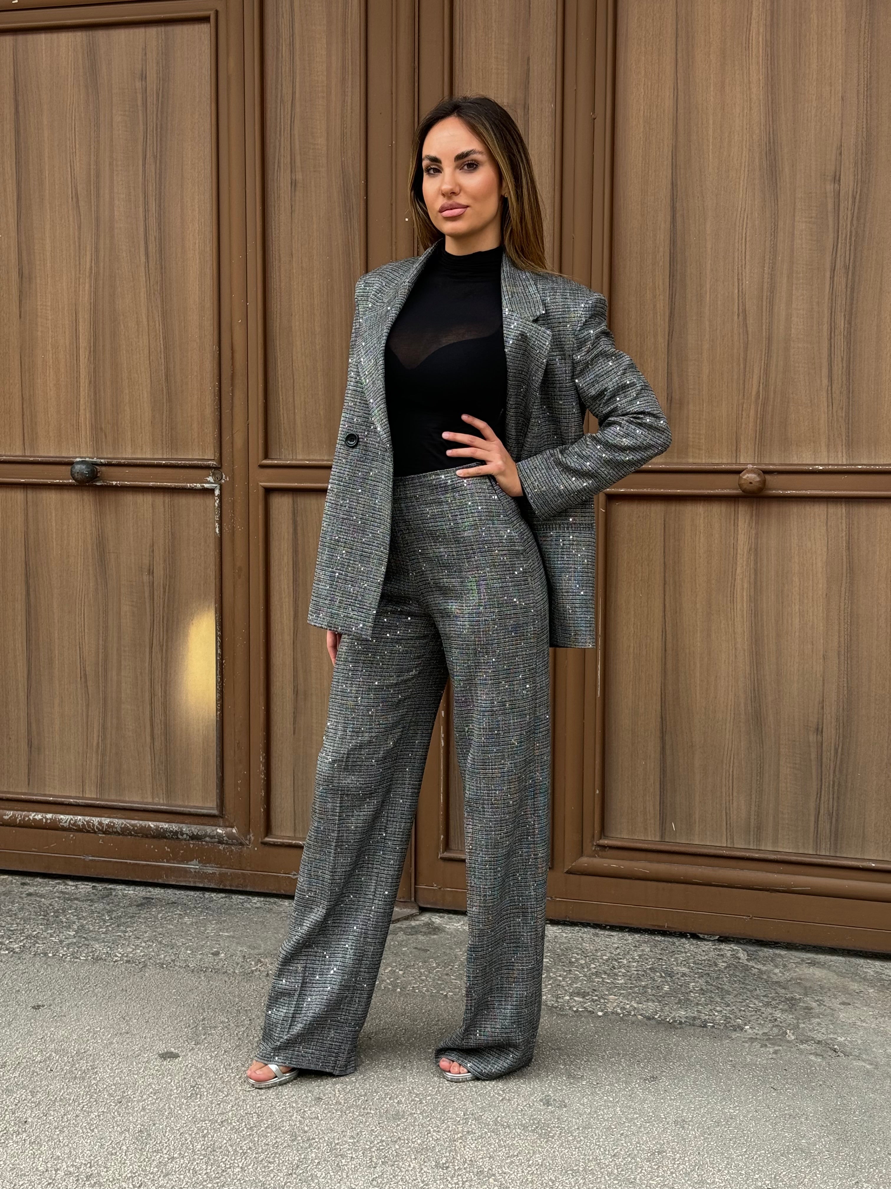 Un elegante tailleur a quadri tempestato di paillettes composto da