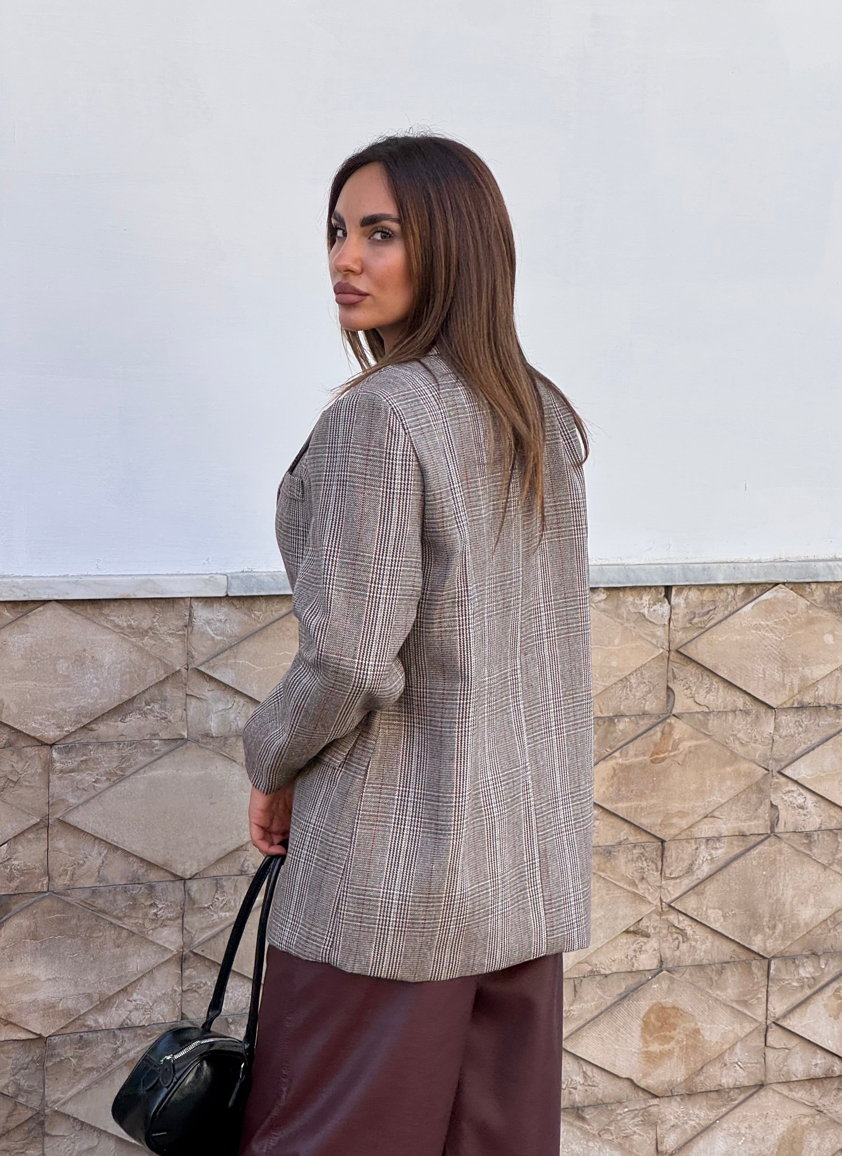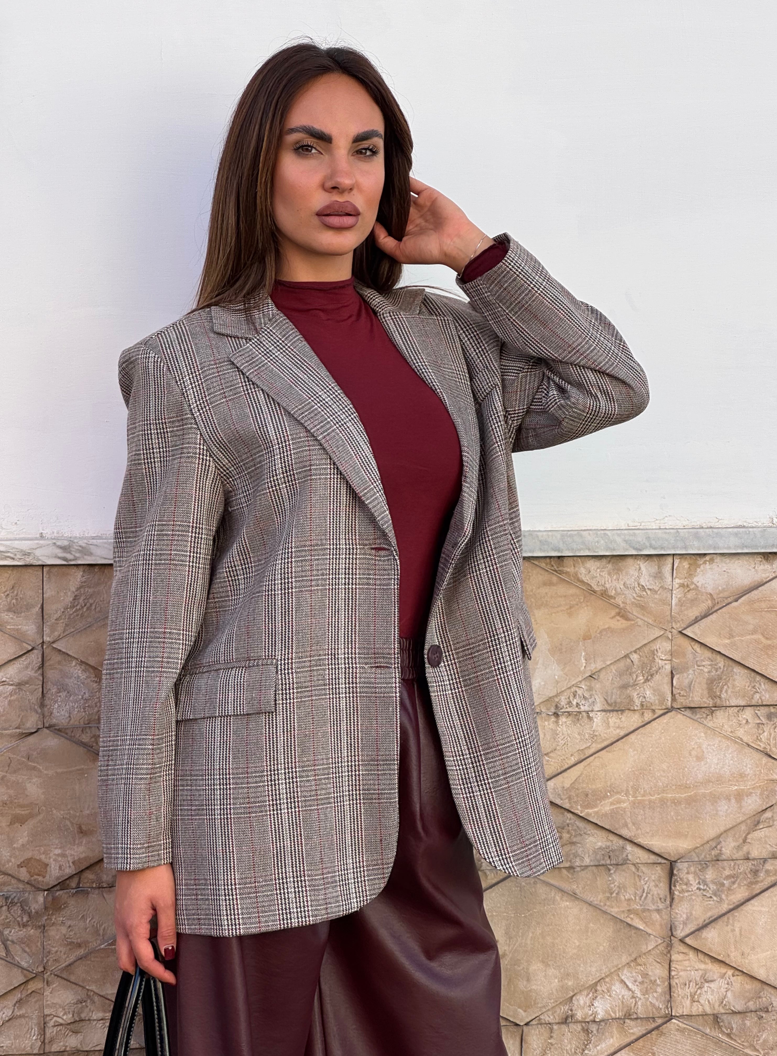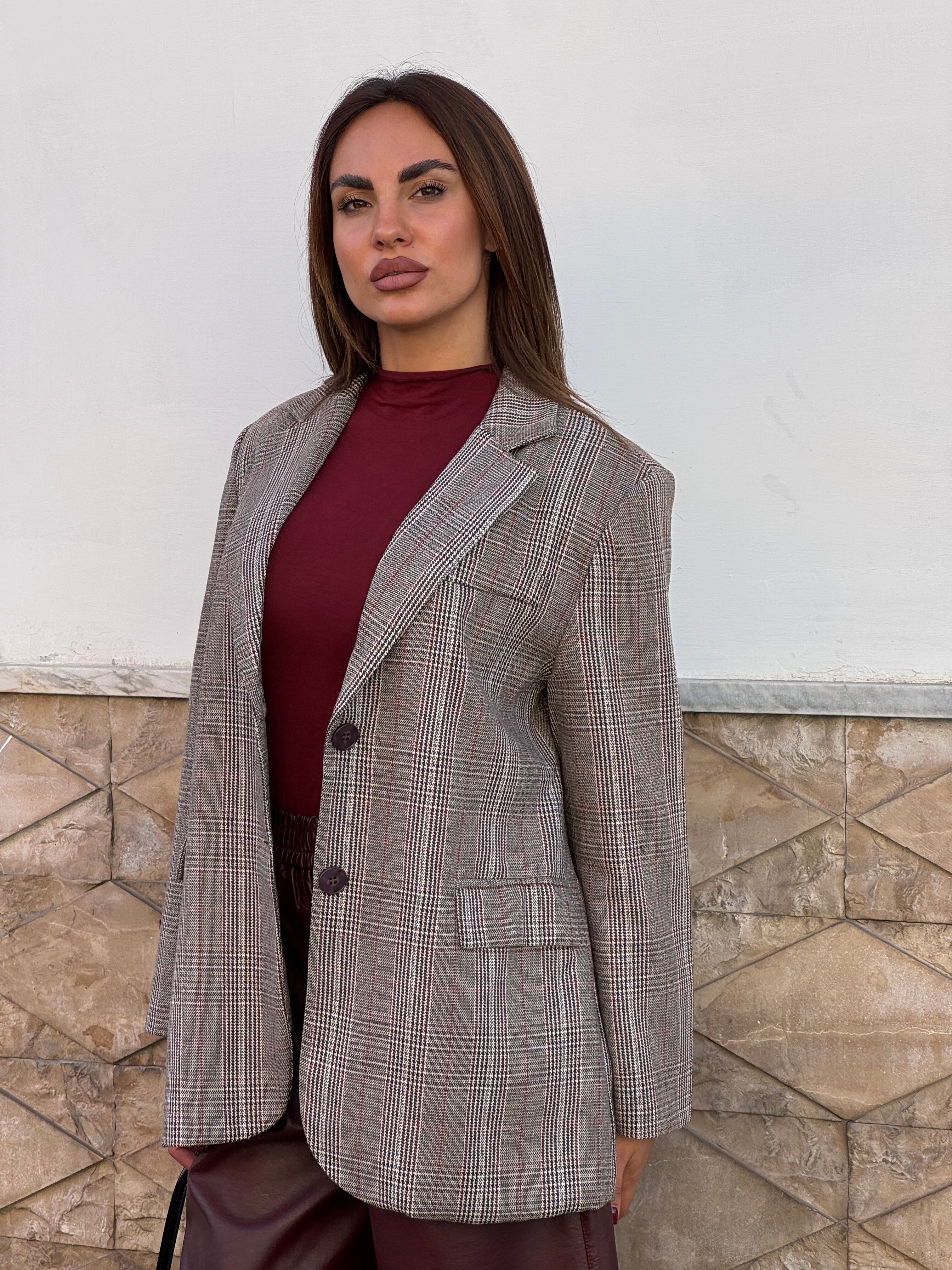 Blazer a quadri, monopetto con chiusura a due bottoni frontale.