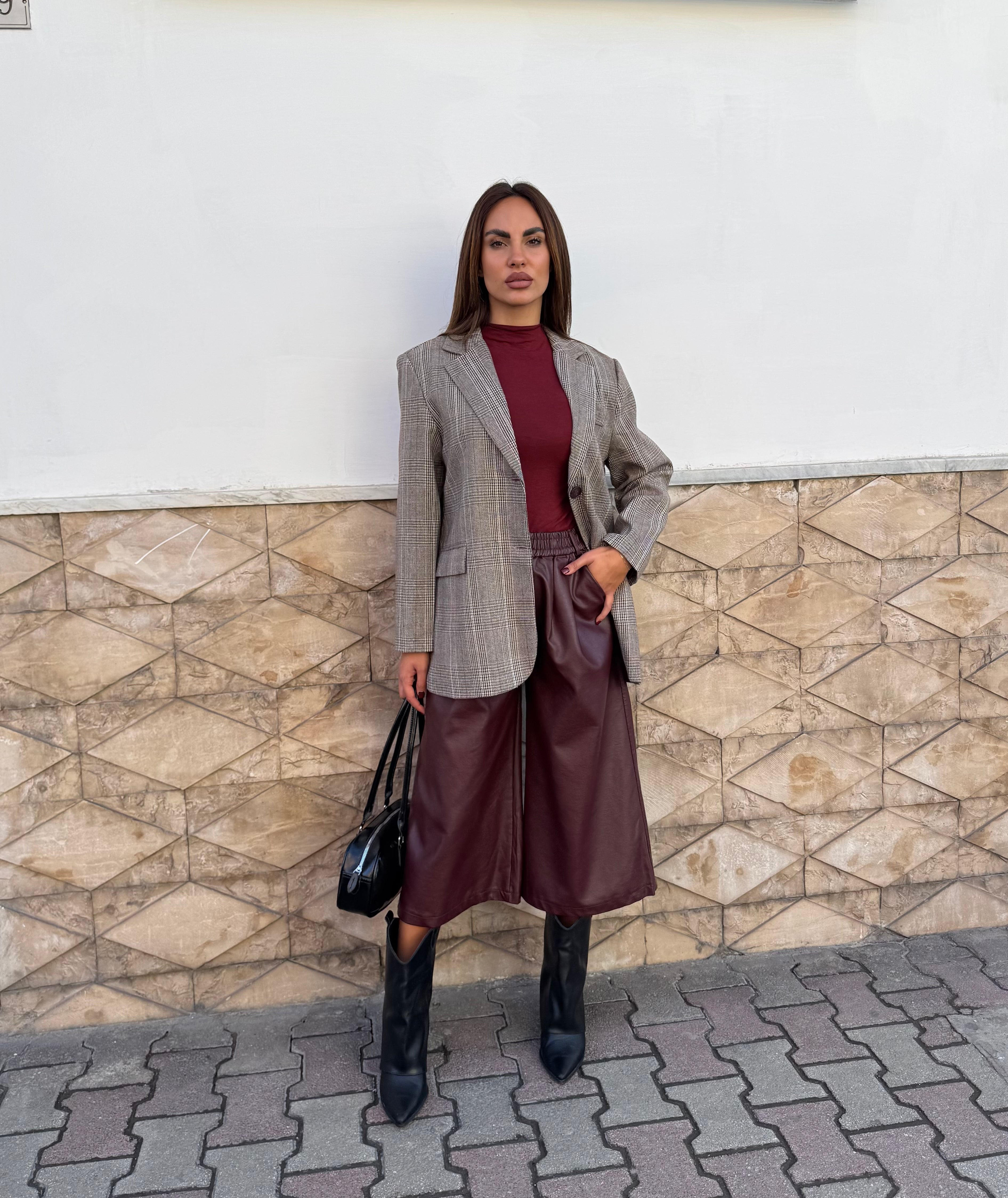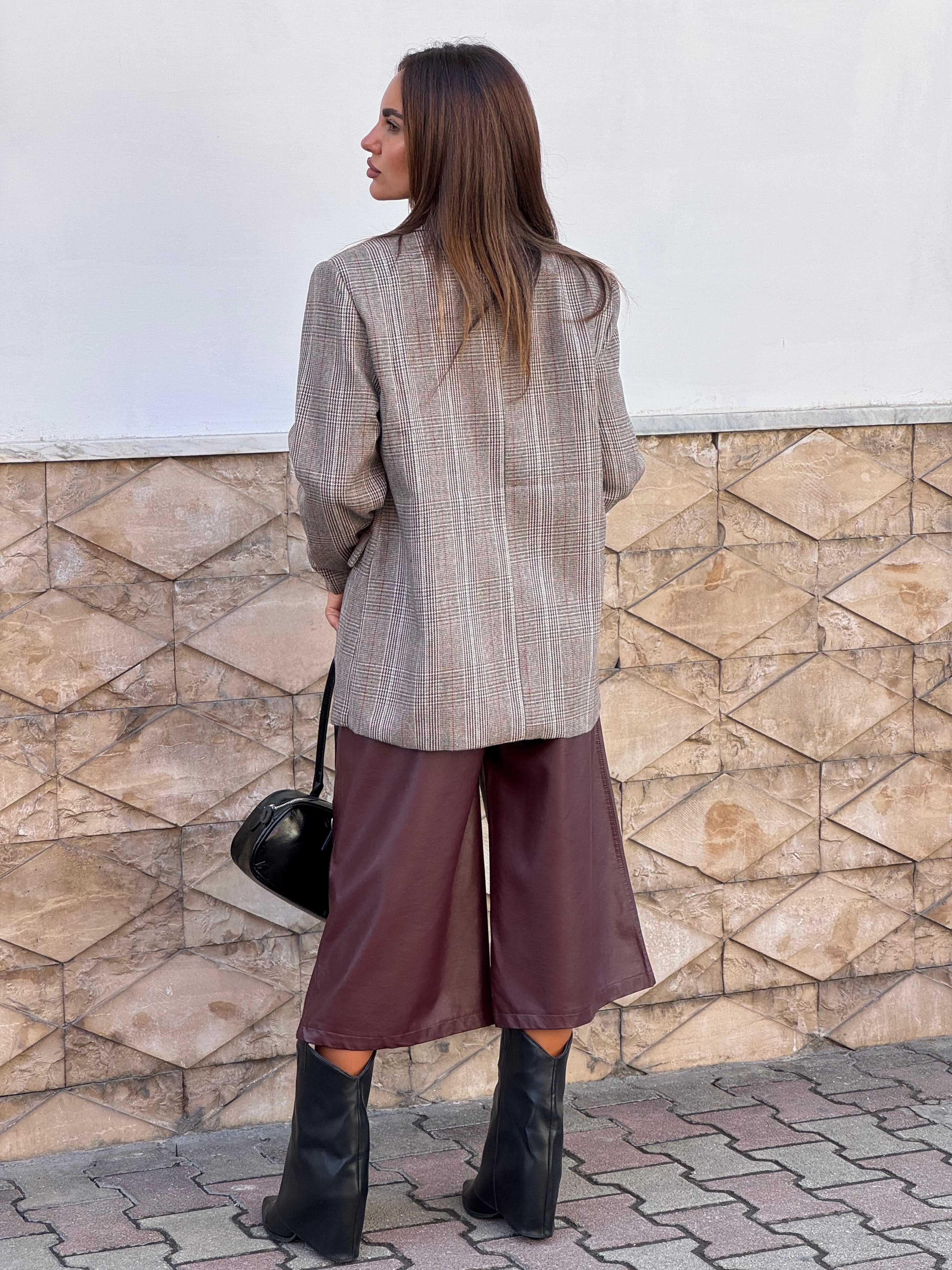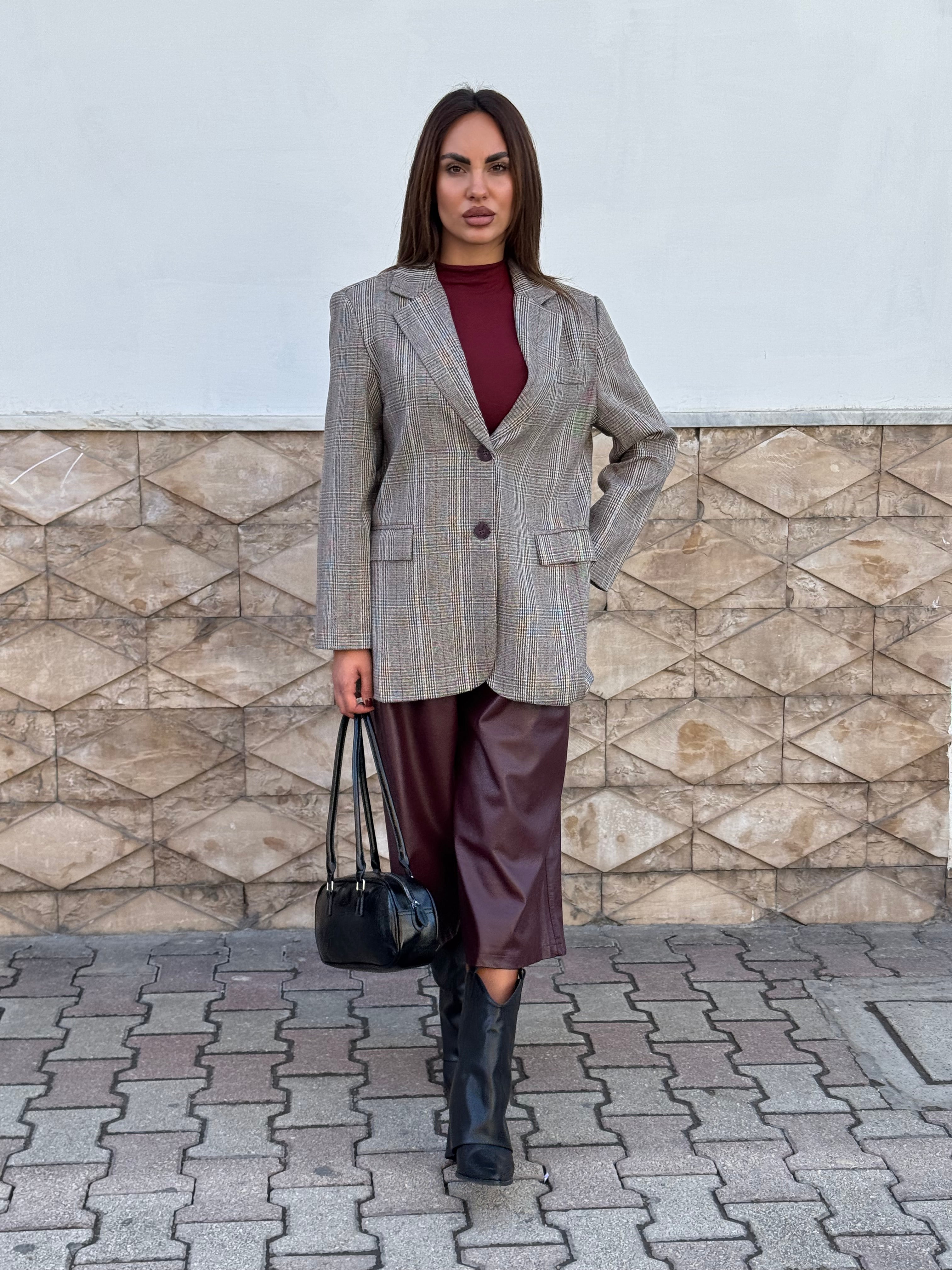 Blazer a quadri, monopetto con chiusura a due bottoni frontale.