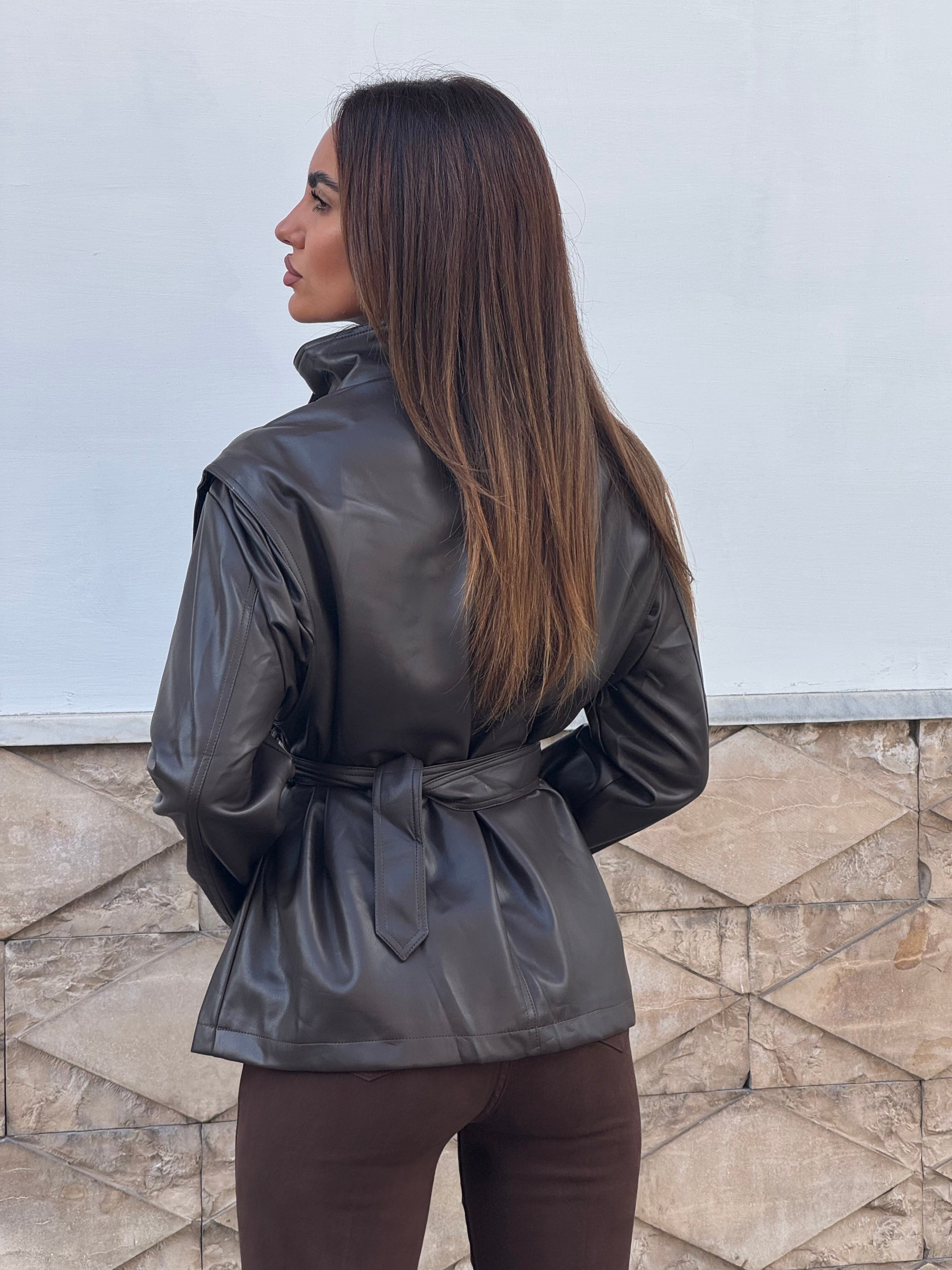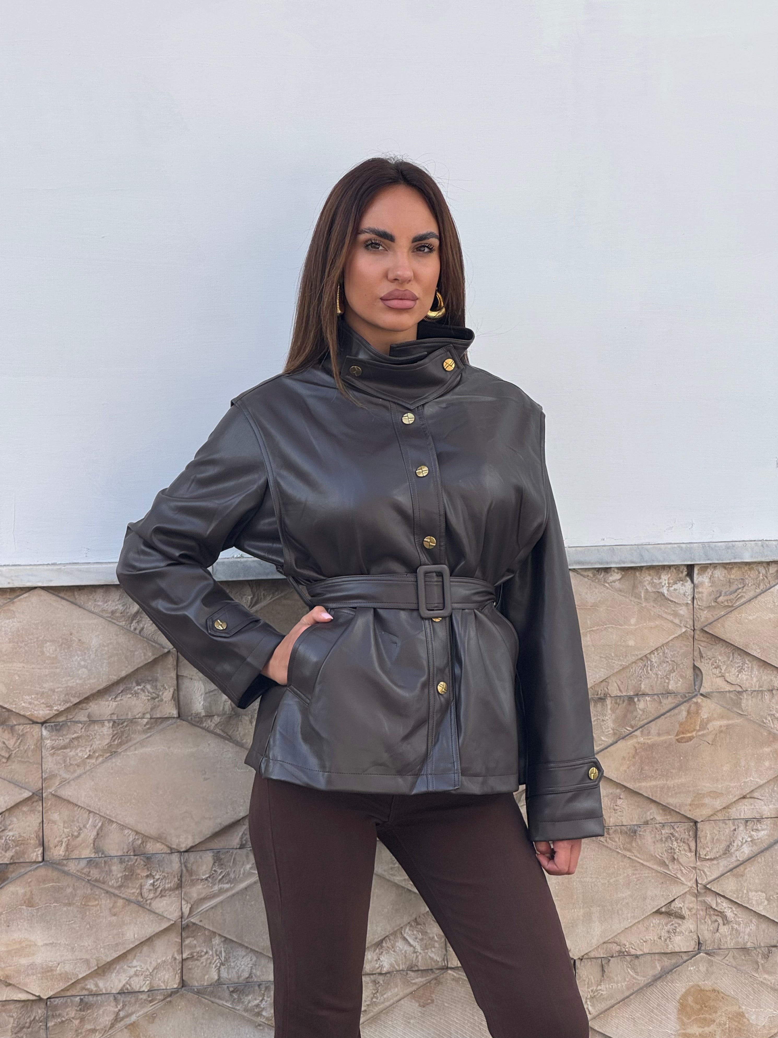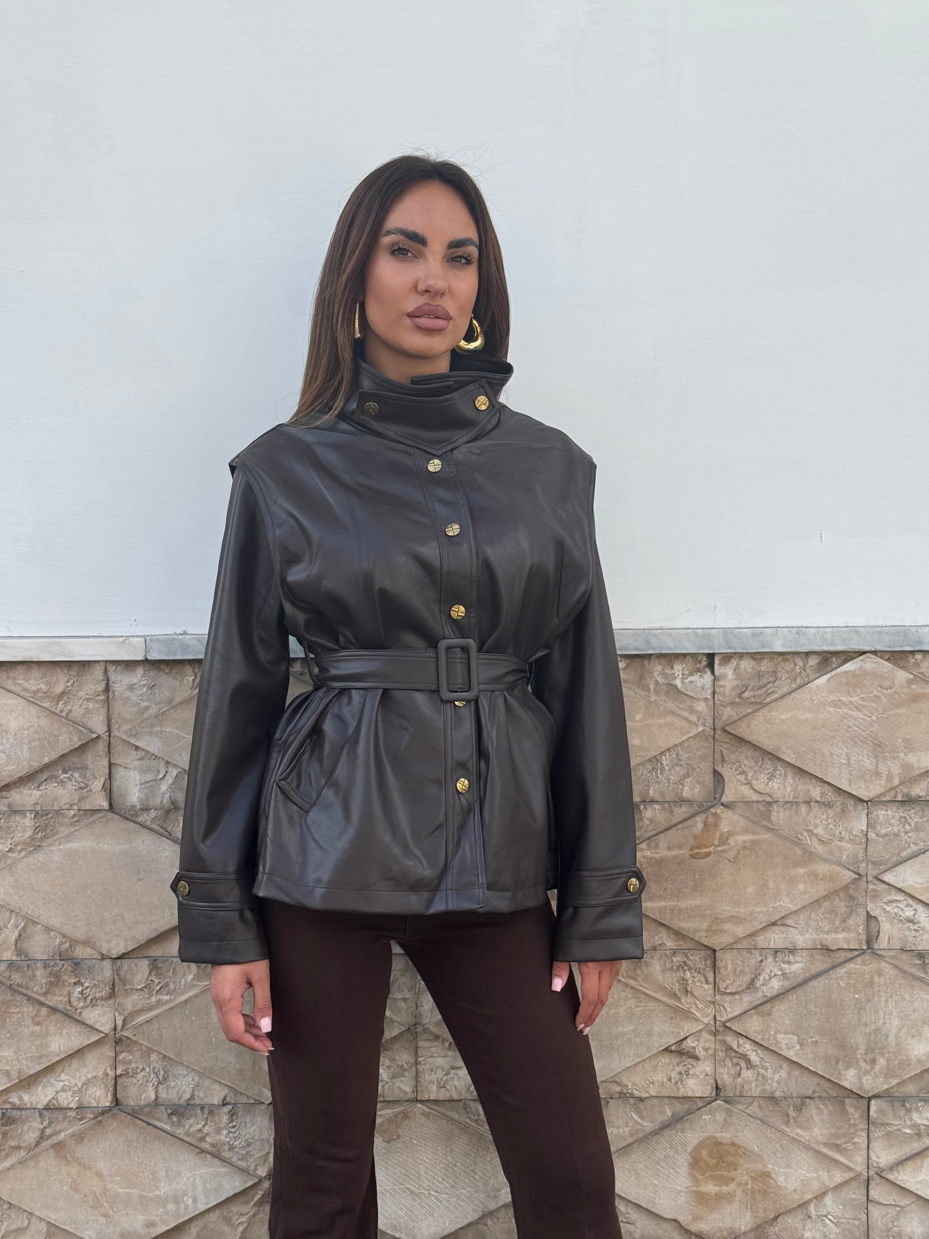 Giubbino in ecopelle con chiusura in bottoni oro .
