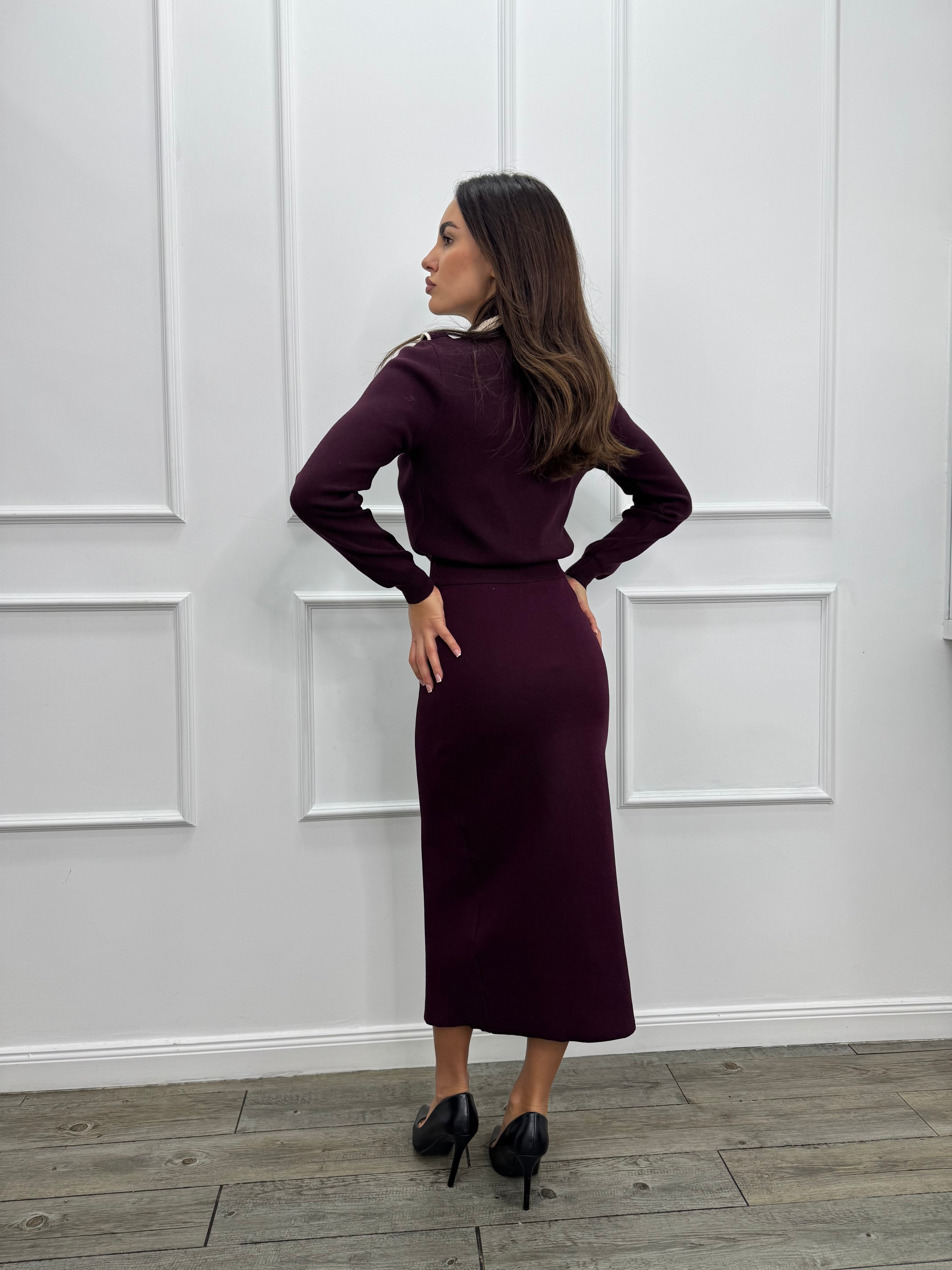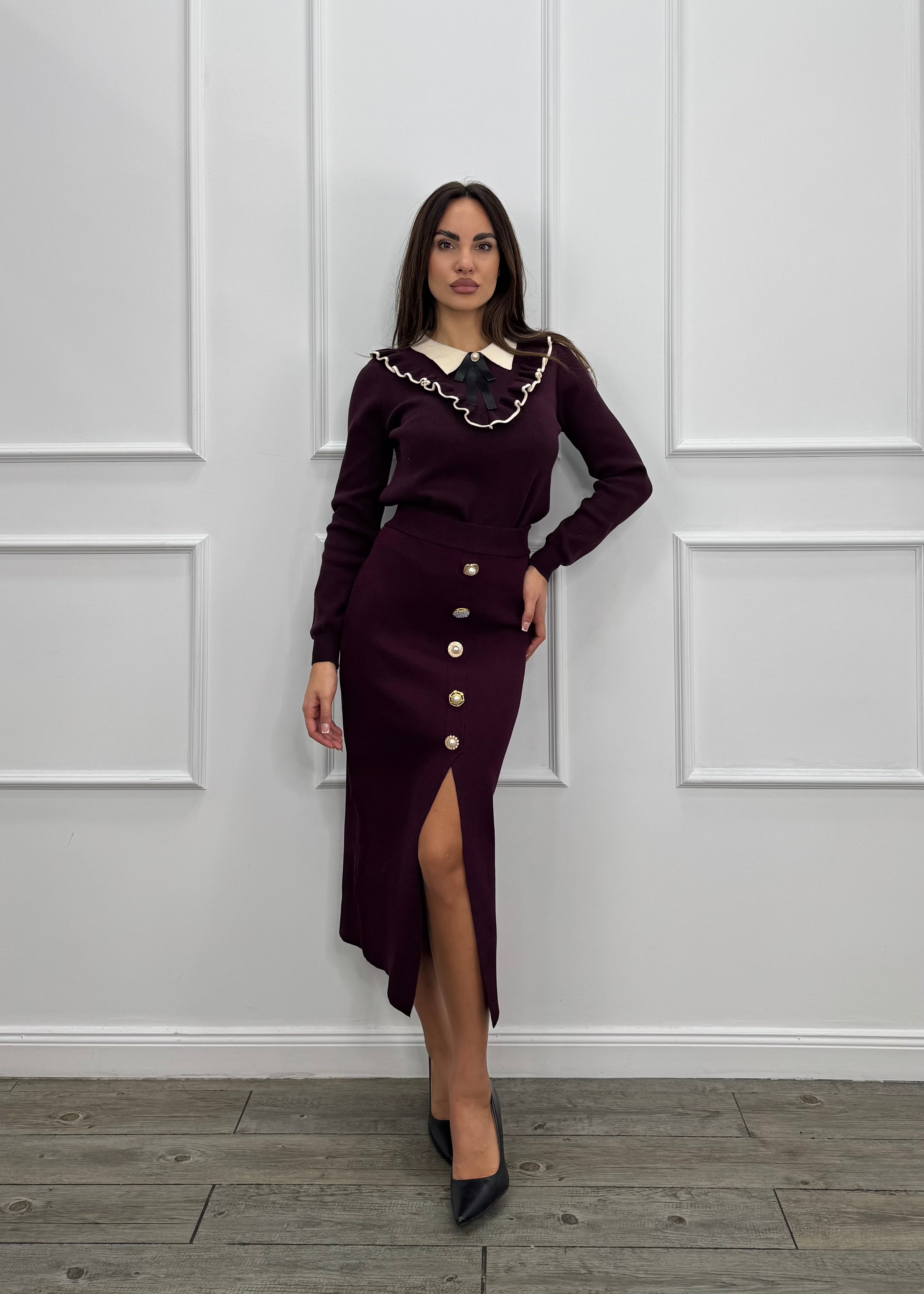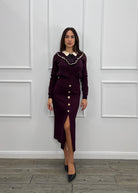 Meravigliosa gonna a tubino in lana rasata, con un elegante spacco e finti bottoni in perle.