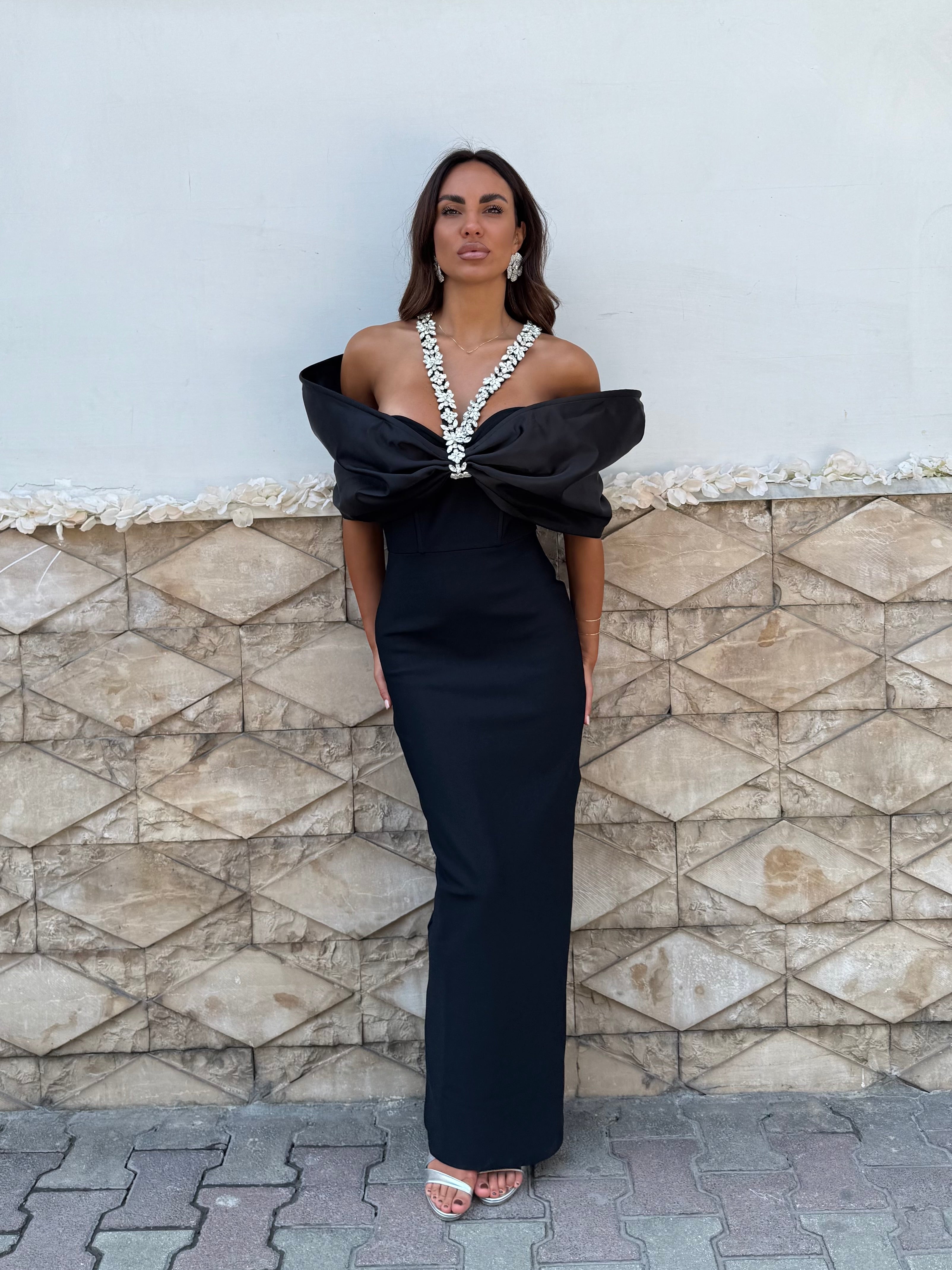 Sulle spalle un fiocco in raso rigido che avvolge le braccia e crea un sensuale scollo a barca .