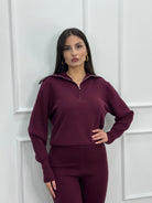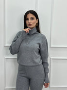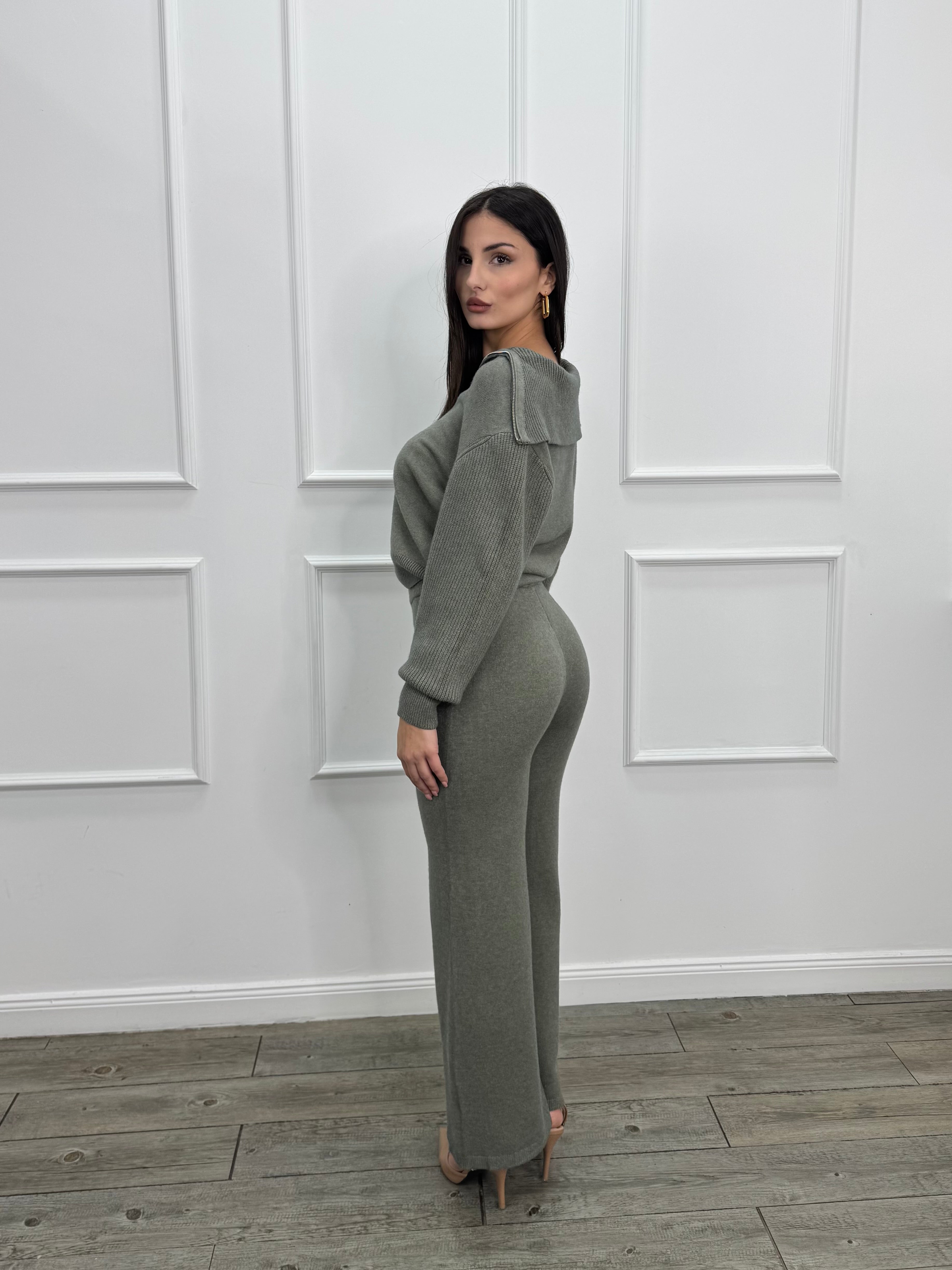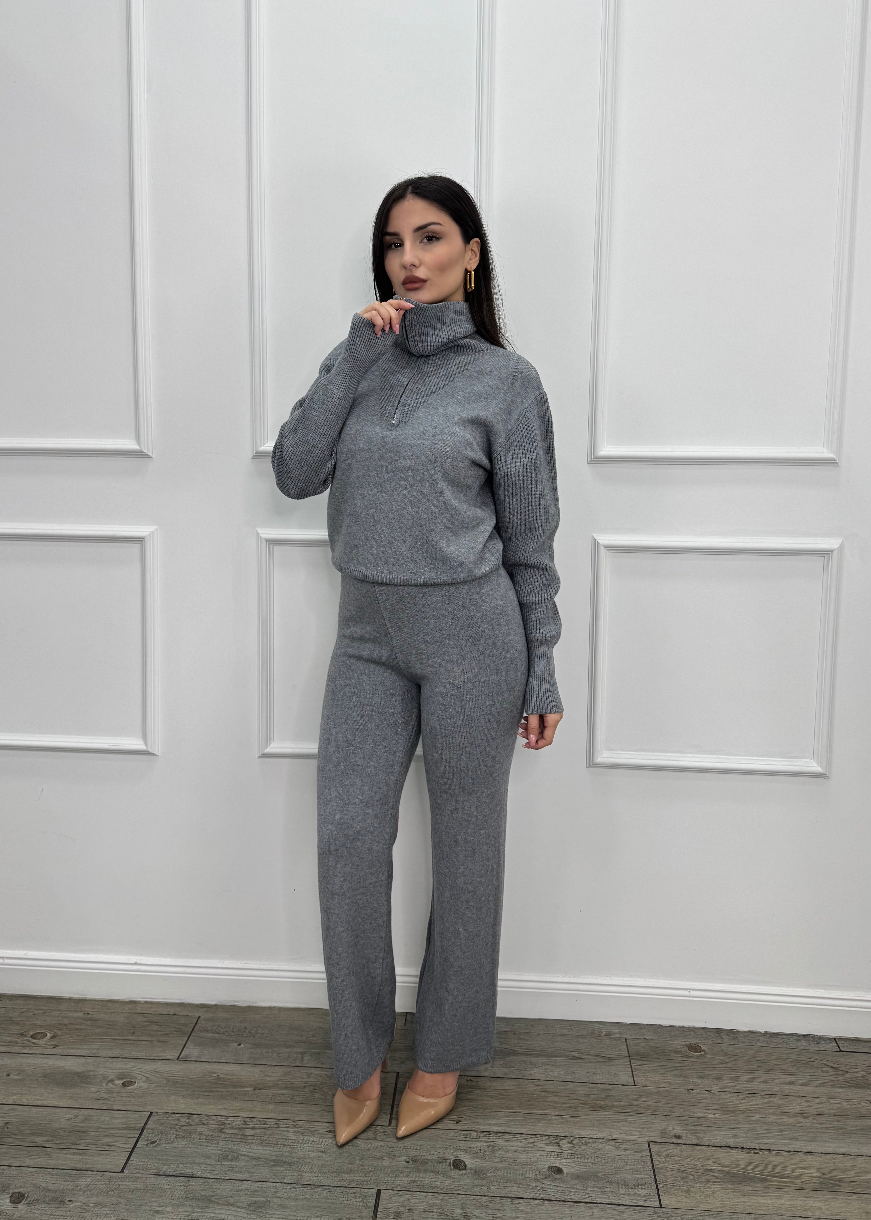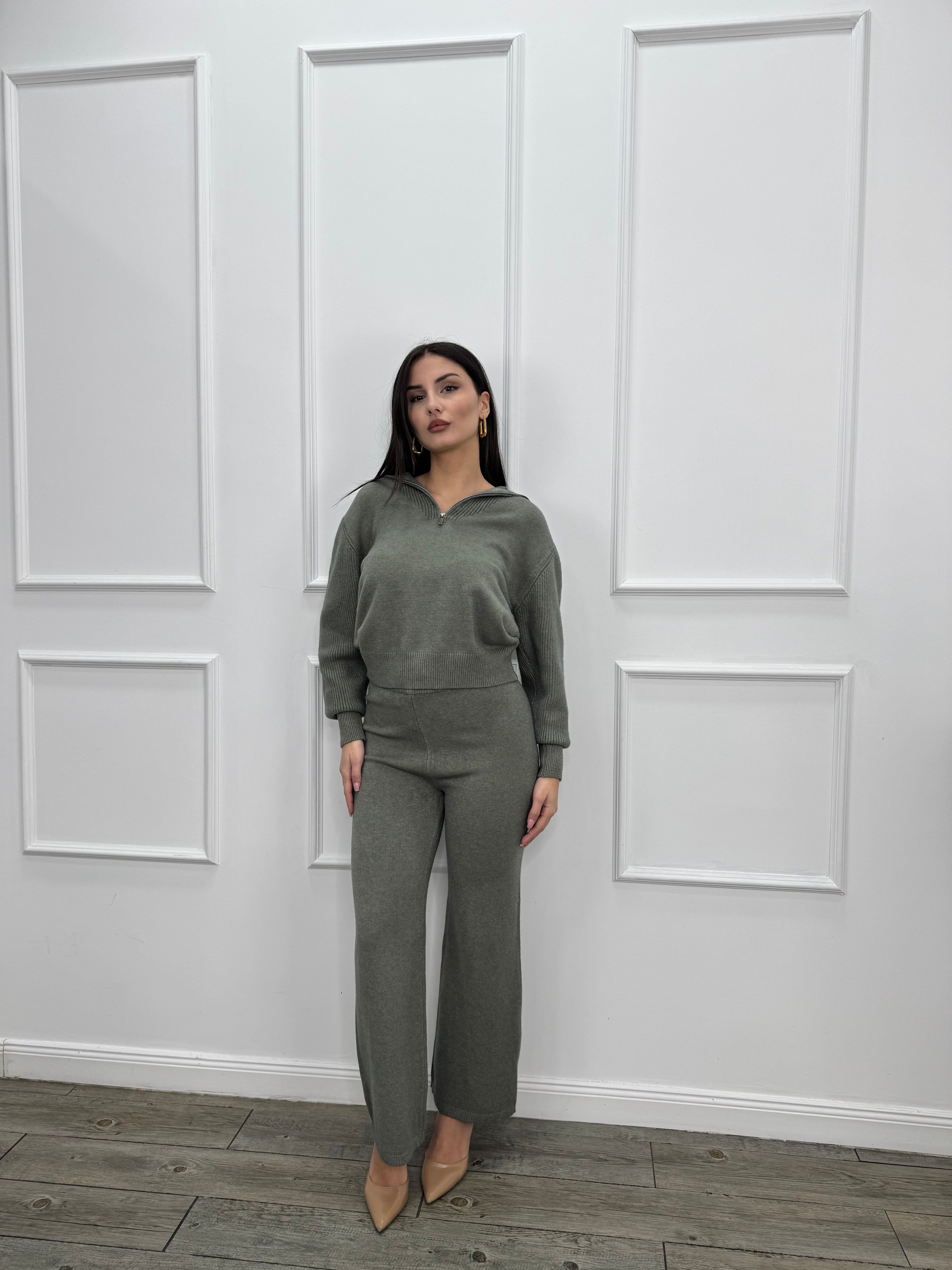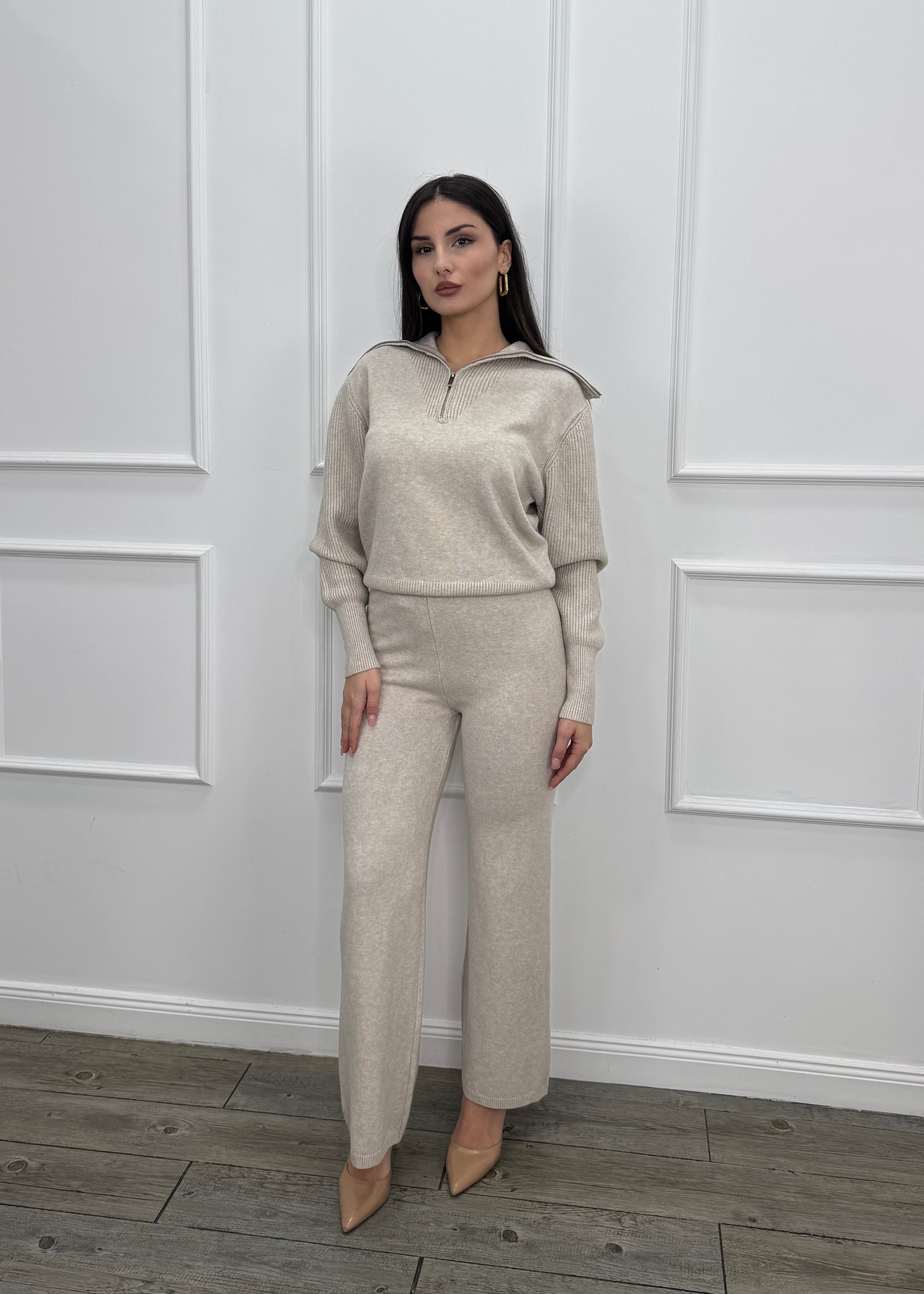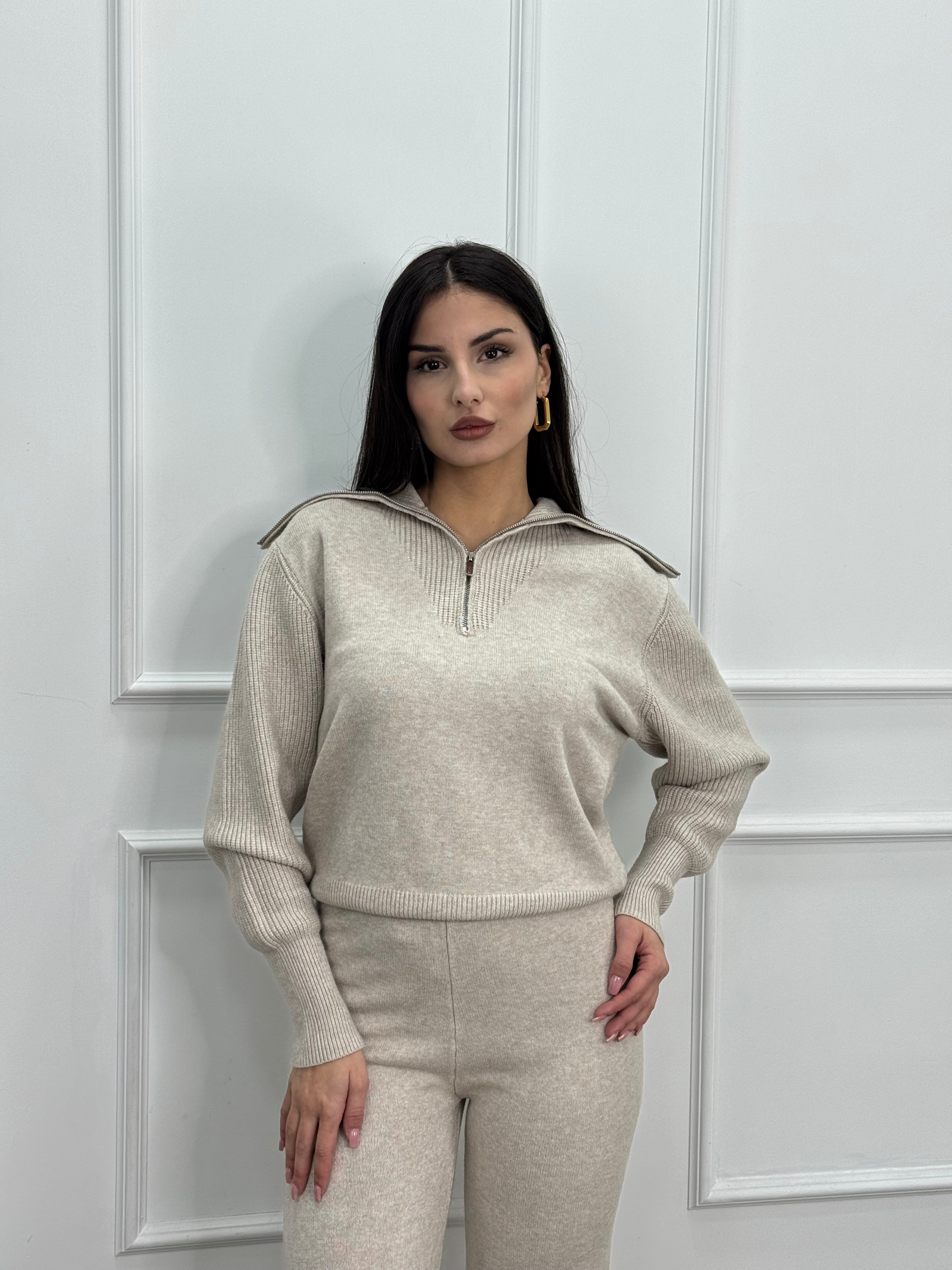 Set in lana composto da maglia con zip e pantaloni con molla in vita.