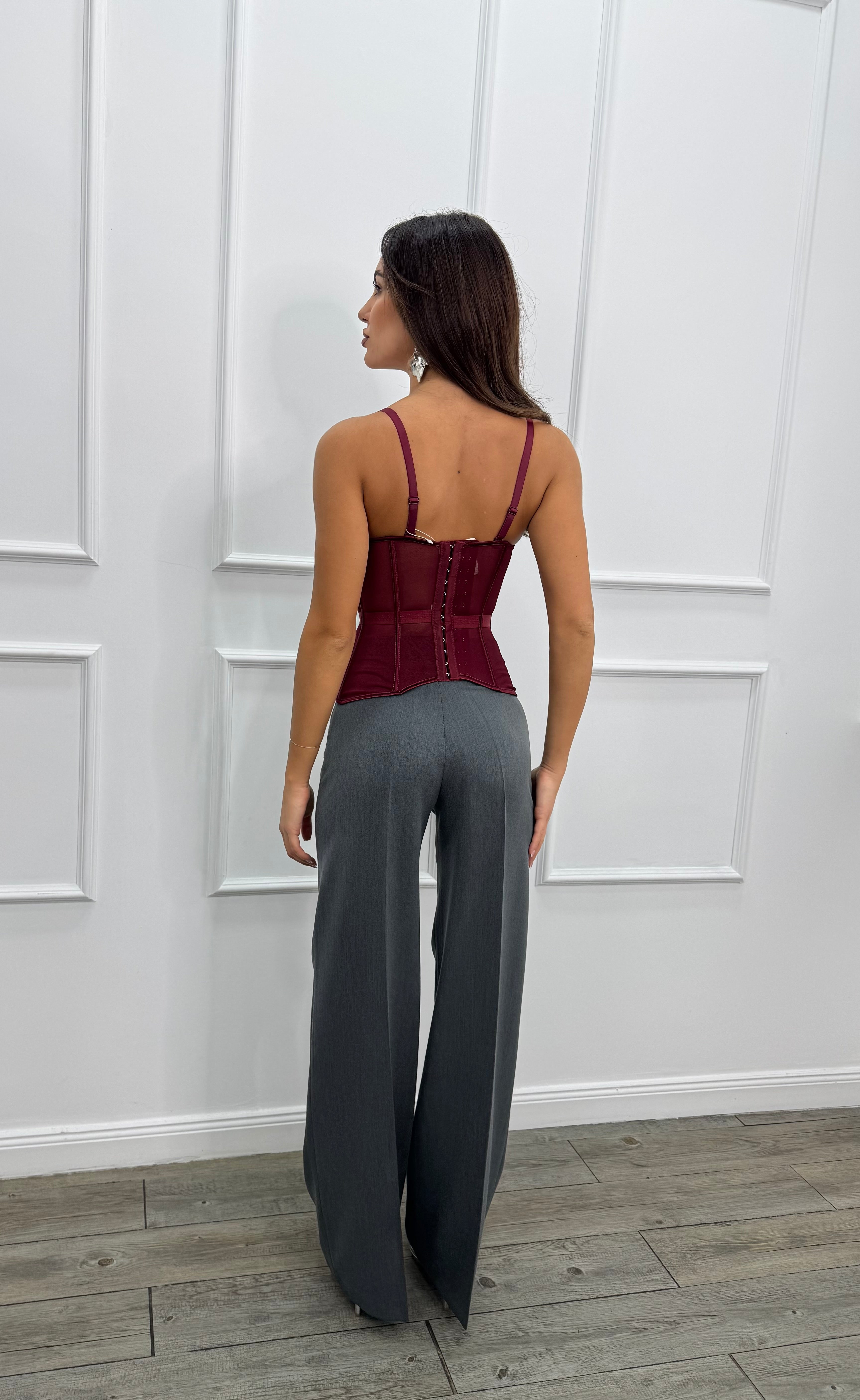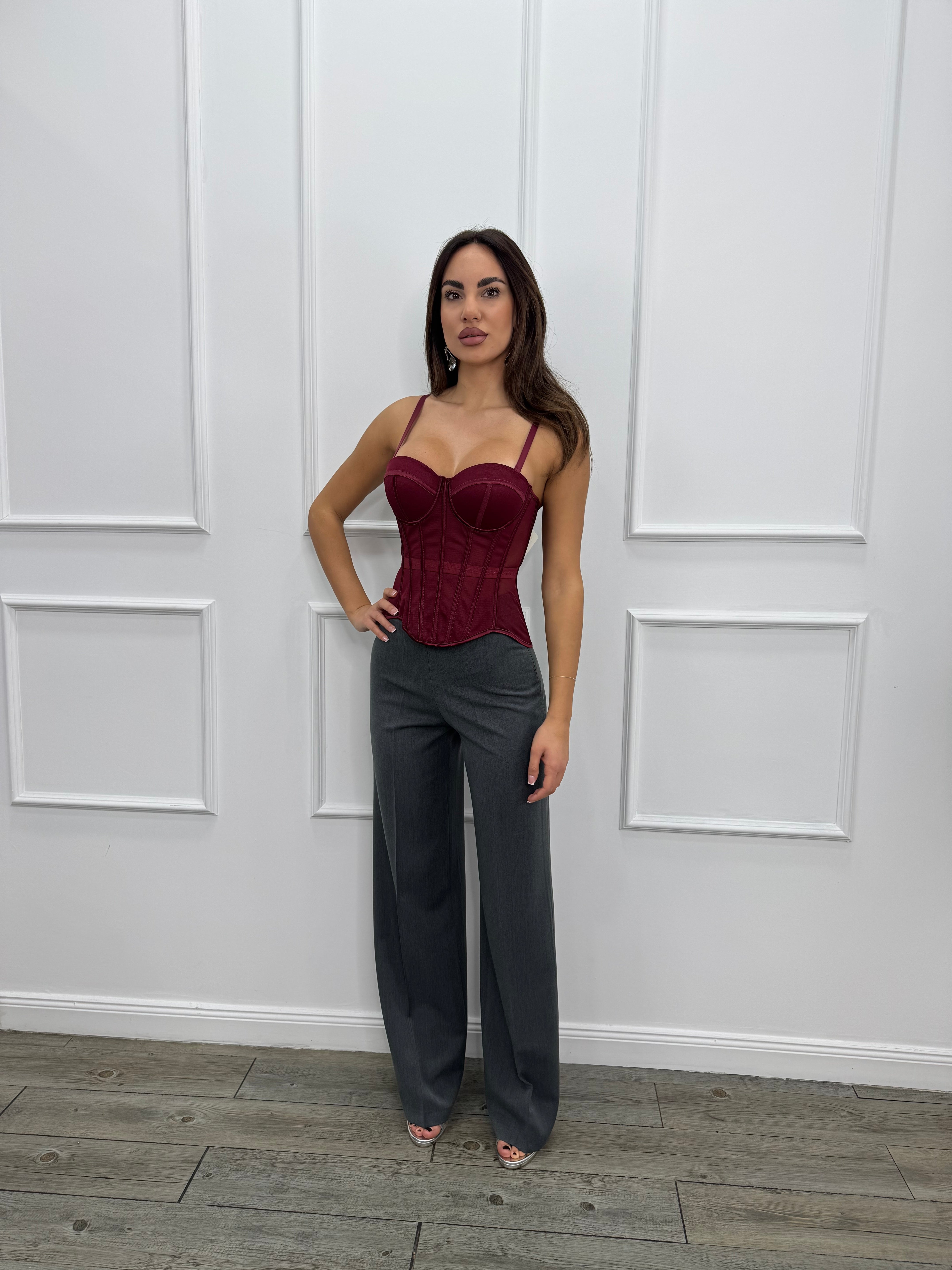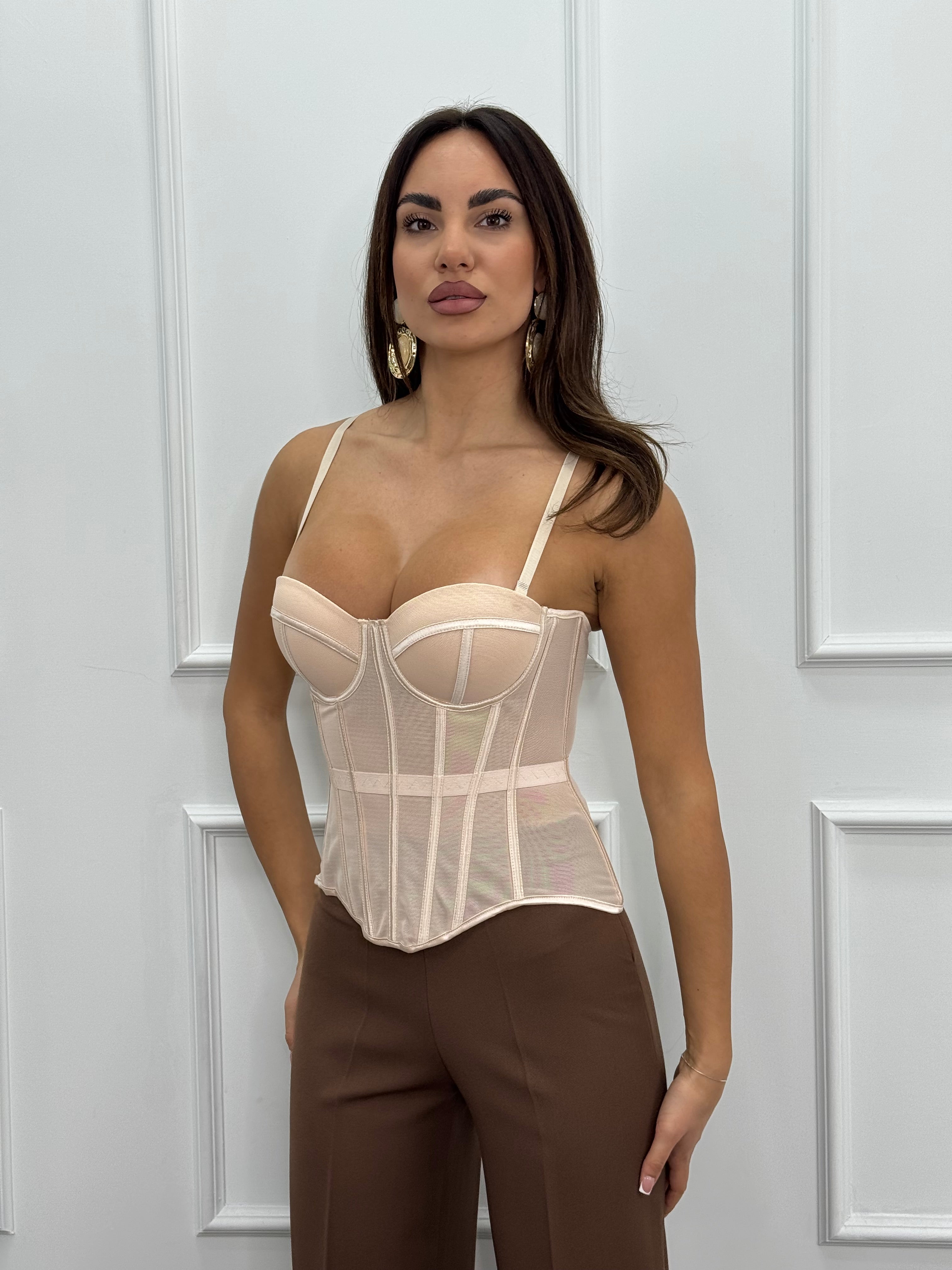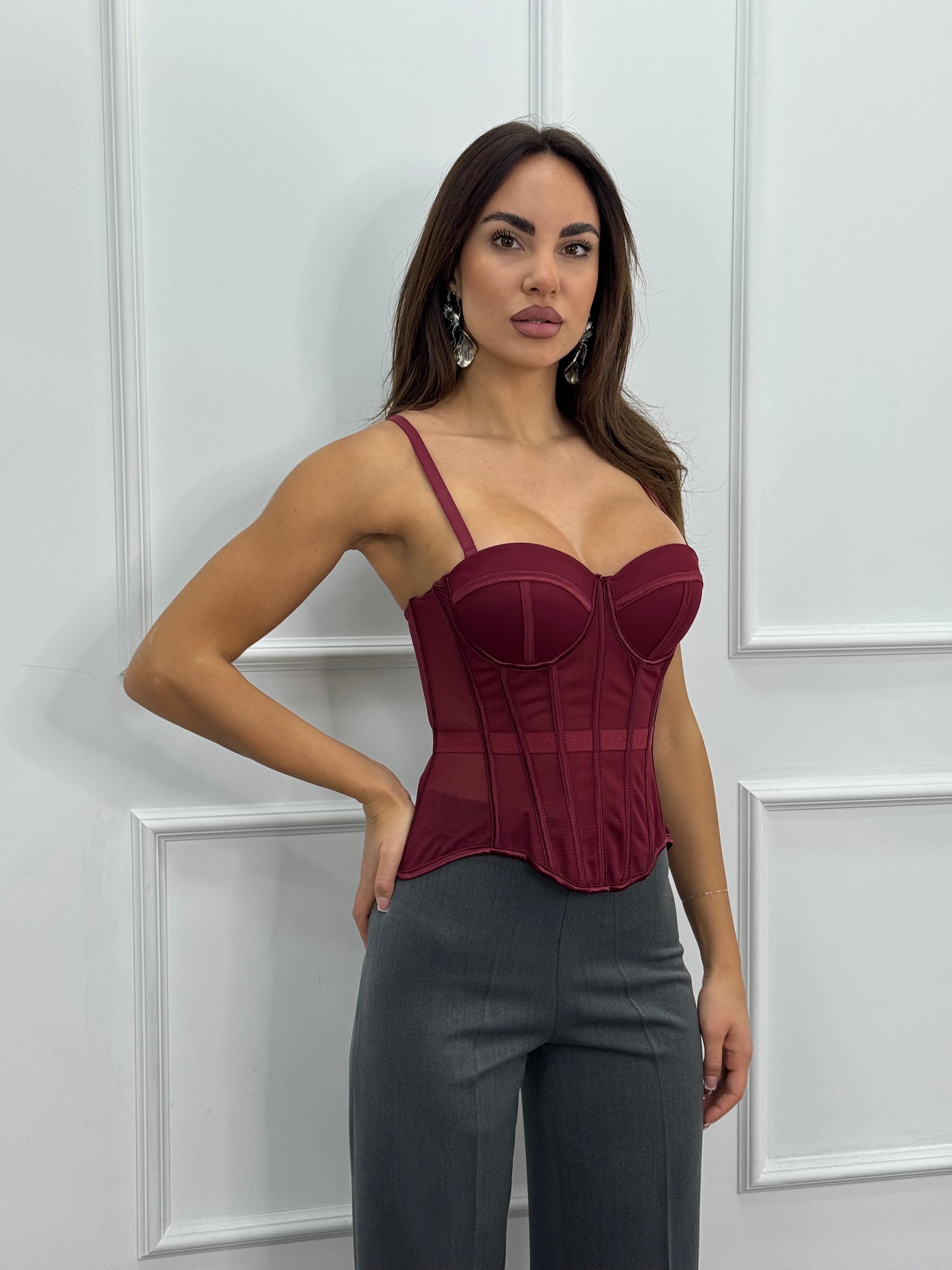 Corpetto steccato con coppe preformate, e bretelle rimovibili e regolabili.