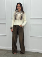 La modella è alta 1,70 cm ed indossa una taglia 40 italiana.