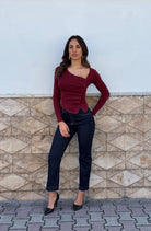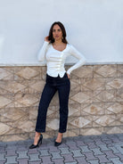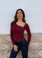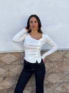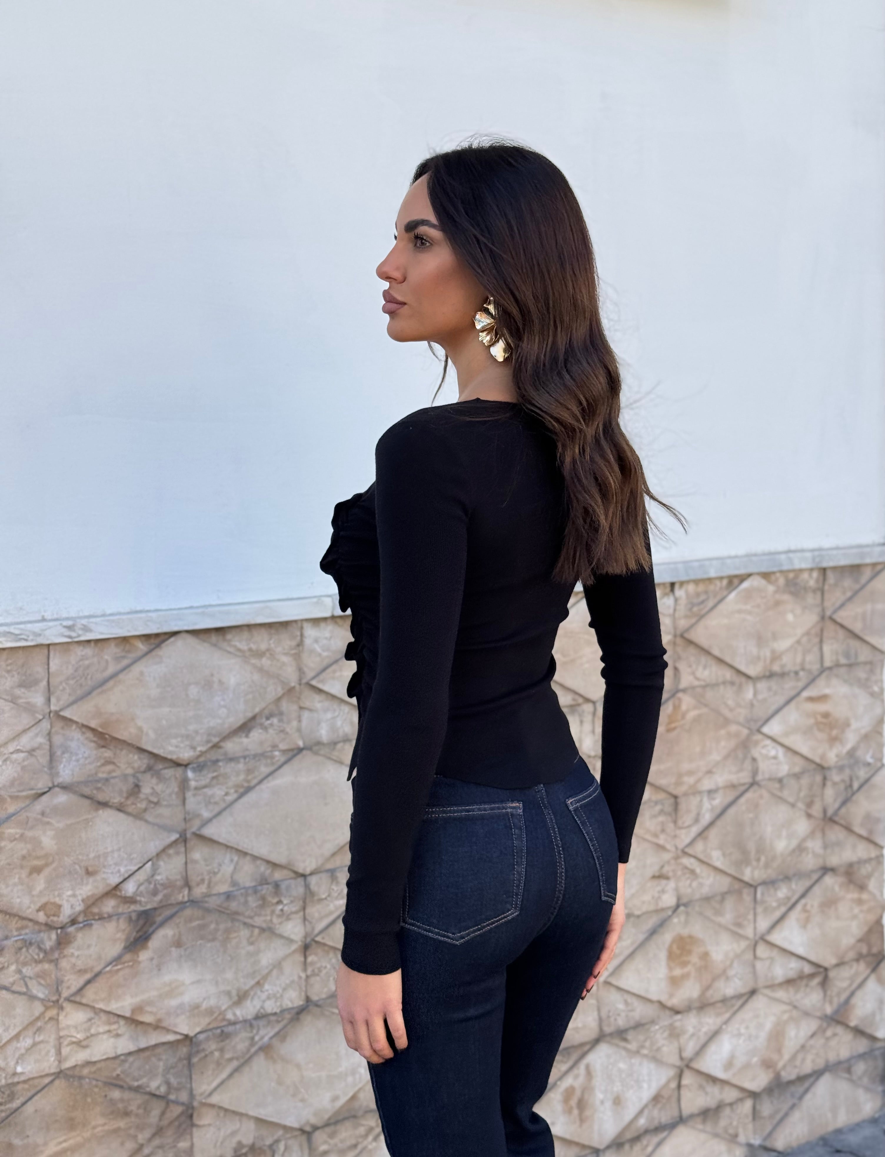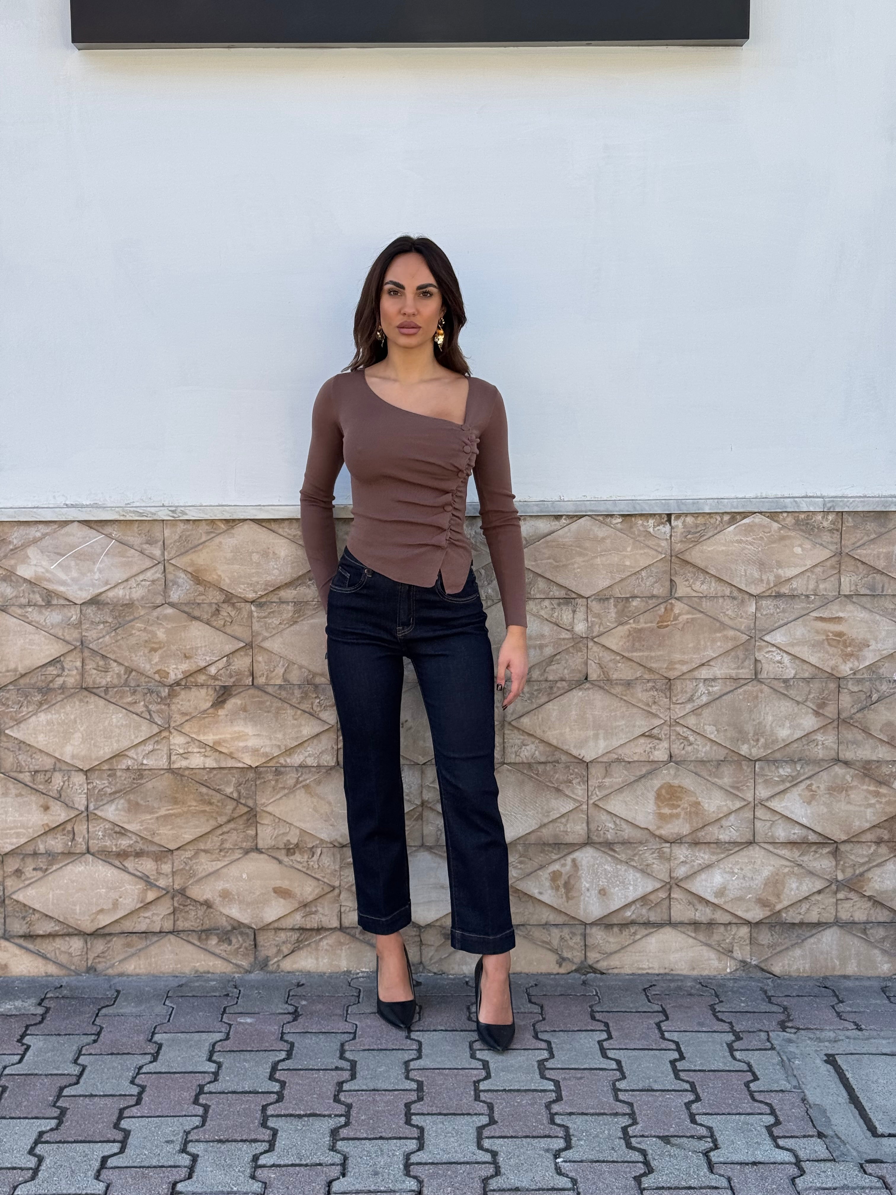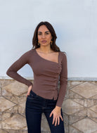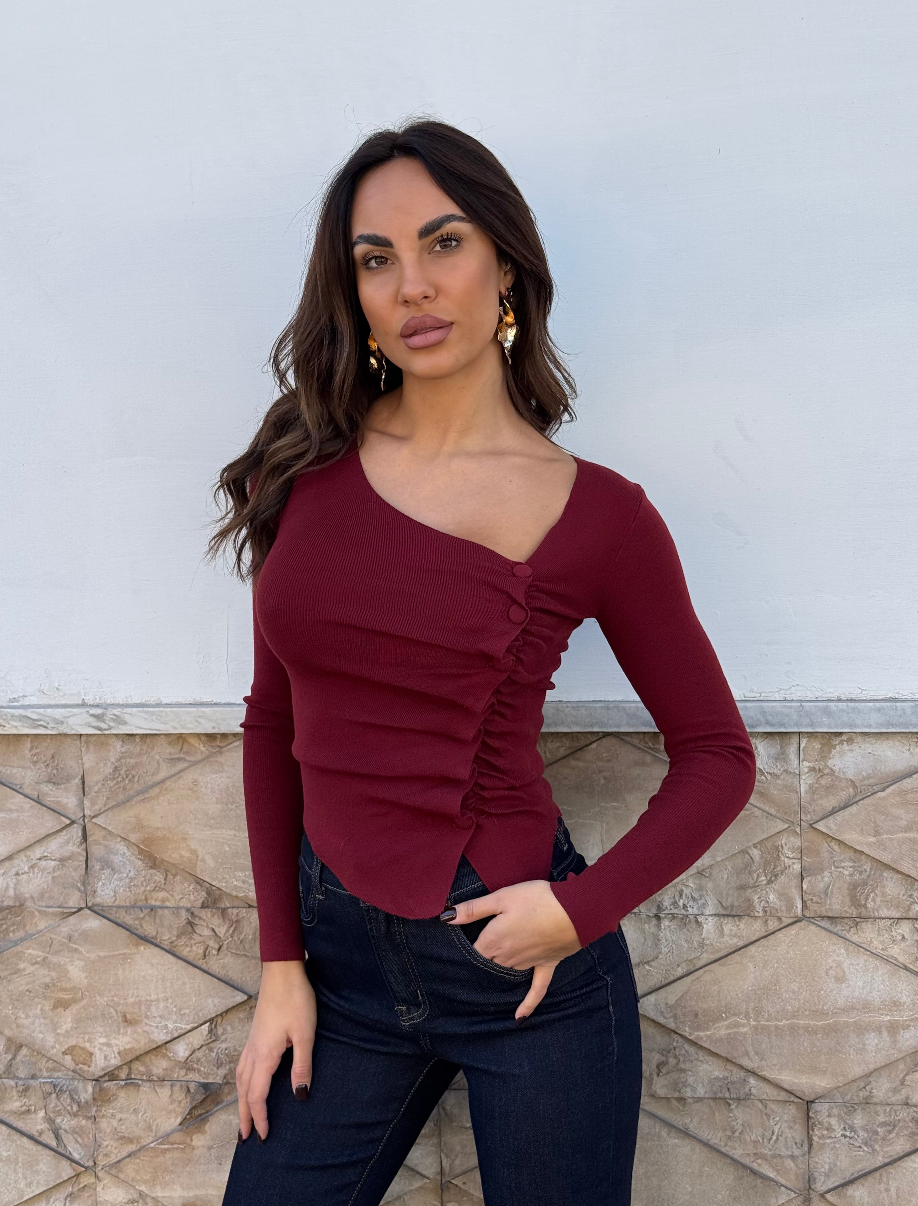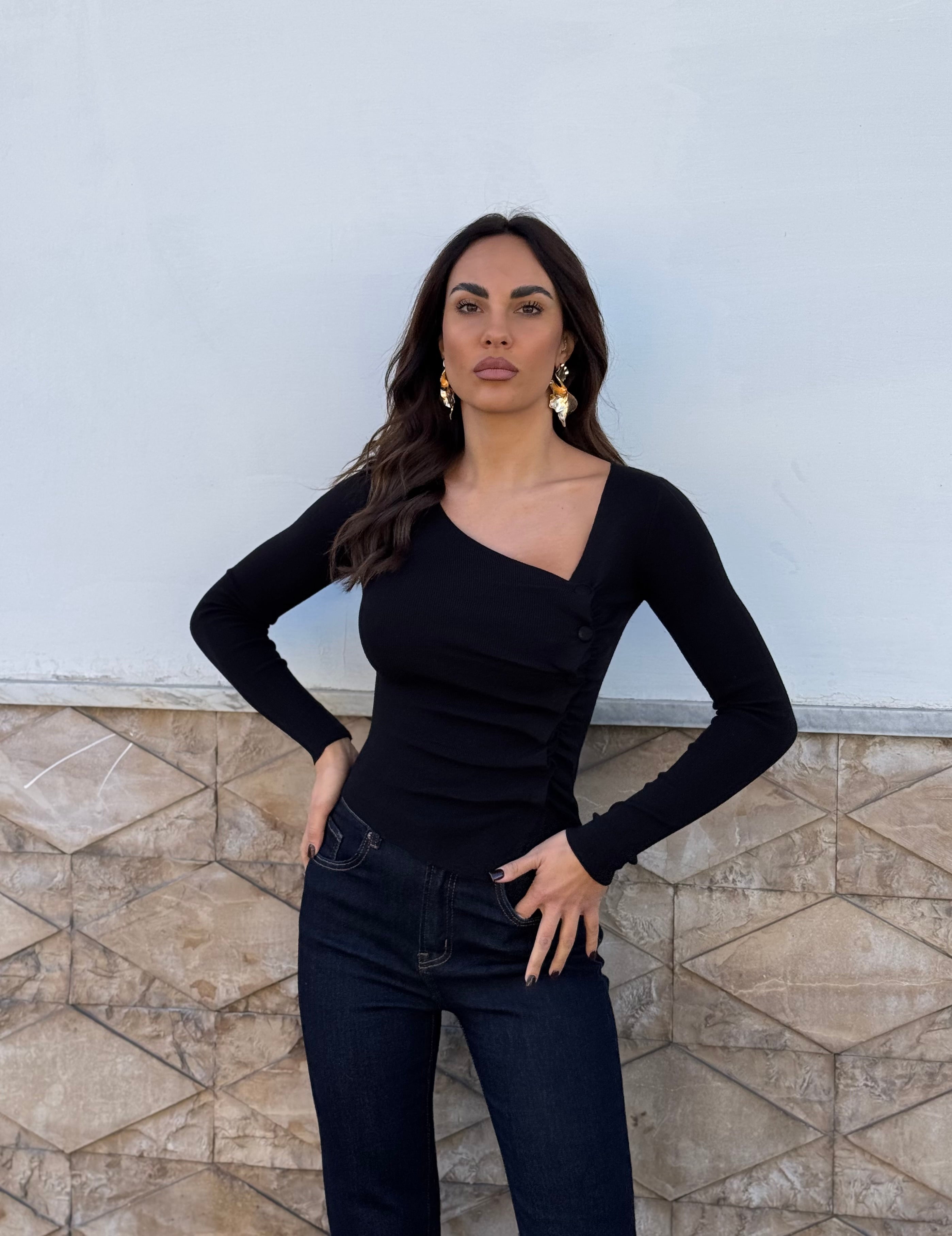 Maglia con drappeggio e finti bottoni laterali .