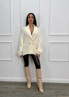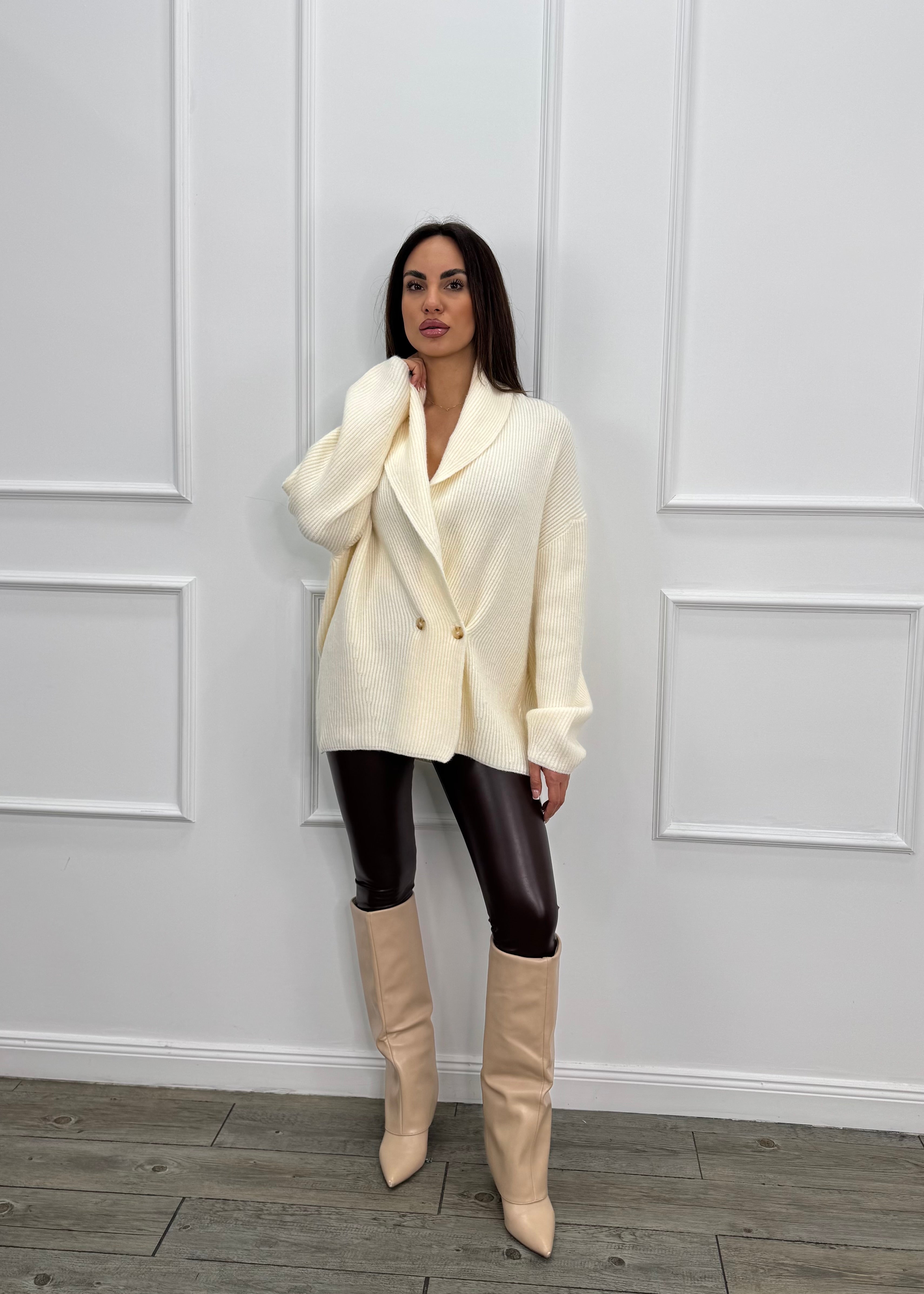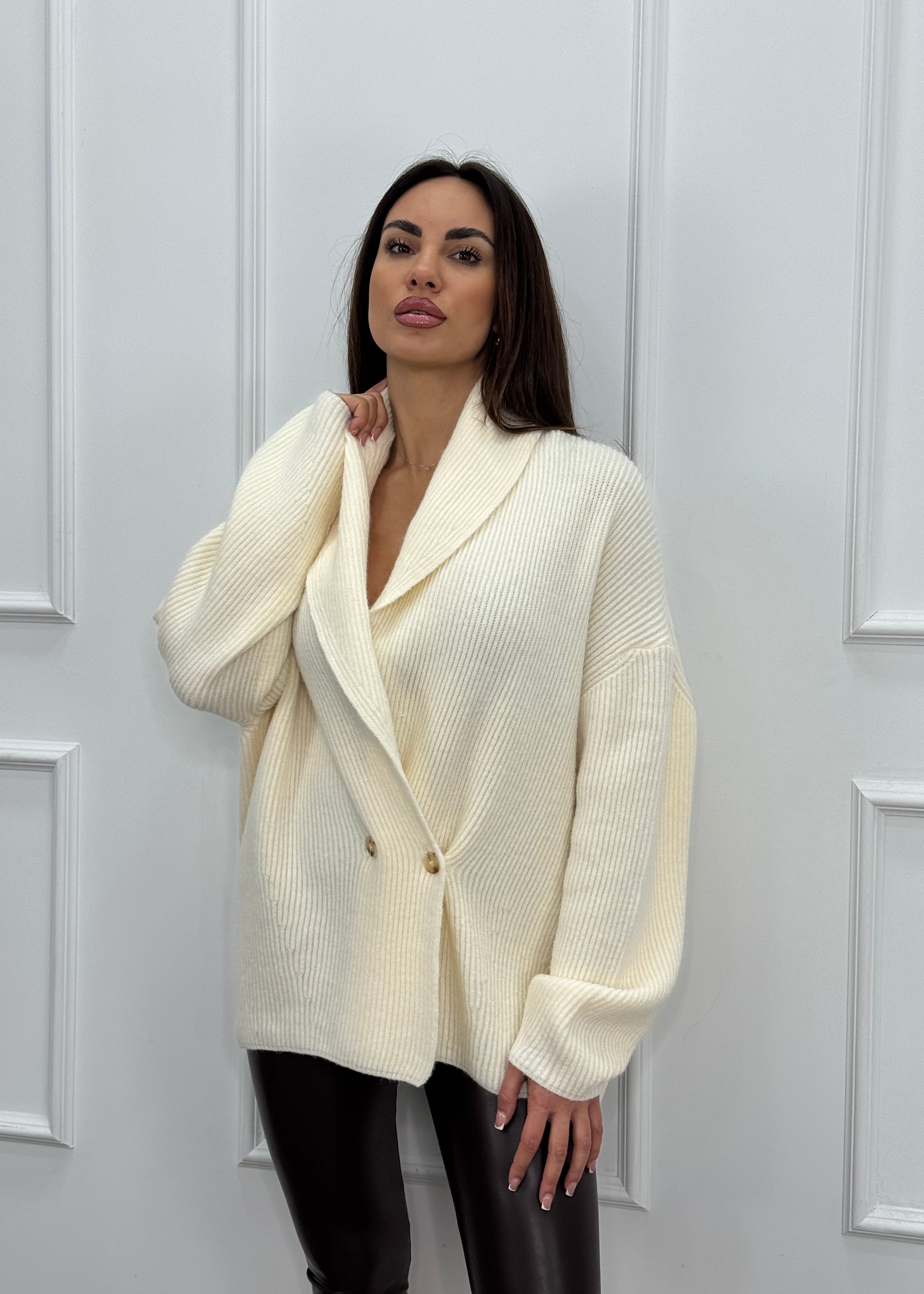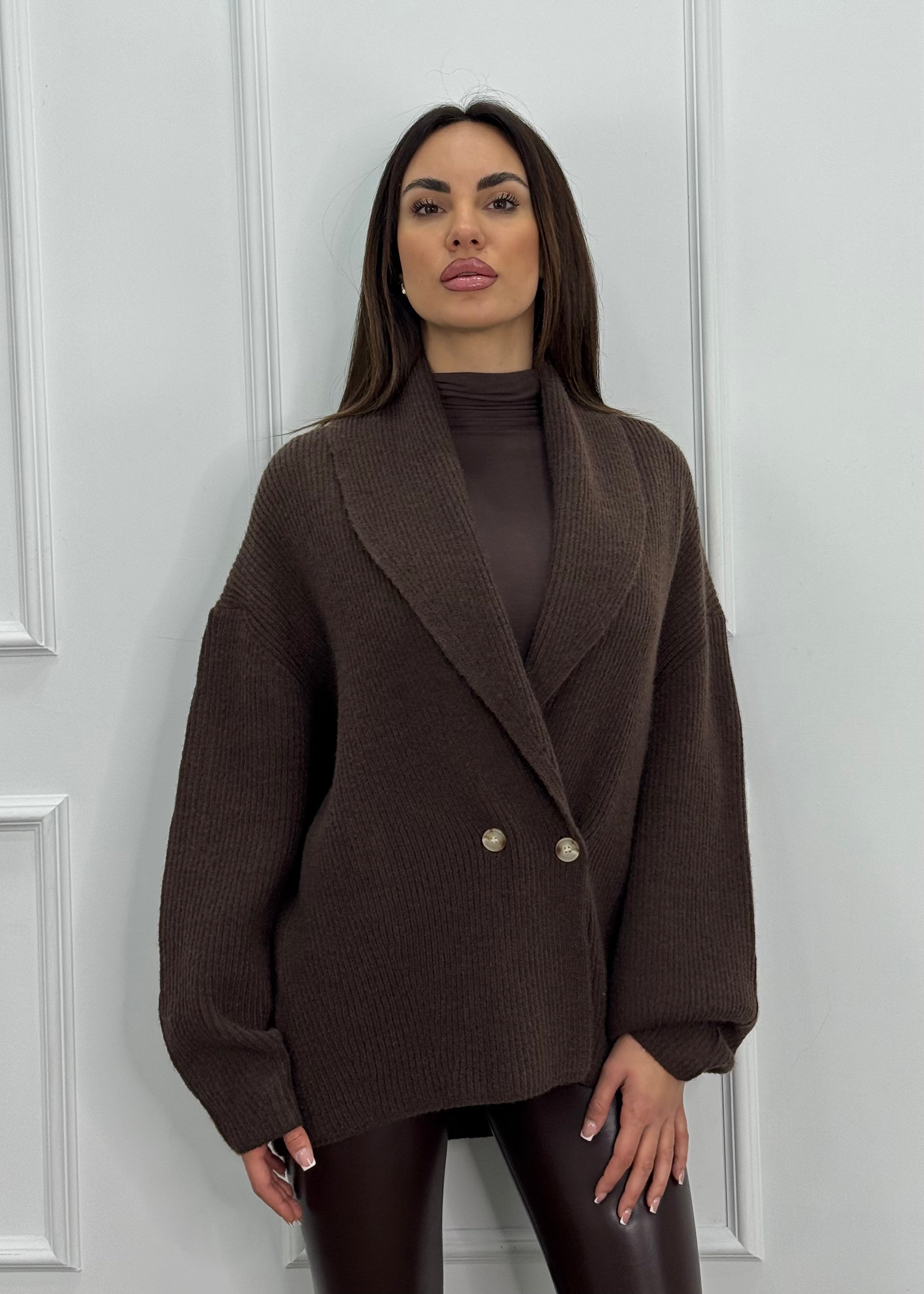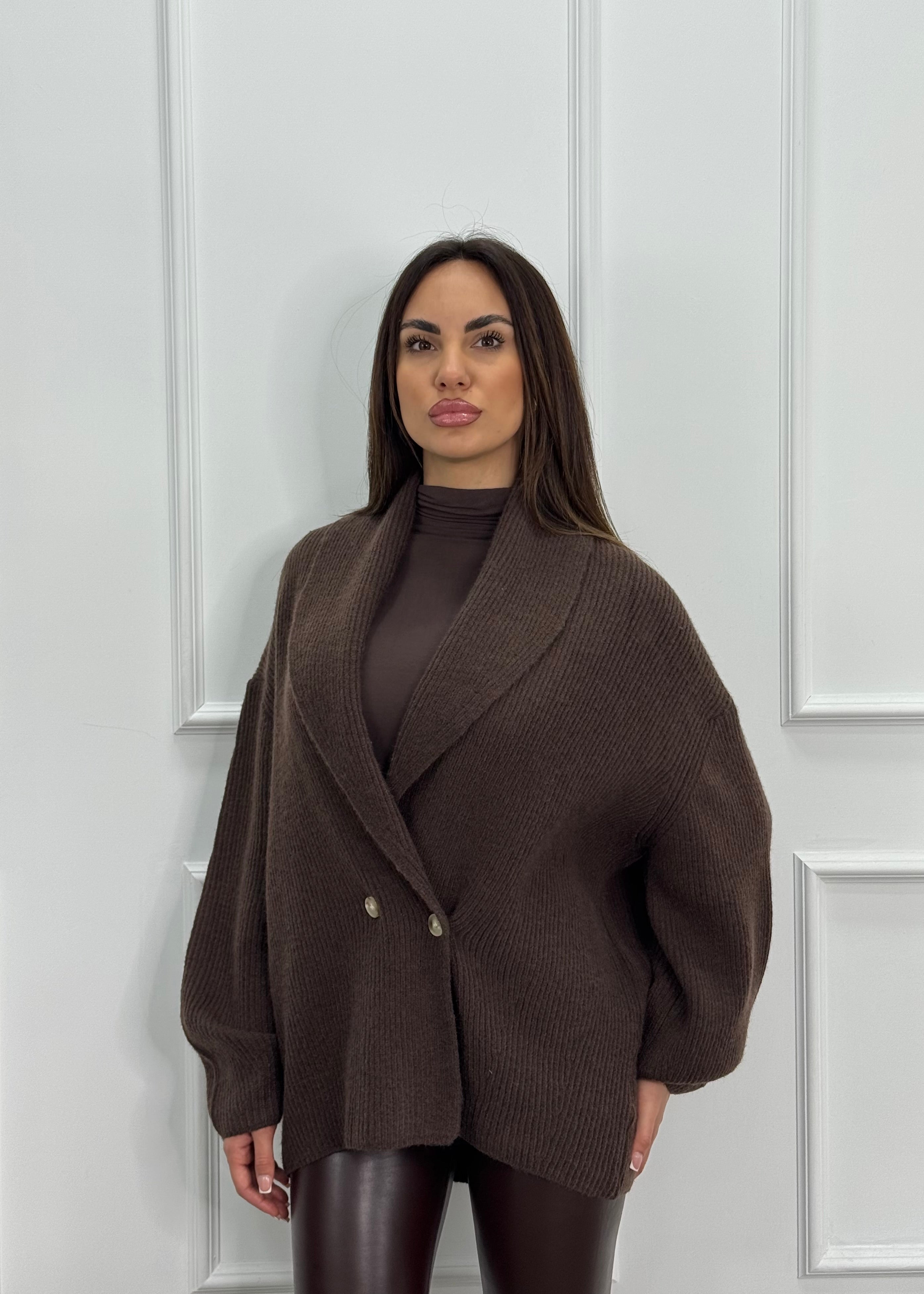 Maxi cardigan con collo revers e chiusura in bottoni a doppiopetto.