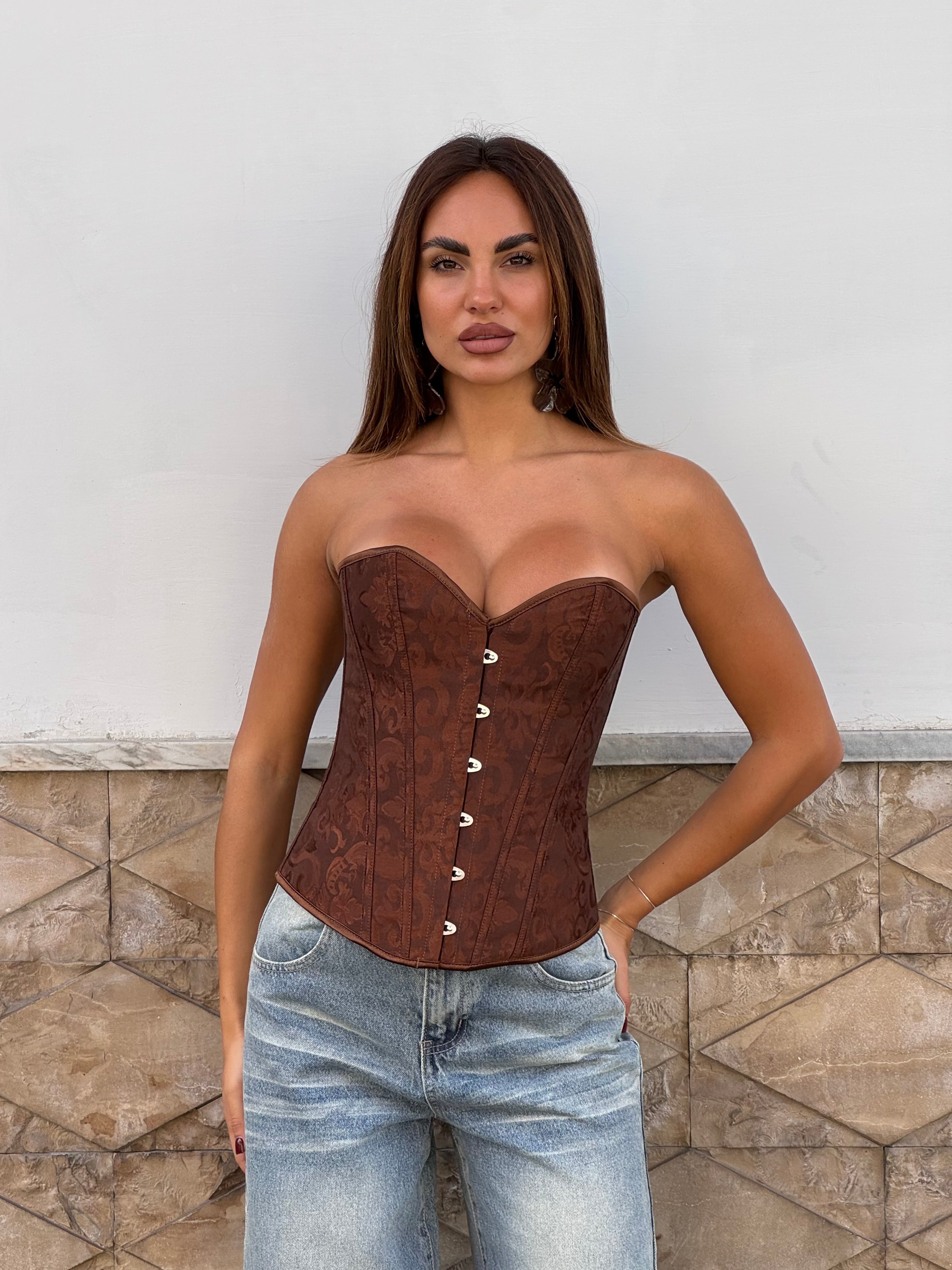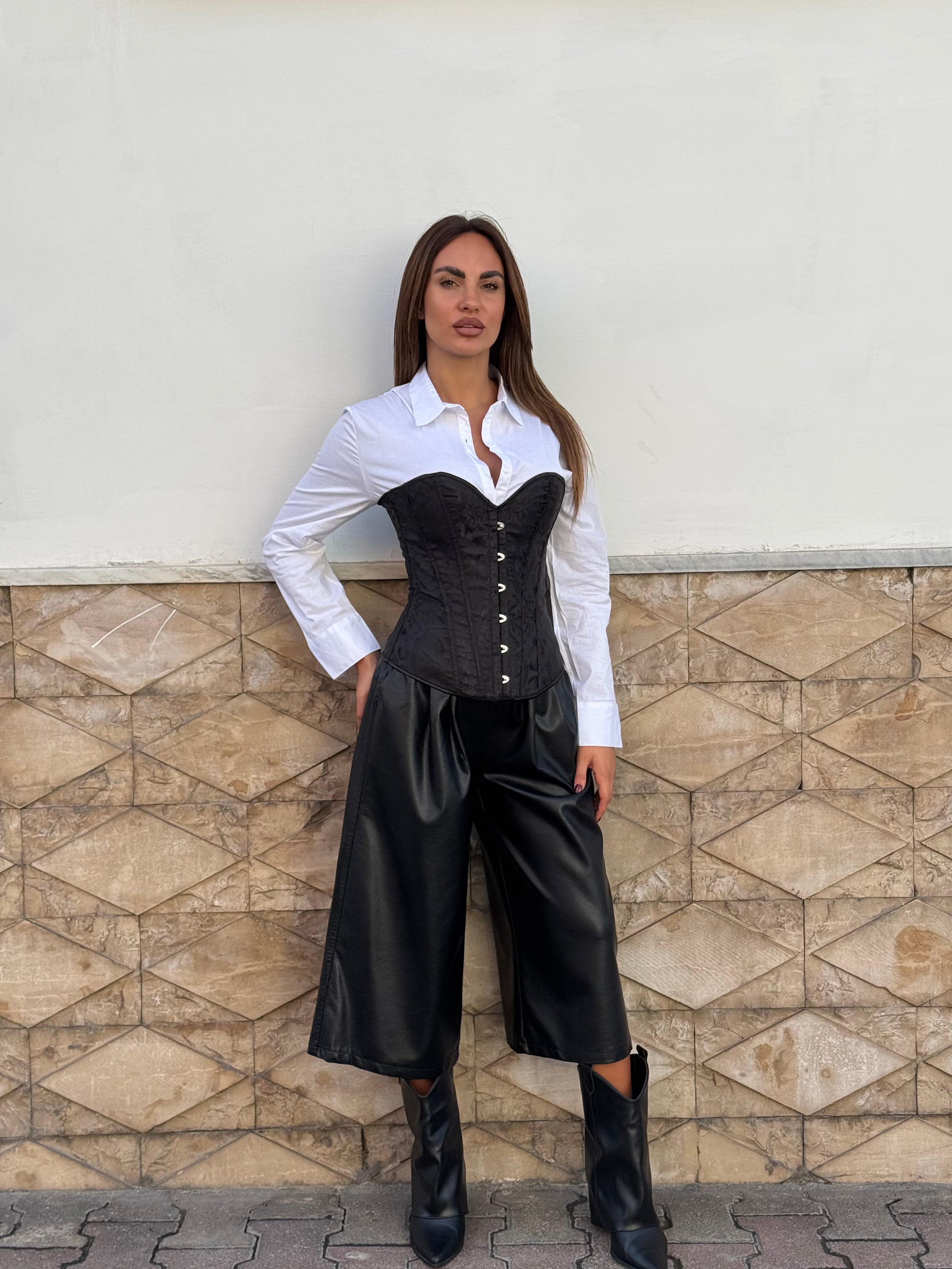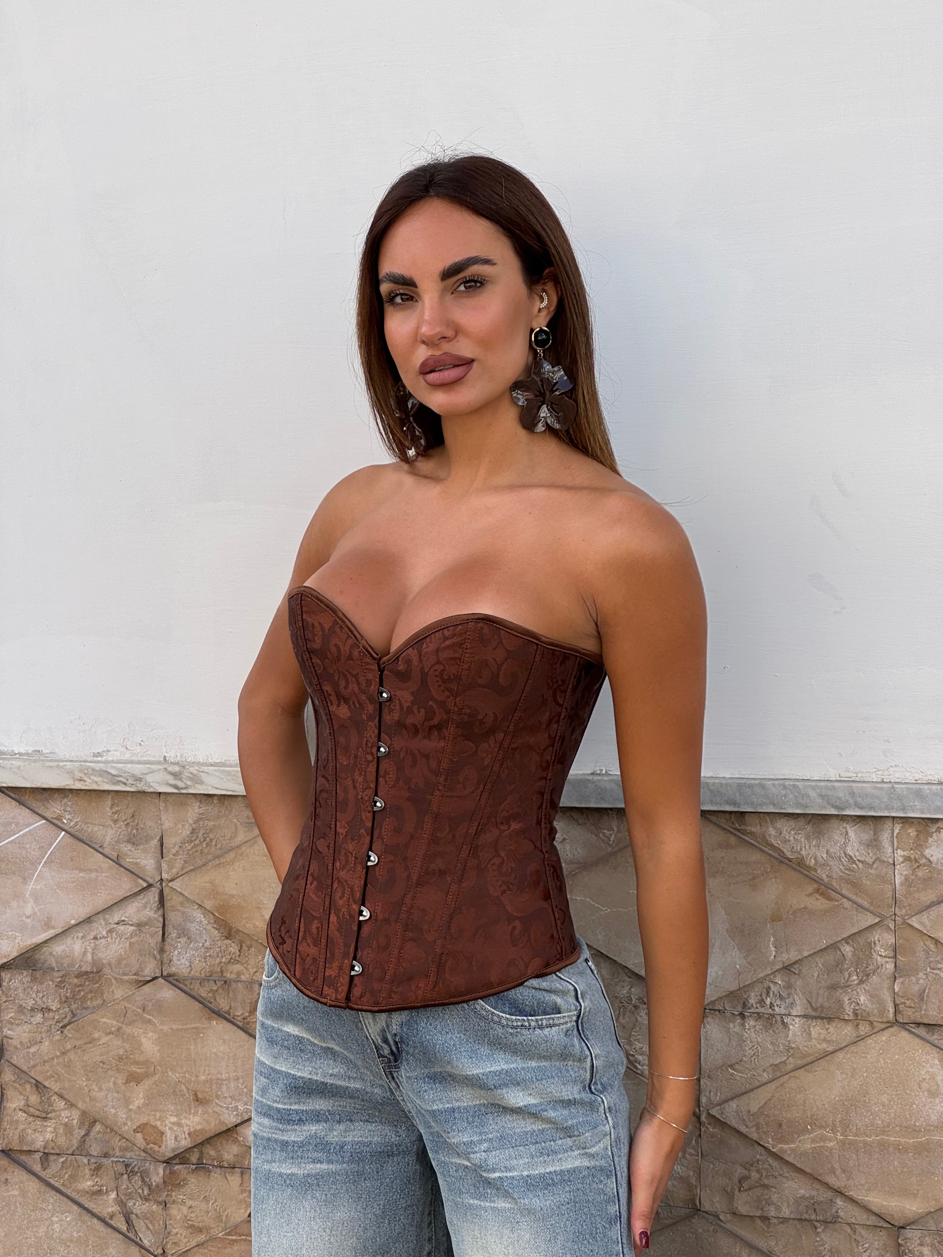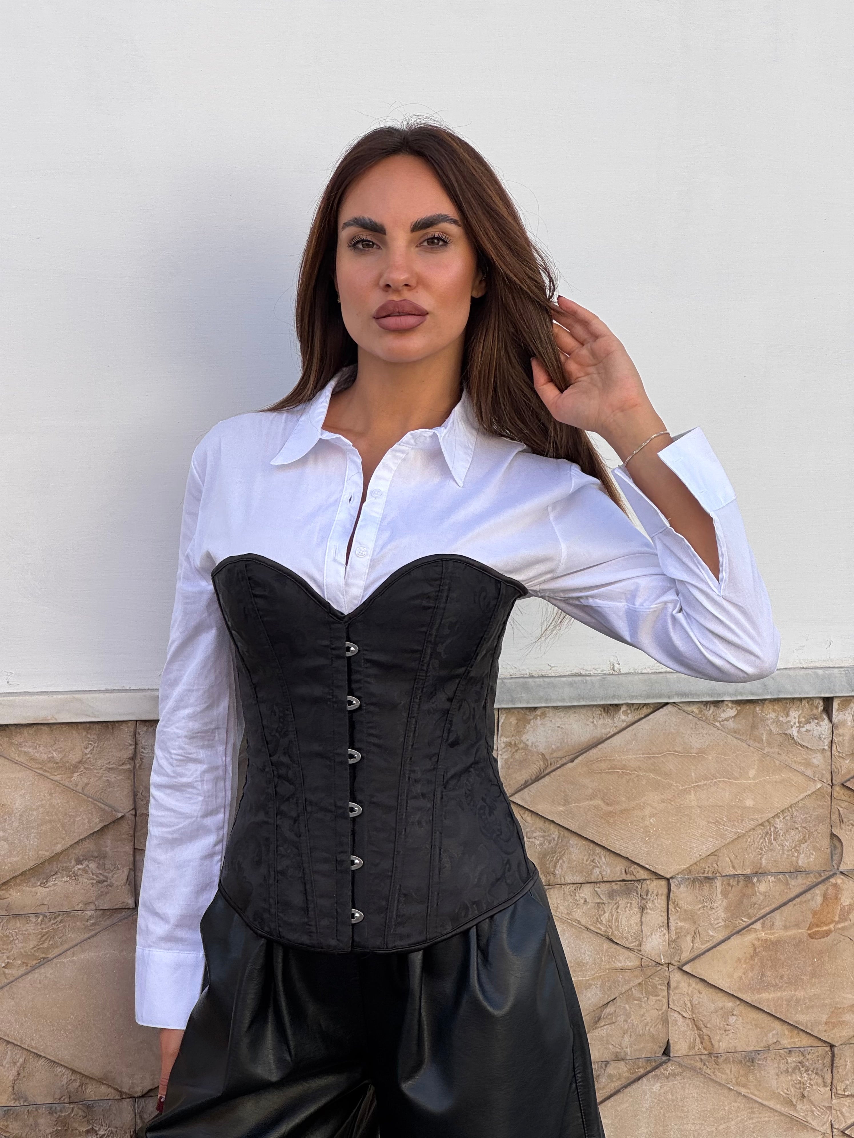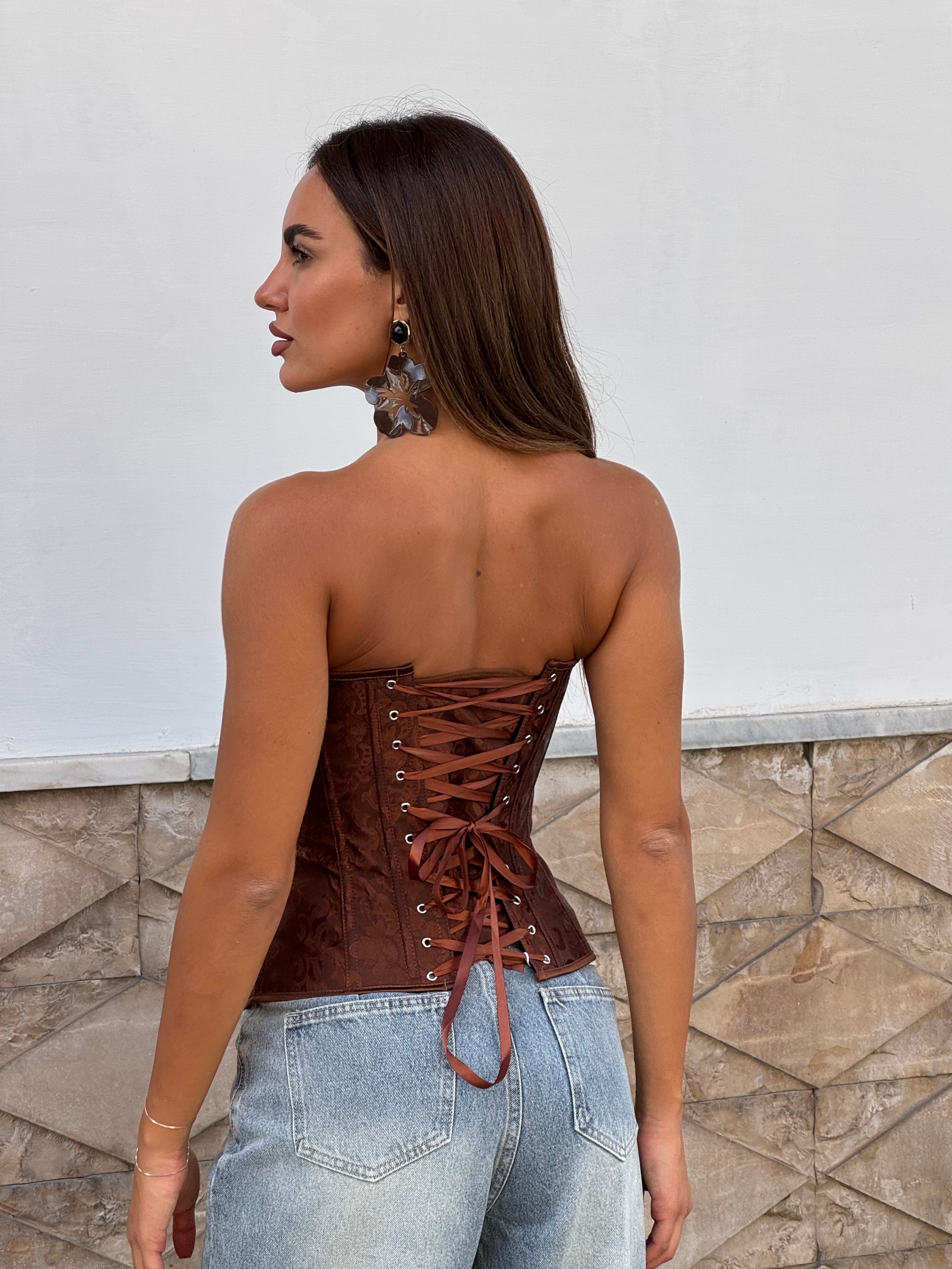 Chiusura in gancetti su davanti e stringhe regolabile sul retro.