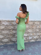 Meraviglio abito bandage con dettagli in ruches che avvolgono il corpo aggiungendo un' eleganza unica.