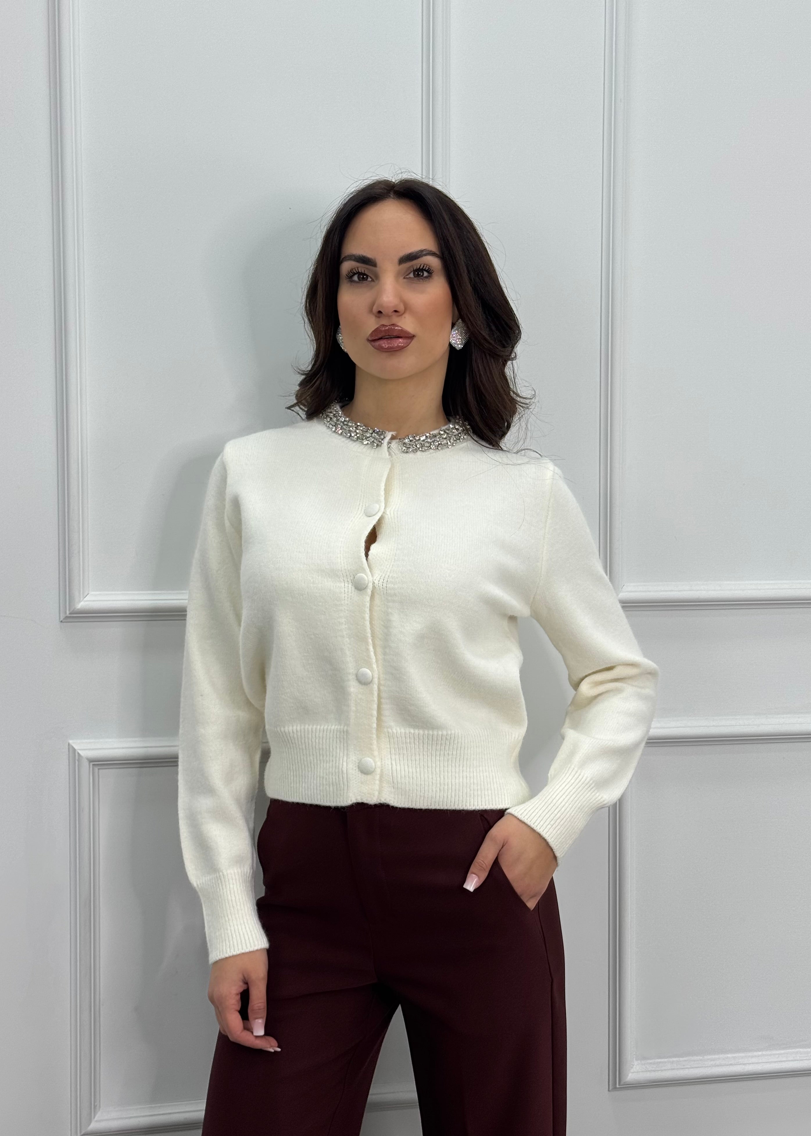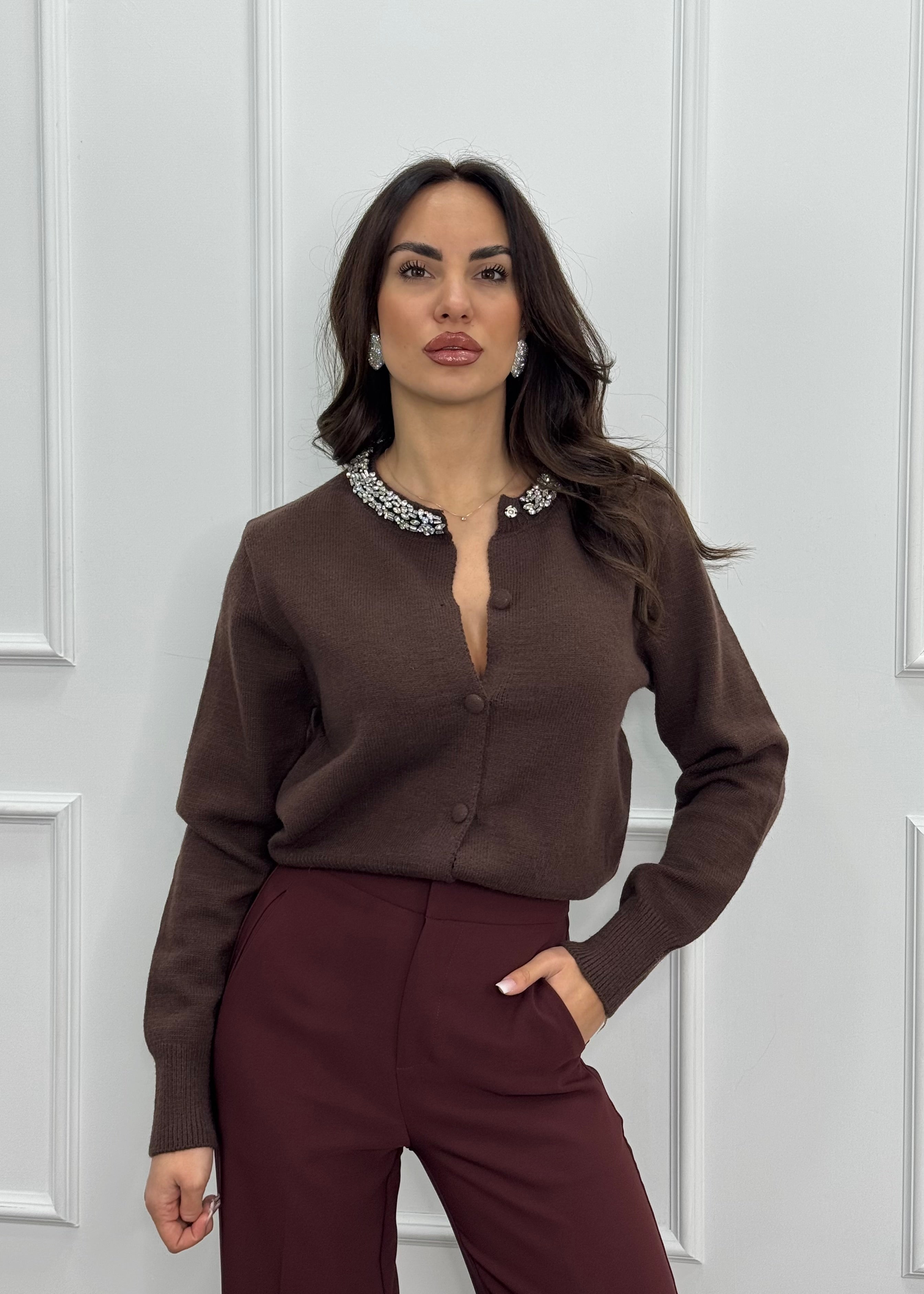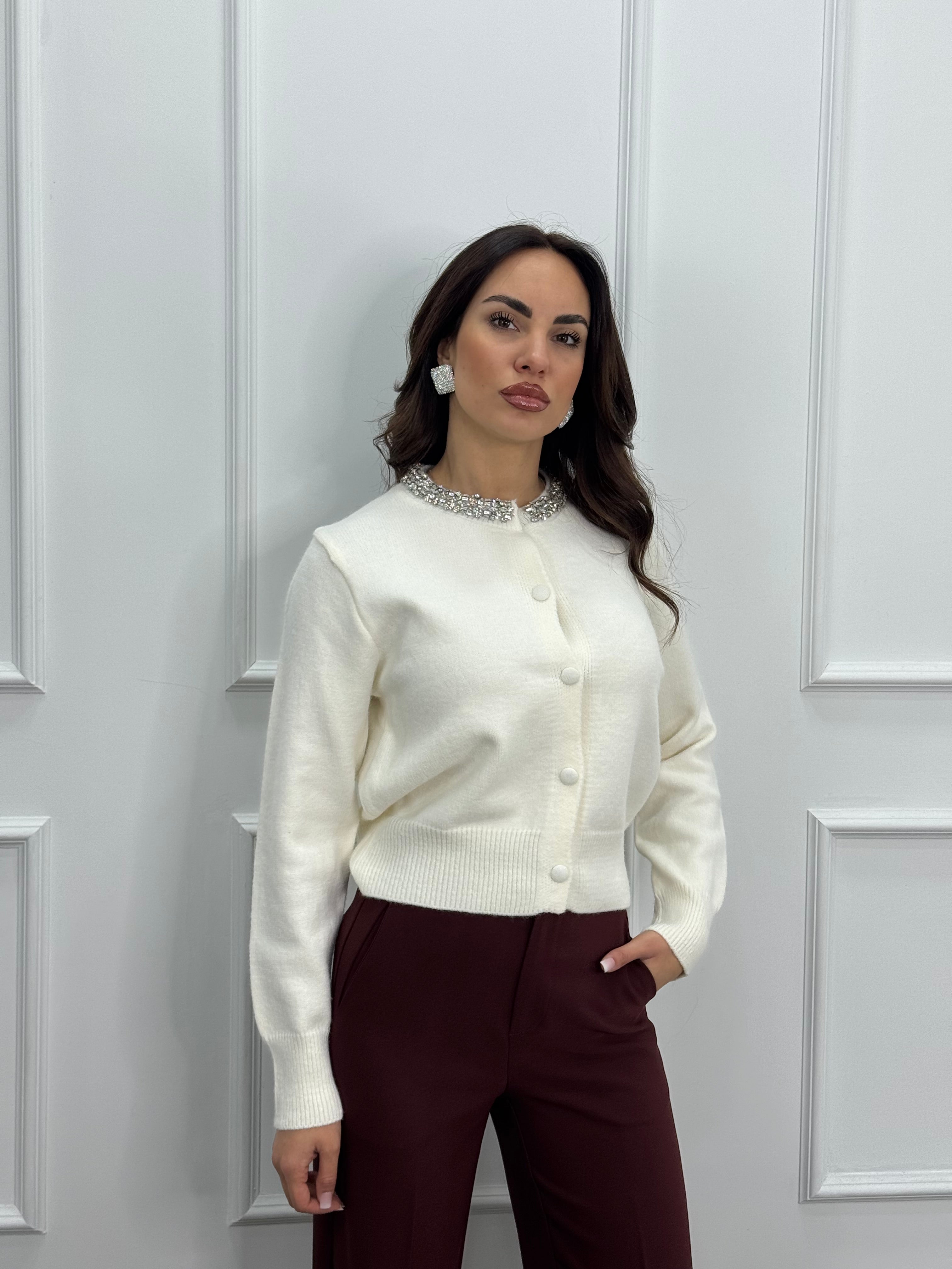 Cardigan in lana con chiusura sul davanti in bottoni ricoperti in tessuto-