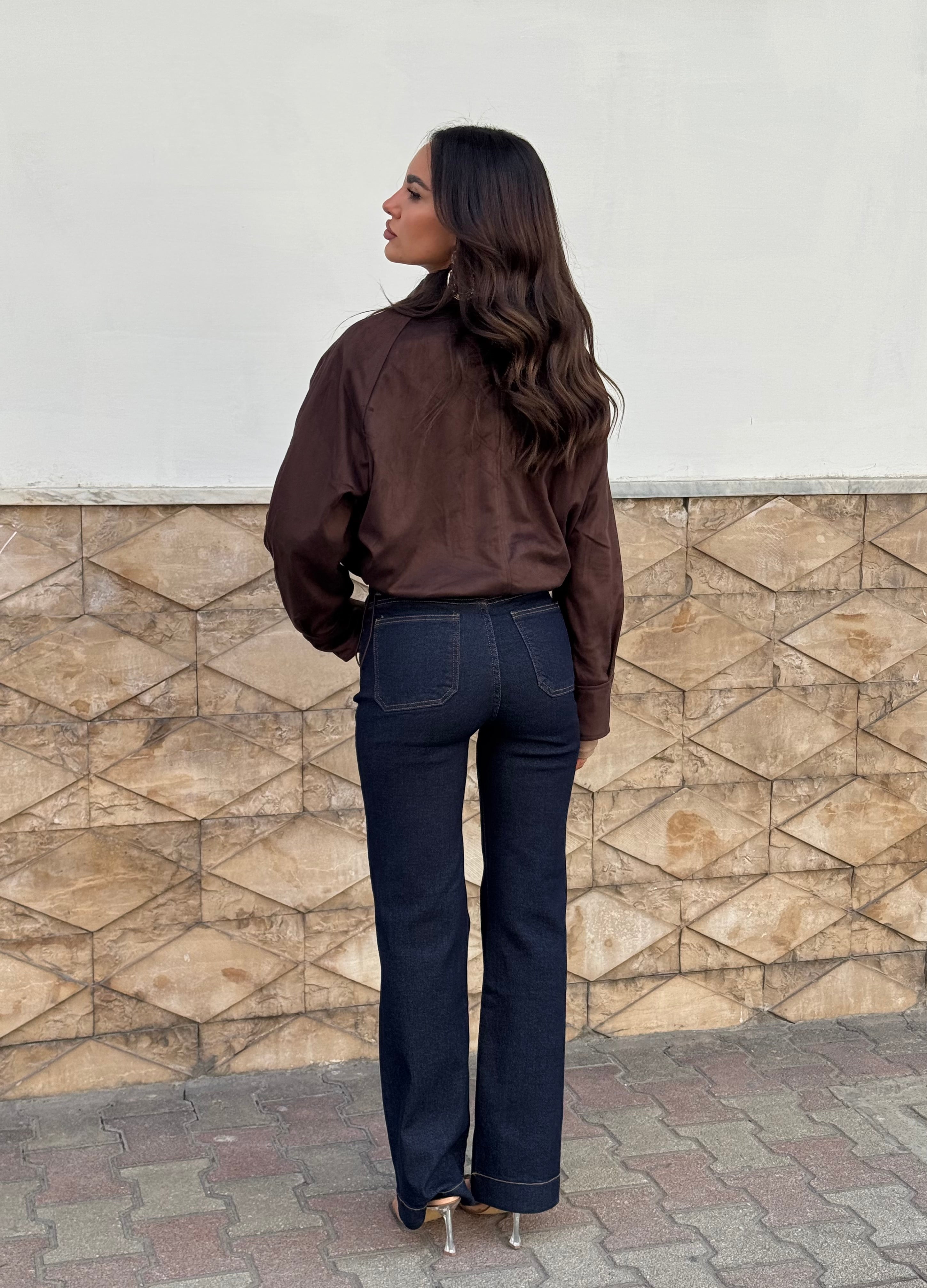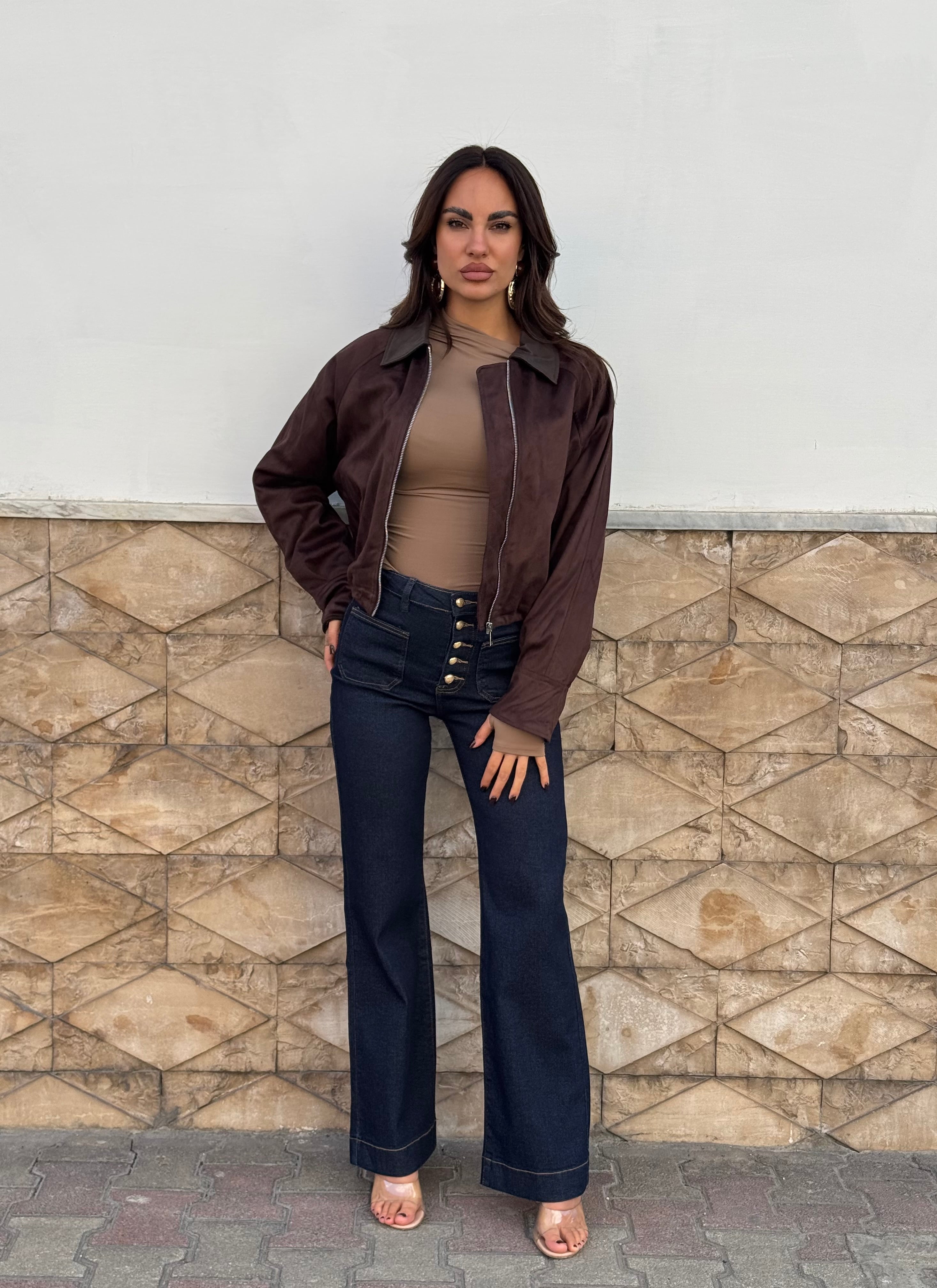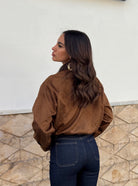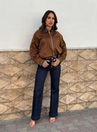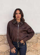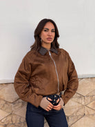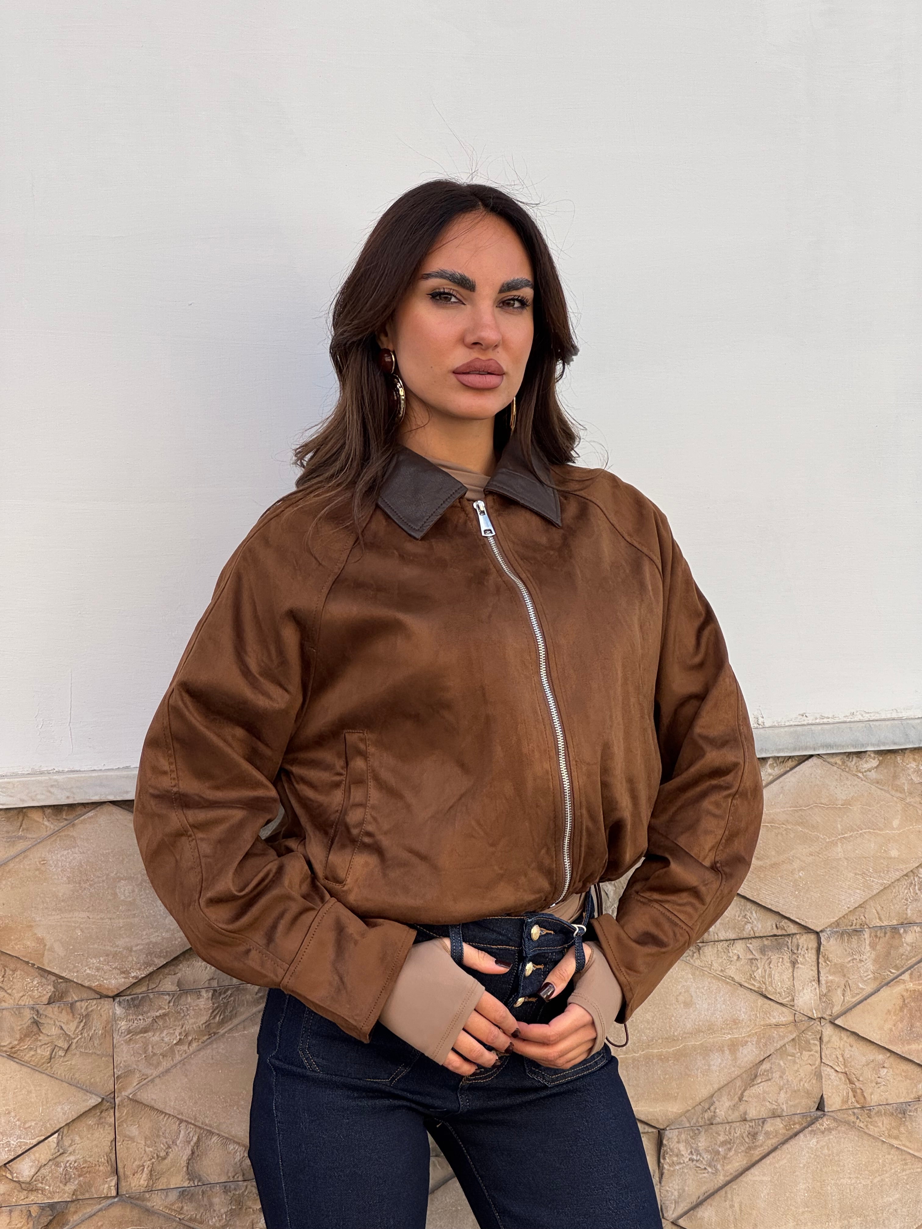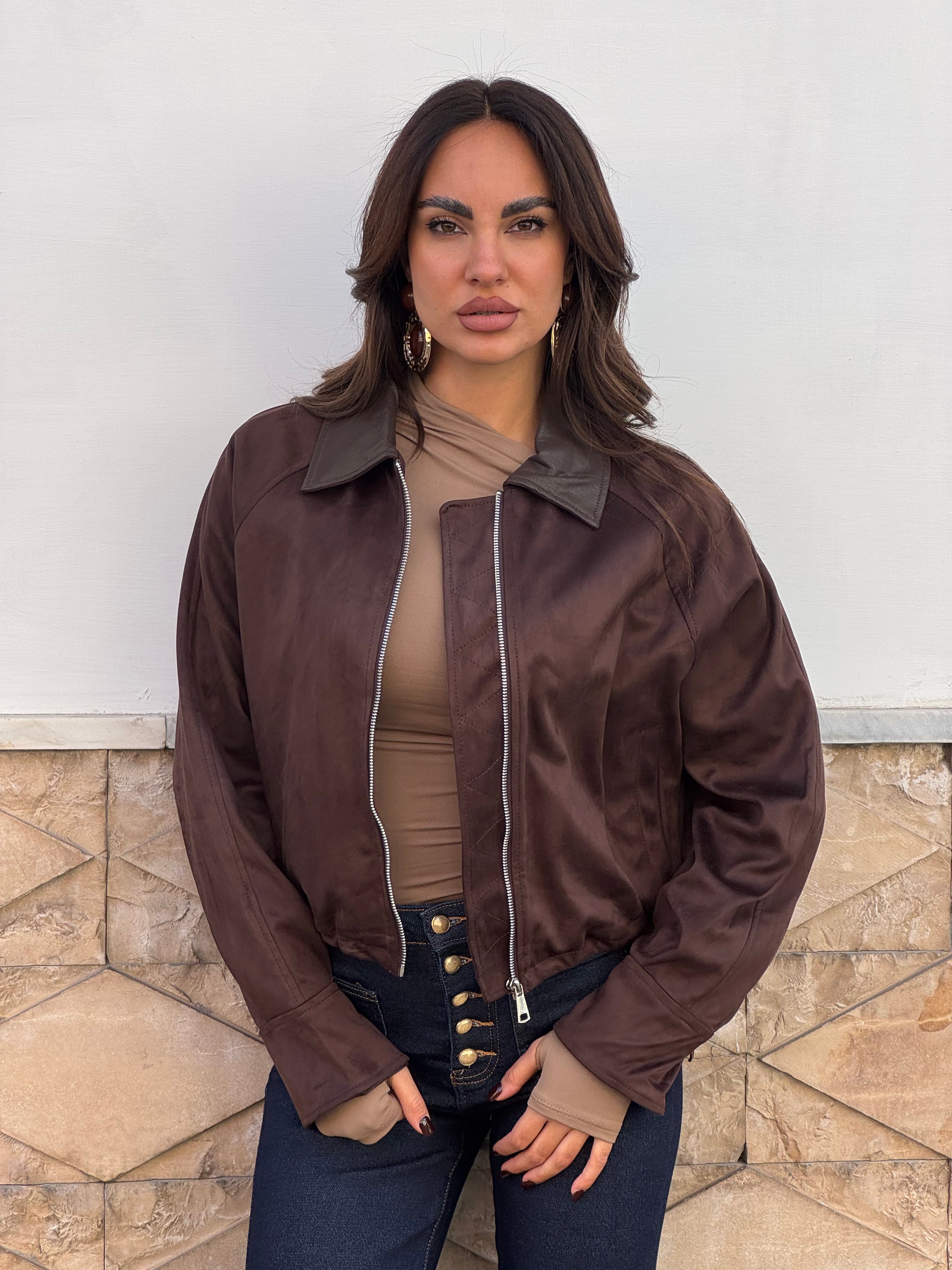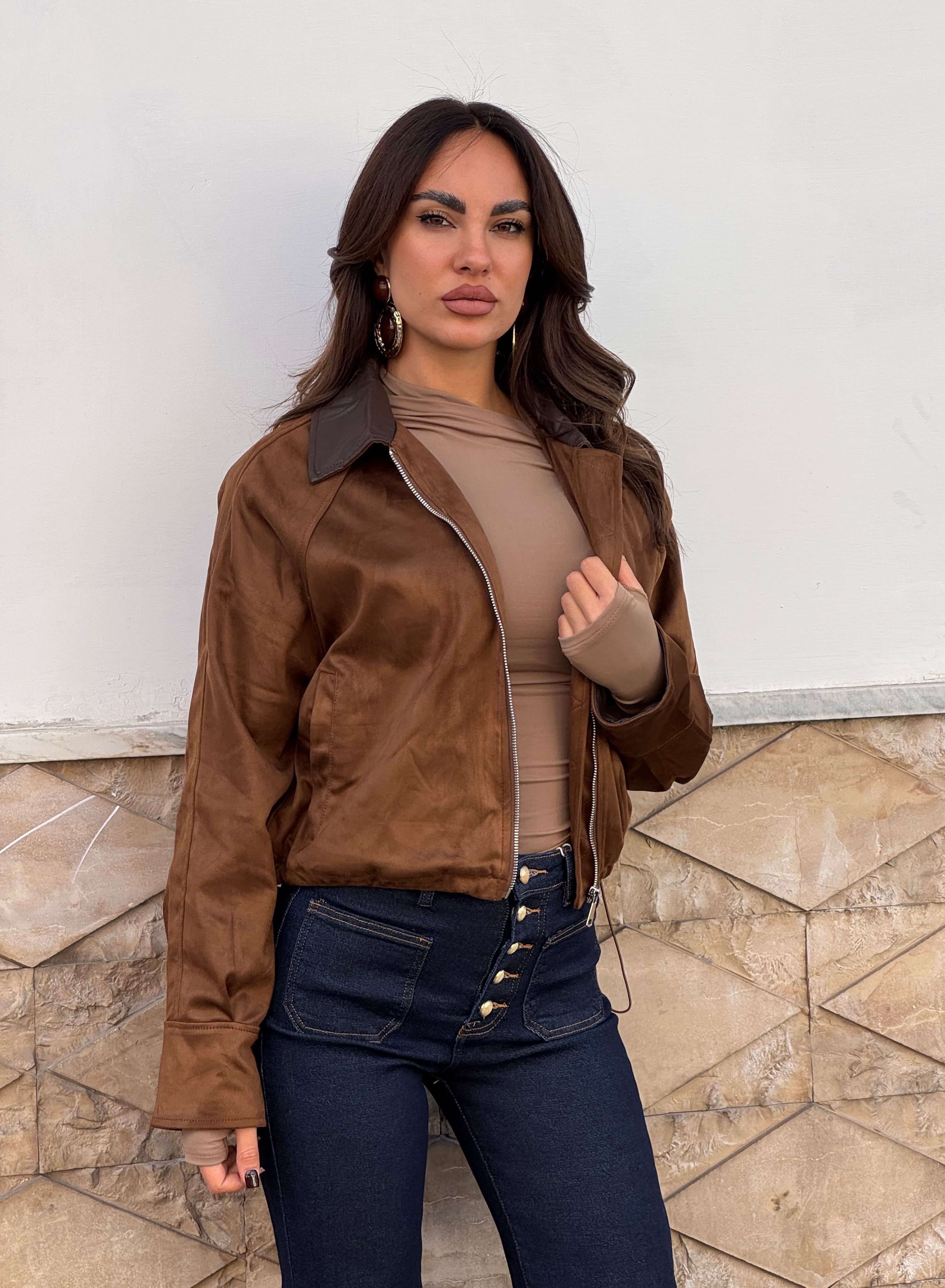 Giubbino leggero in effetto camoscio con colletto in similpelle.