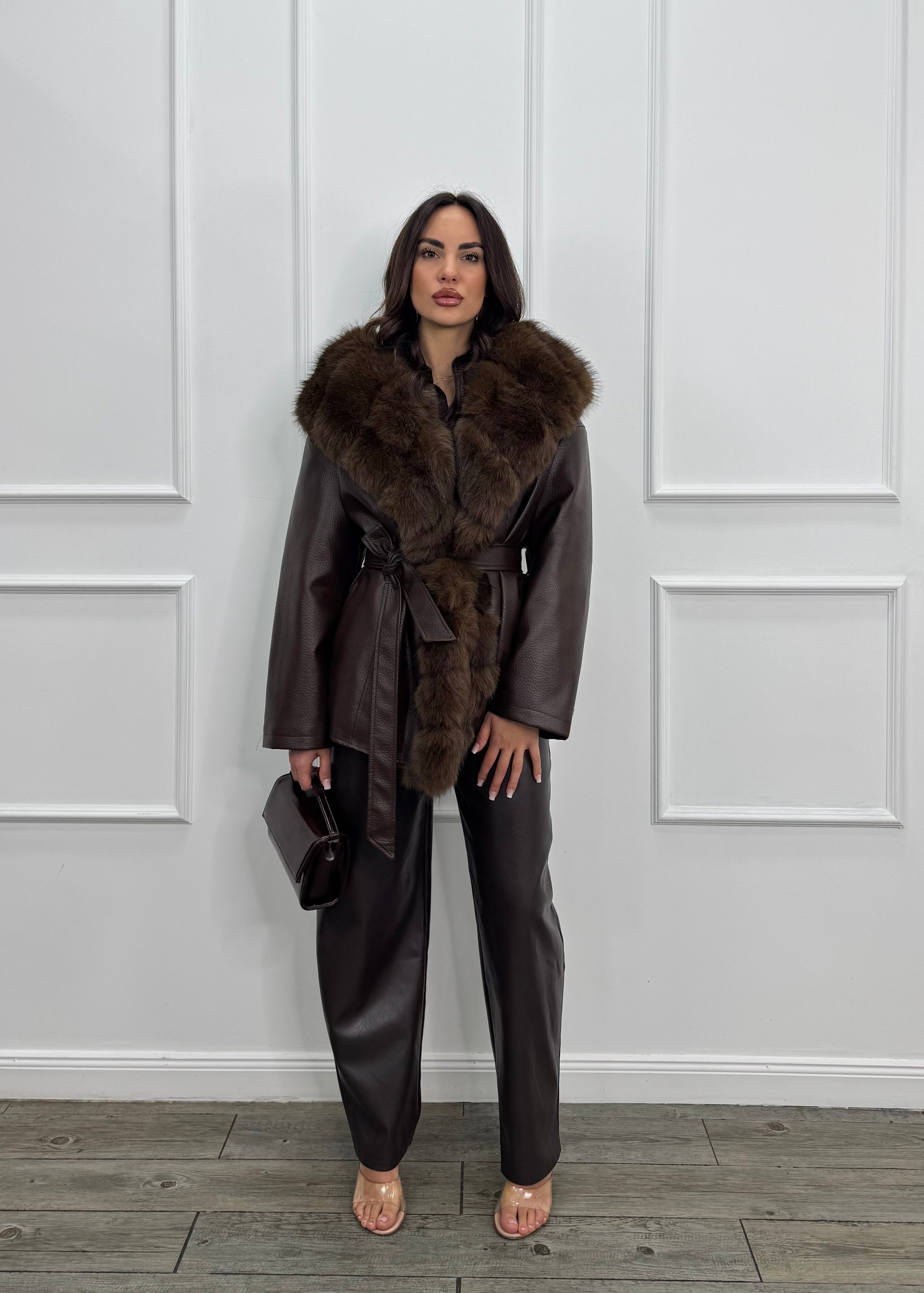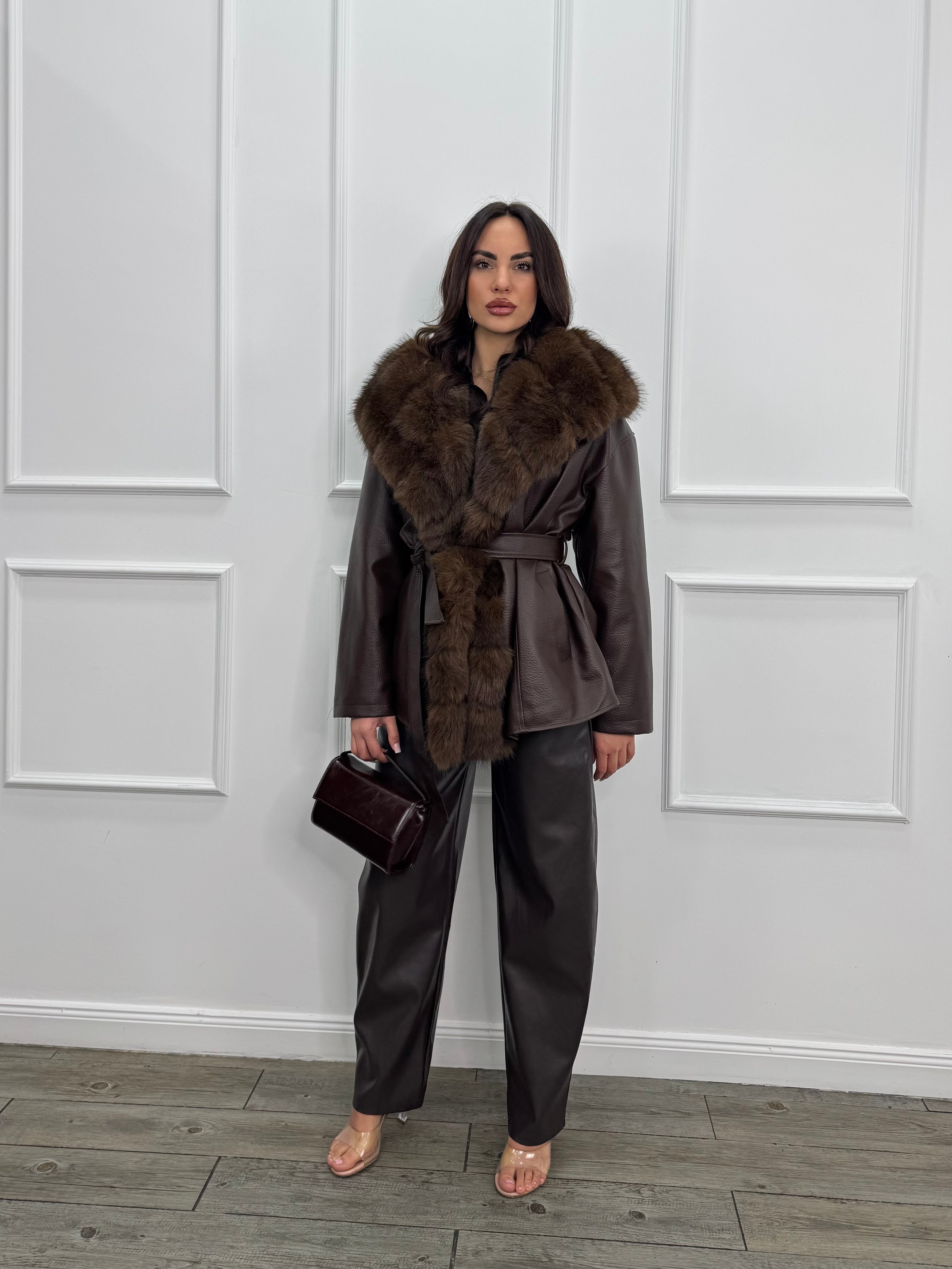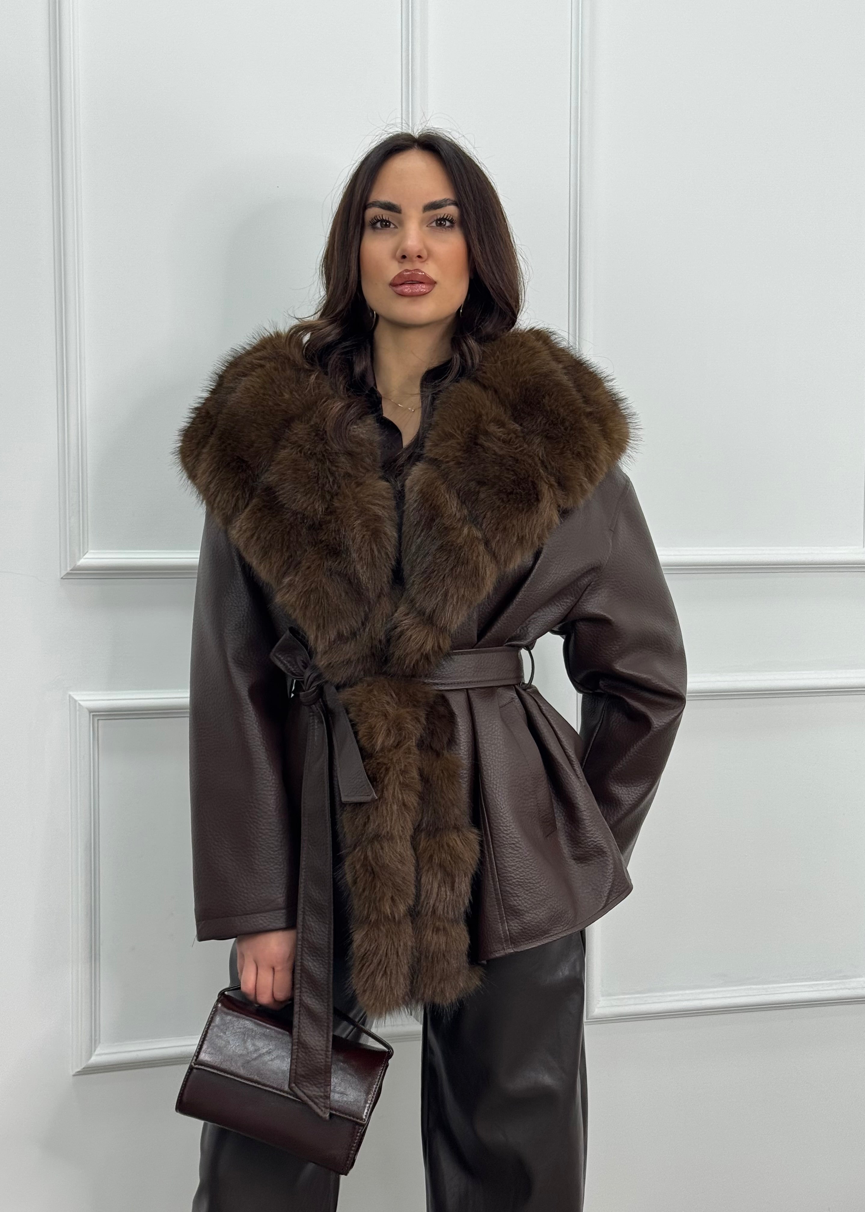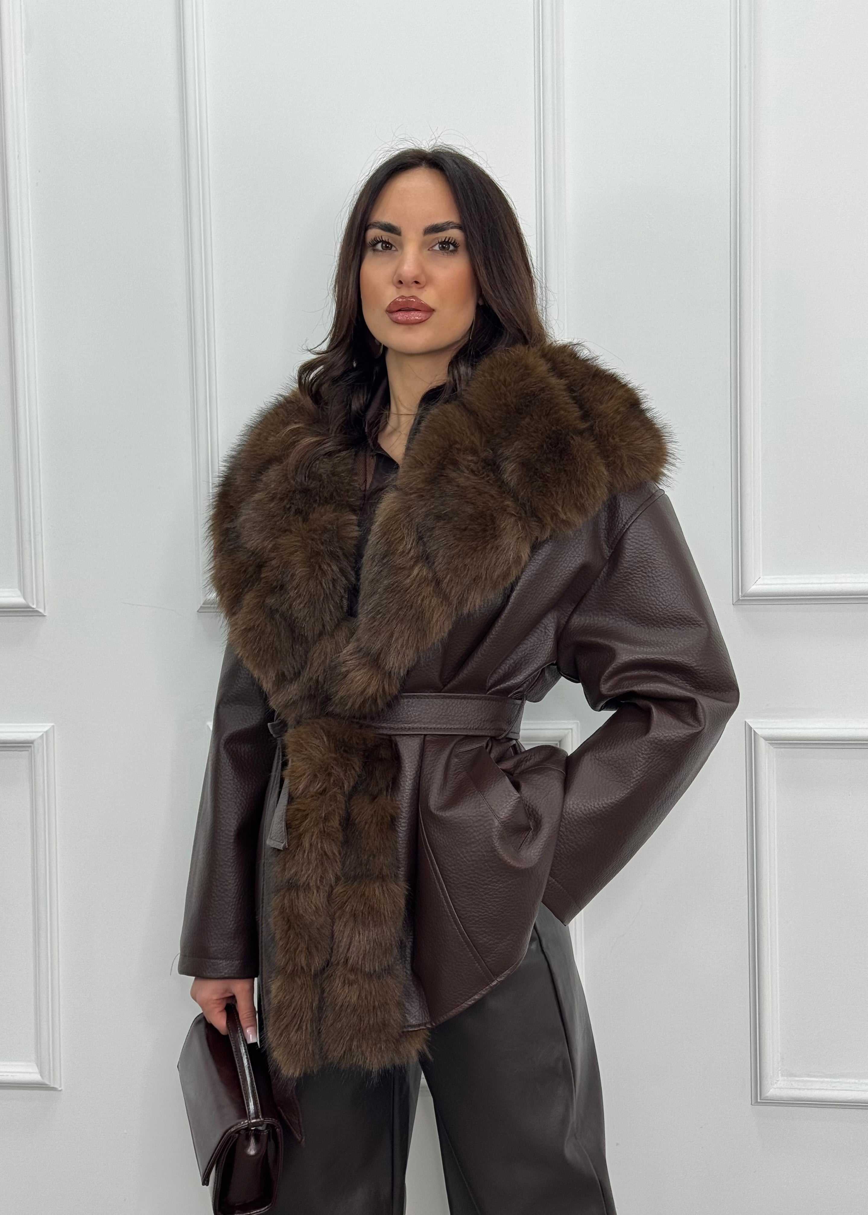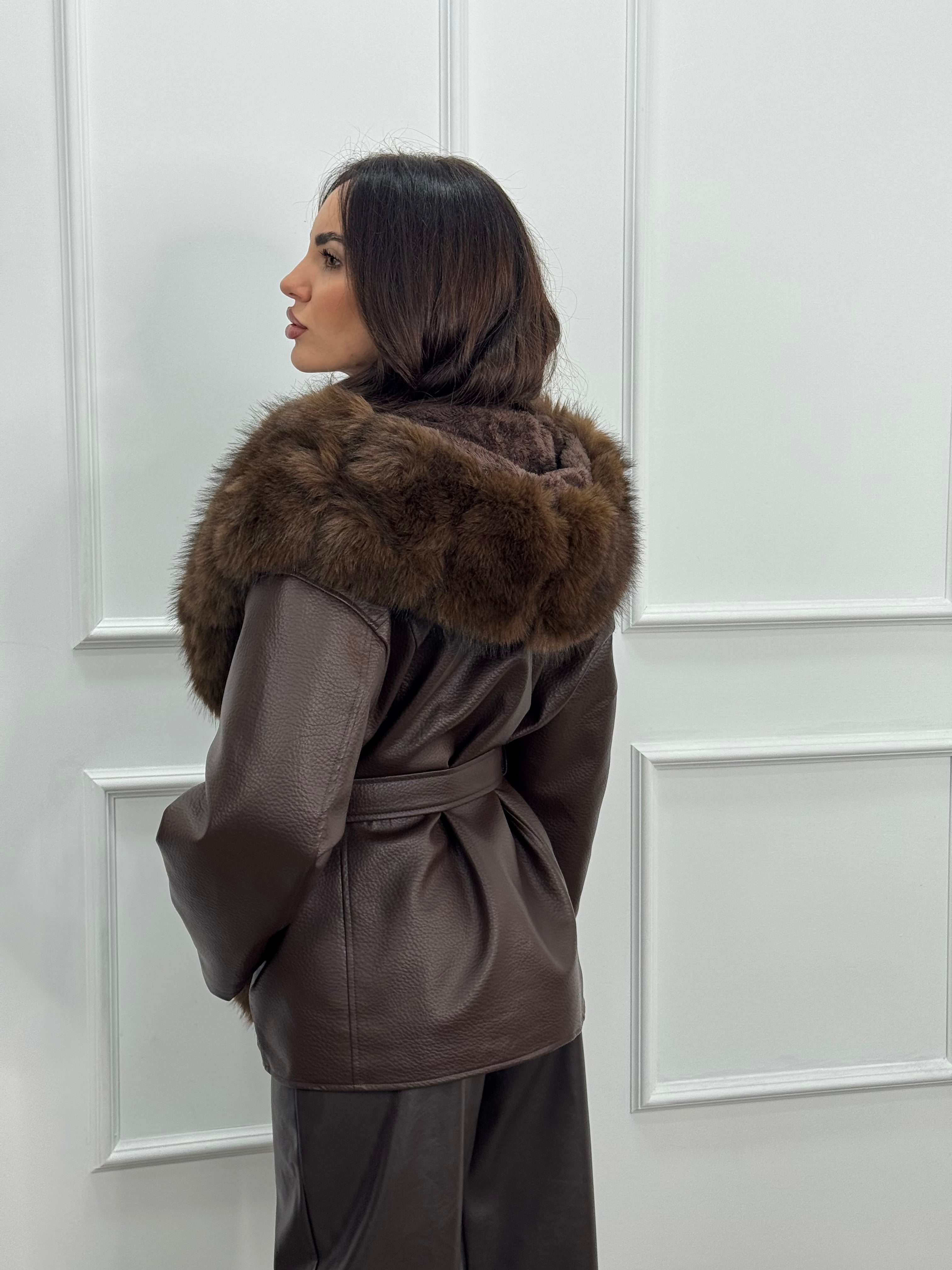 Giubbotto in ecopelle con cappuccio e dettagli in eco-pelliccia .