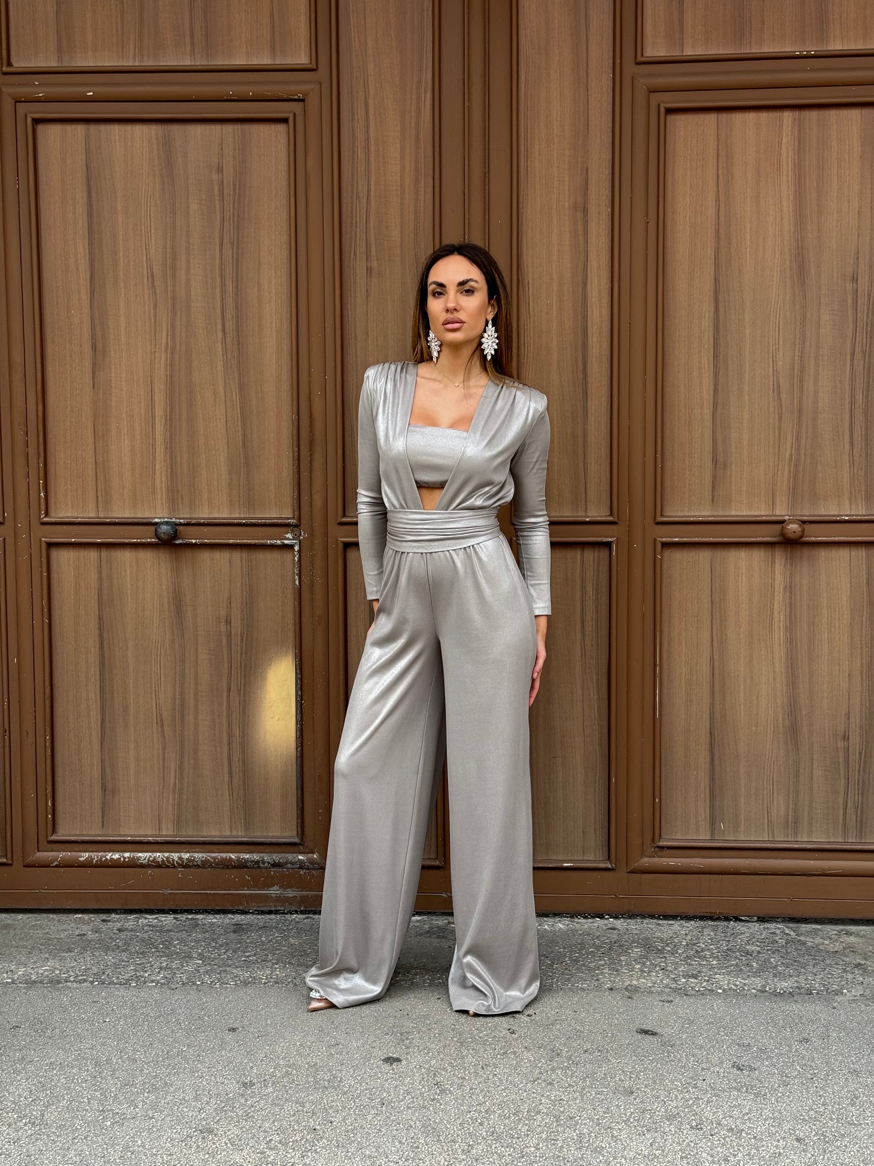 Meravigliosa tuta elegante con spalline drappeggiate ,profondo scollo a v con top rimovibile e fusciacca che evidenzia il punto vita aggiungendo sensualità all'intero look.