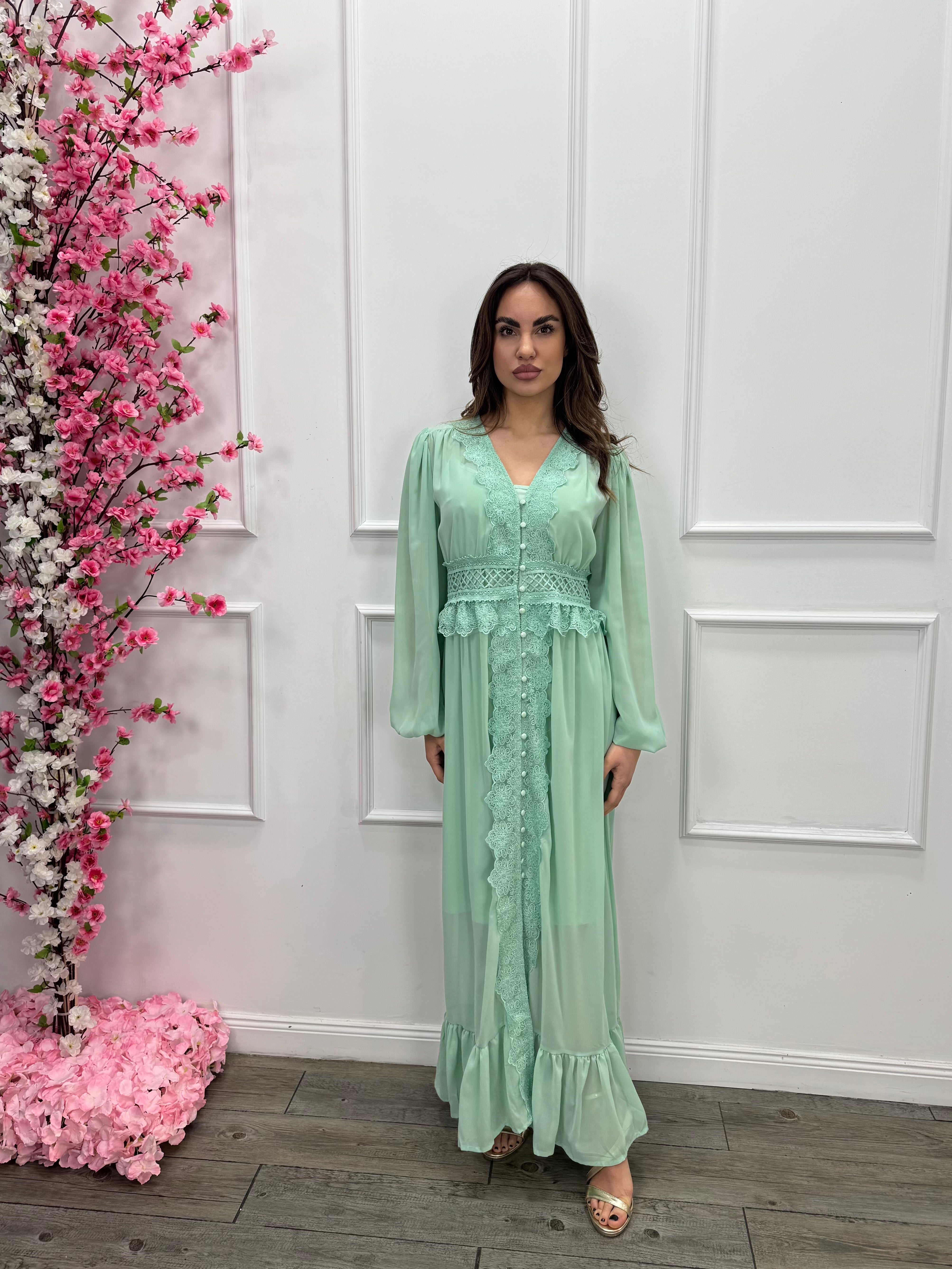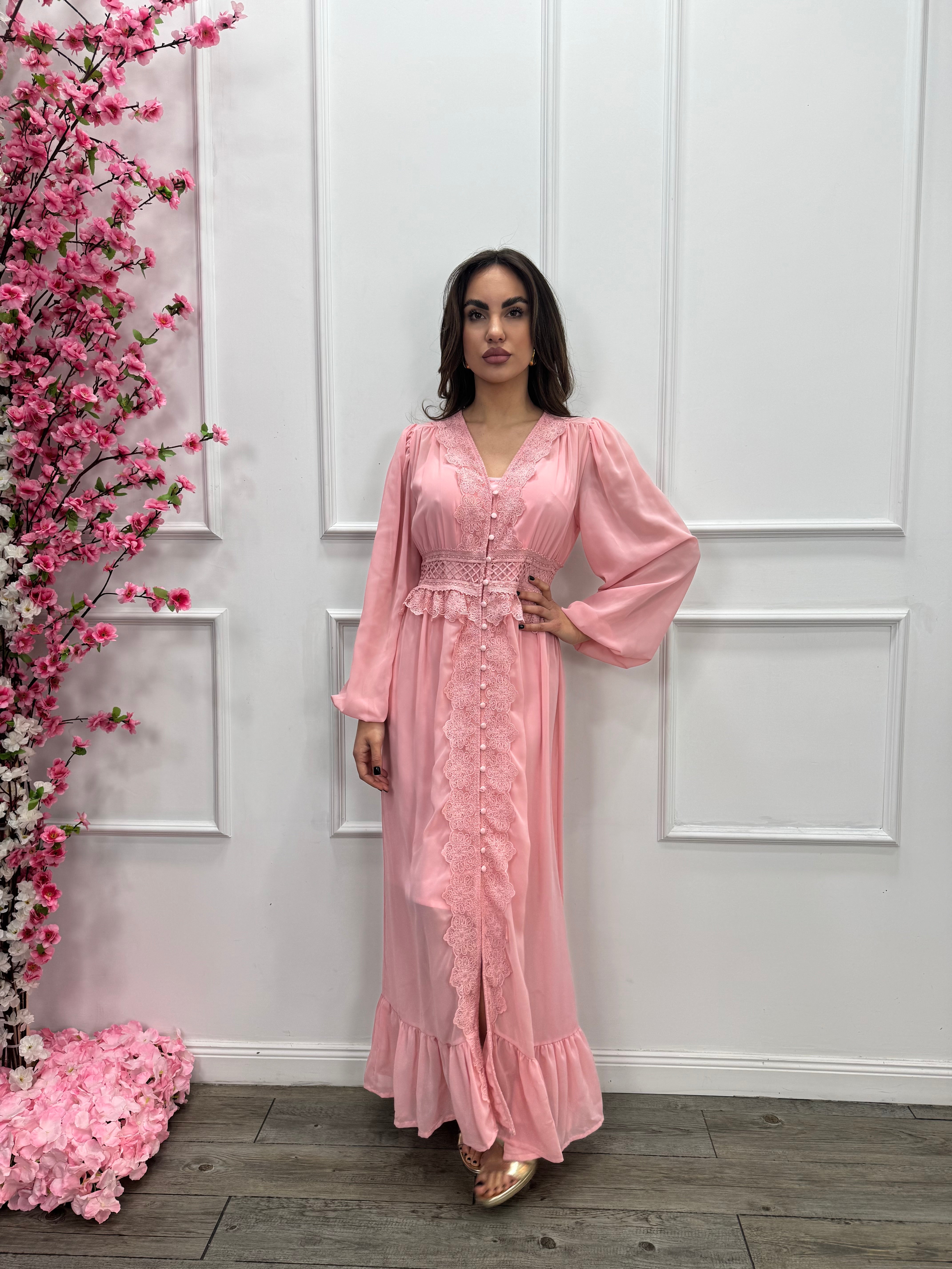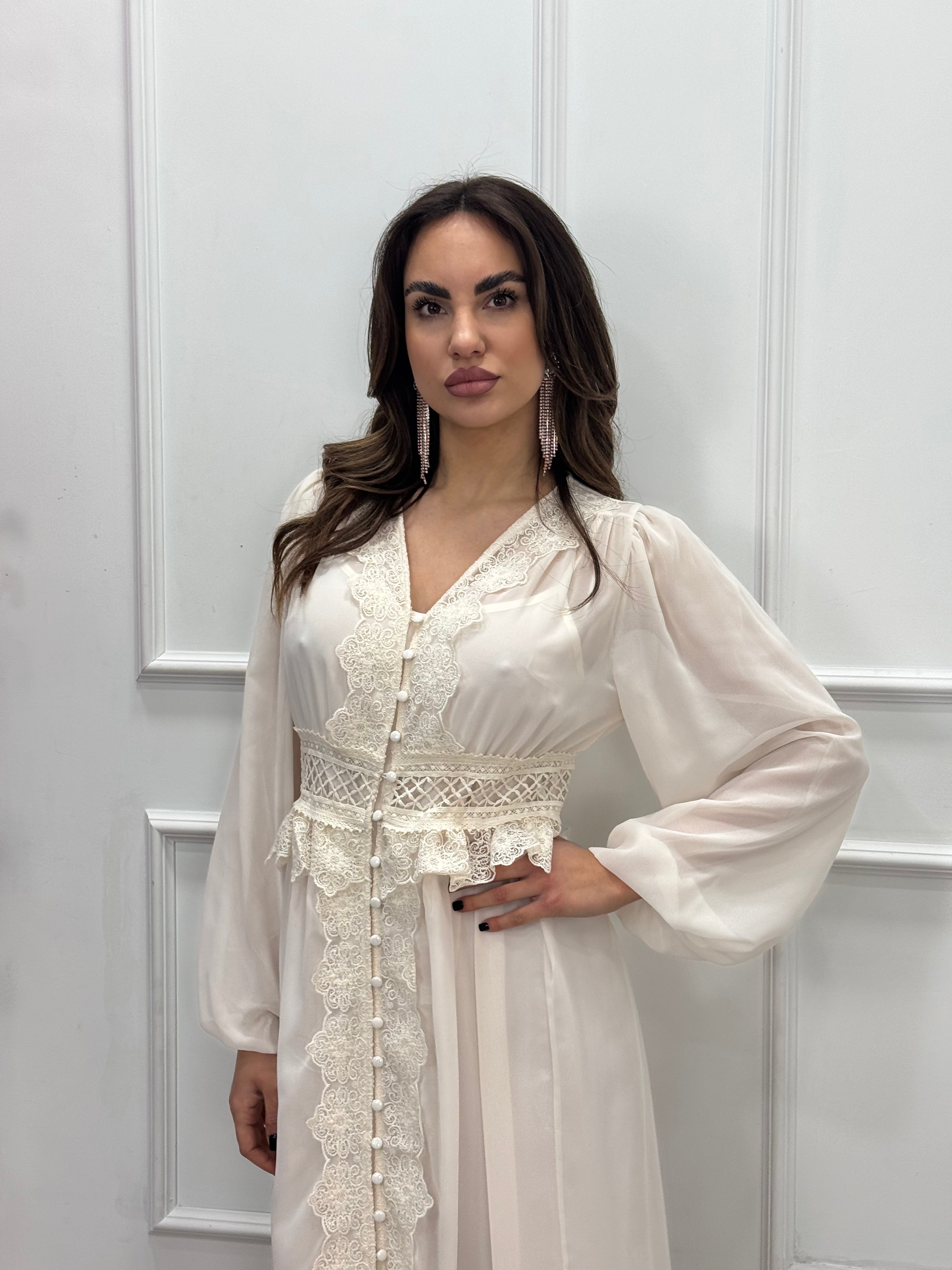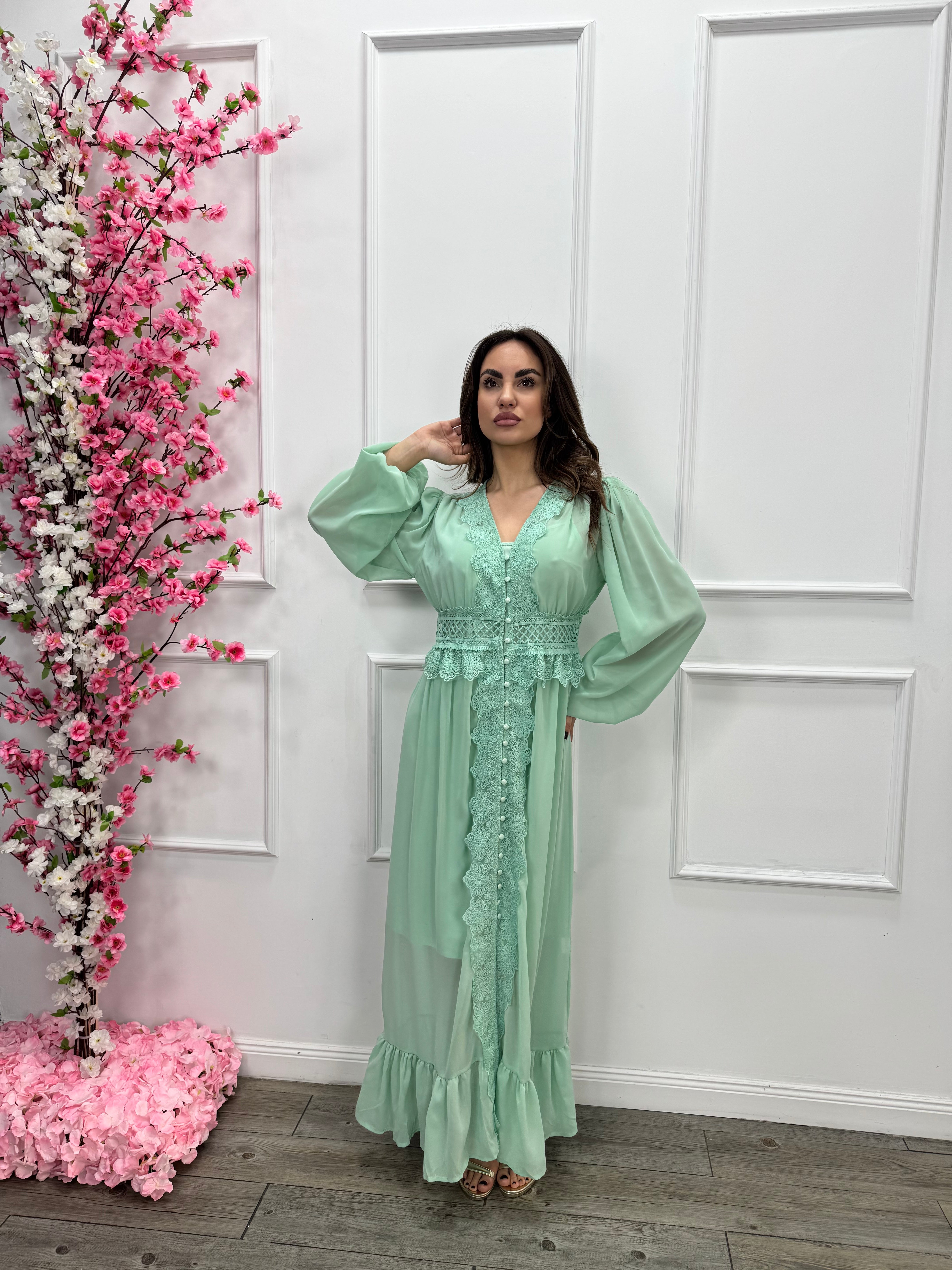 Bellissimo abito lungo in chiffon ,con chiusura frontale in tanti bottoni rivestiti.