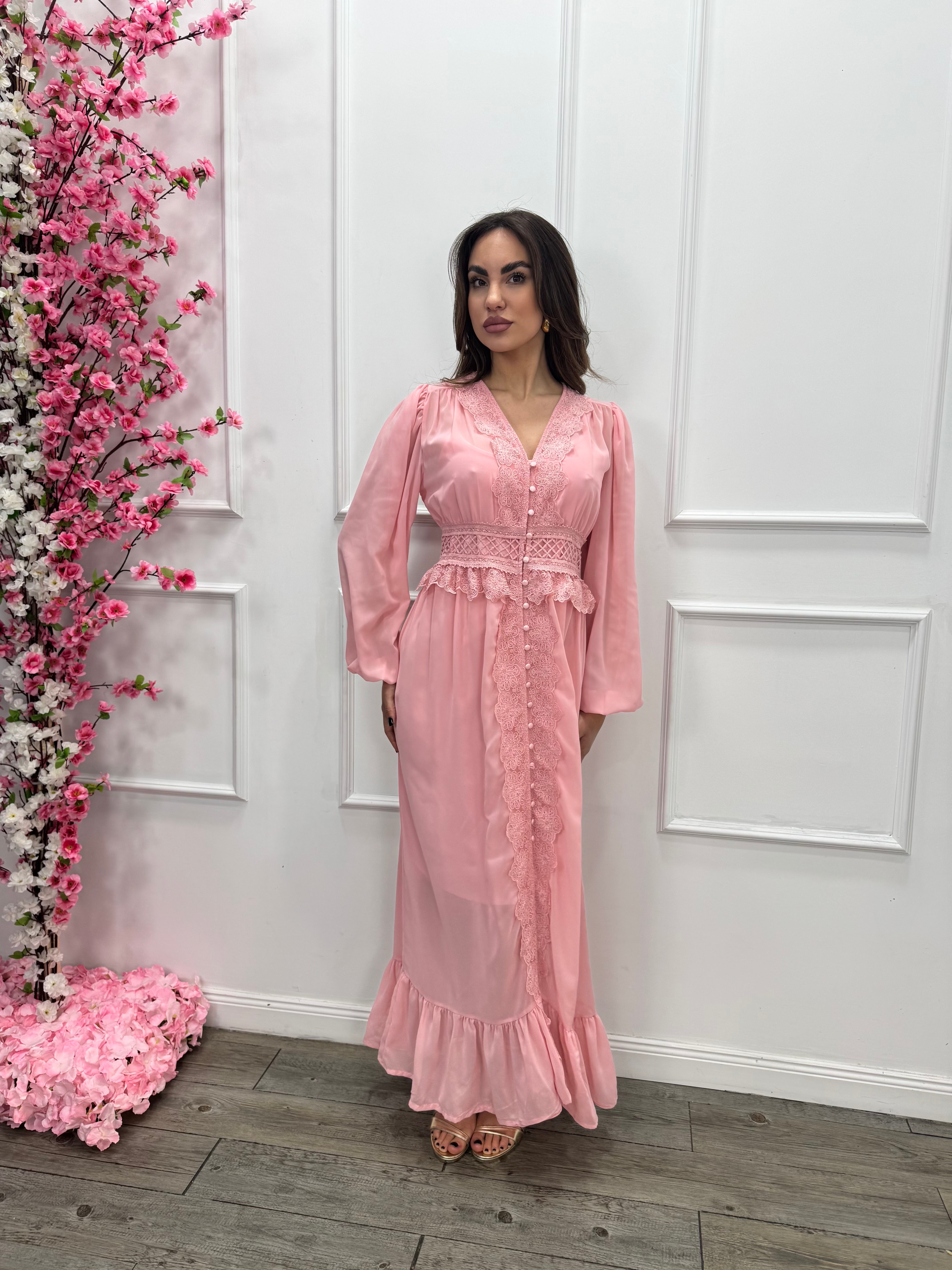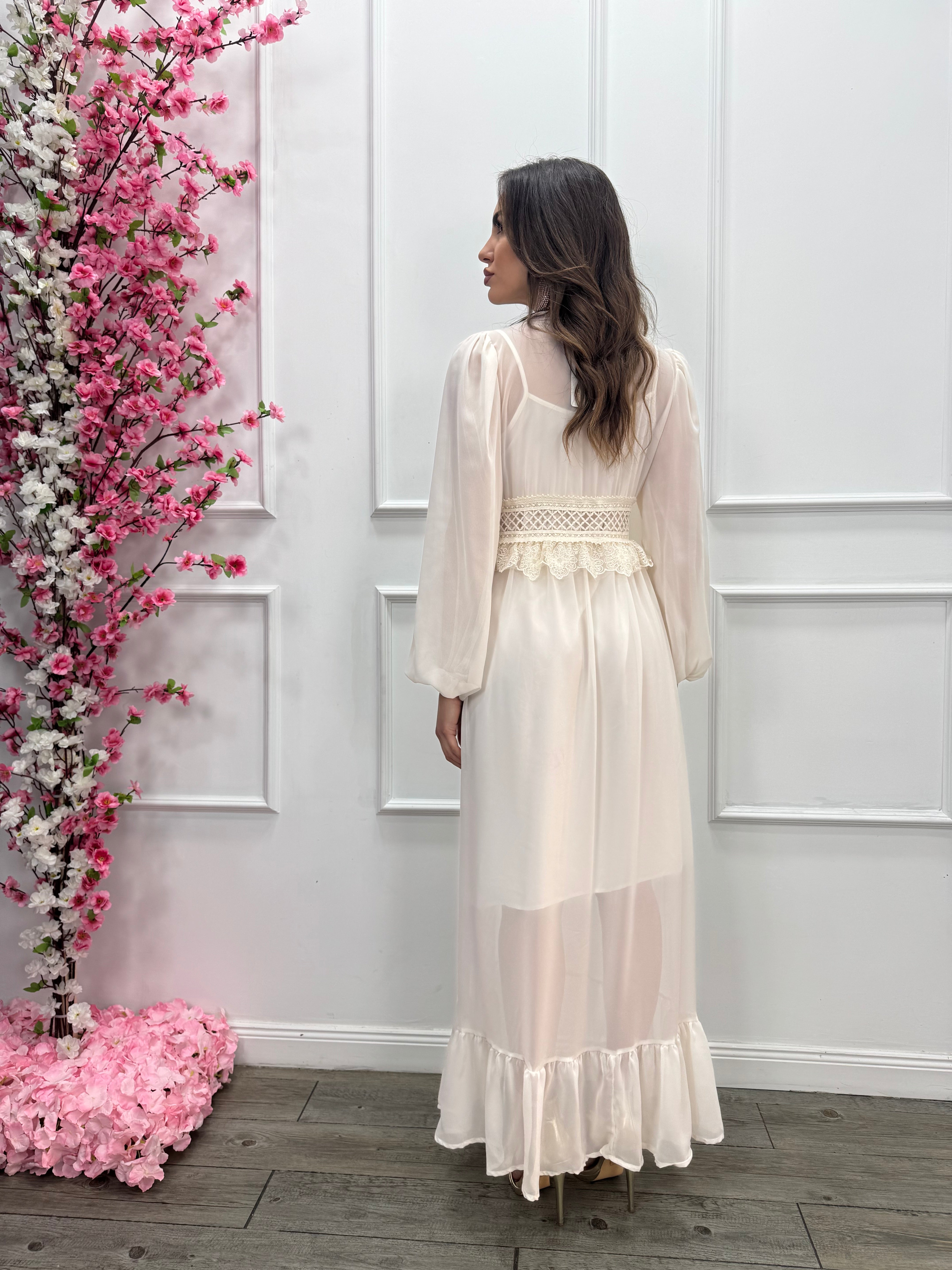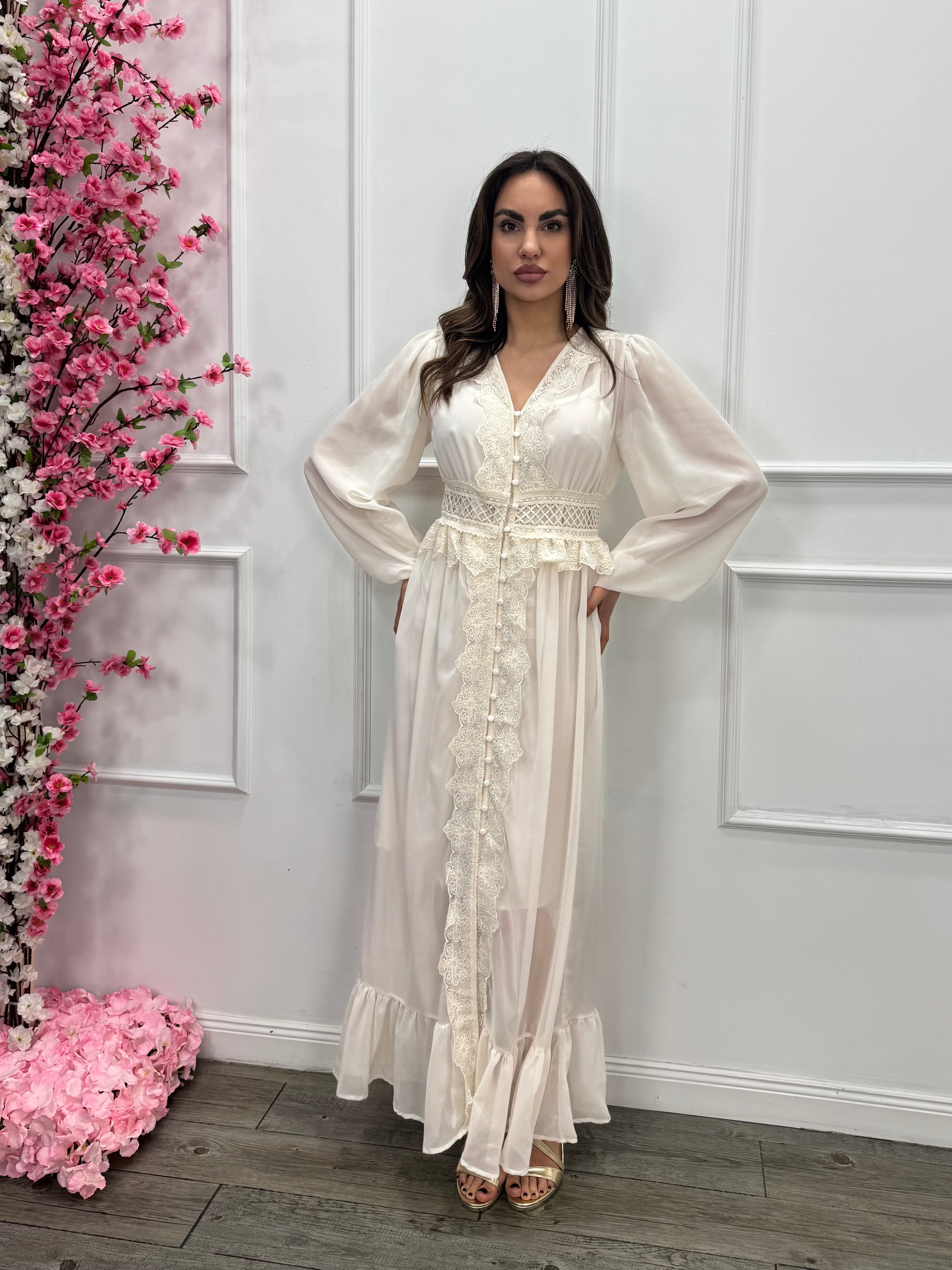 Bellissimo abito lungo in chiffon ,con chiusura frontale in tanti bottoni rivestiti.