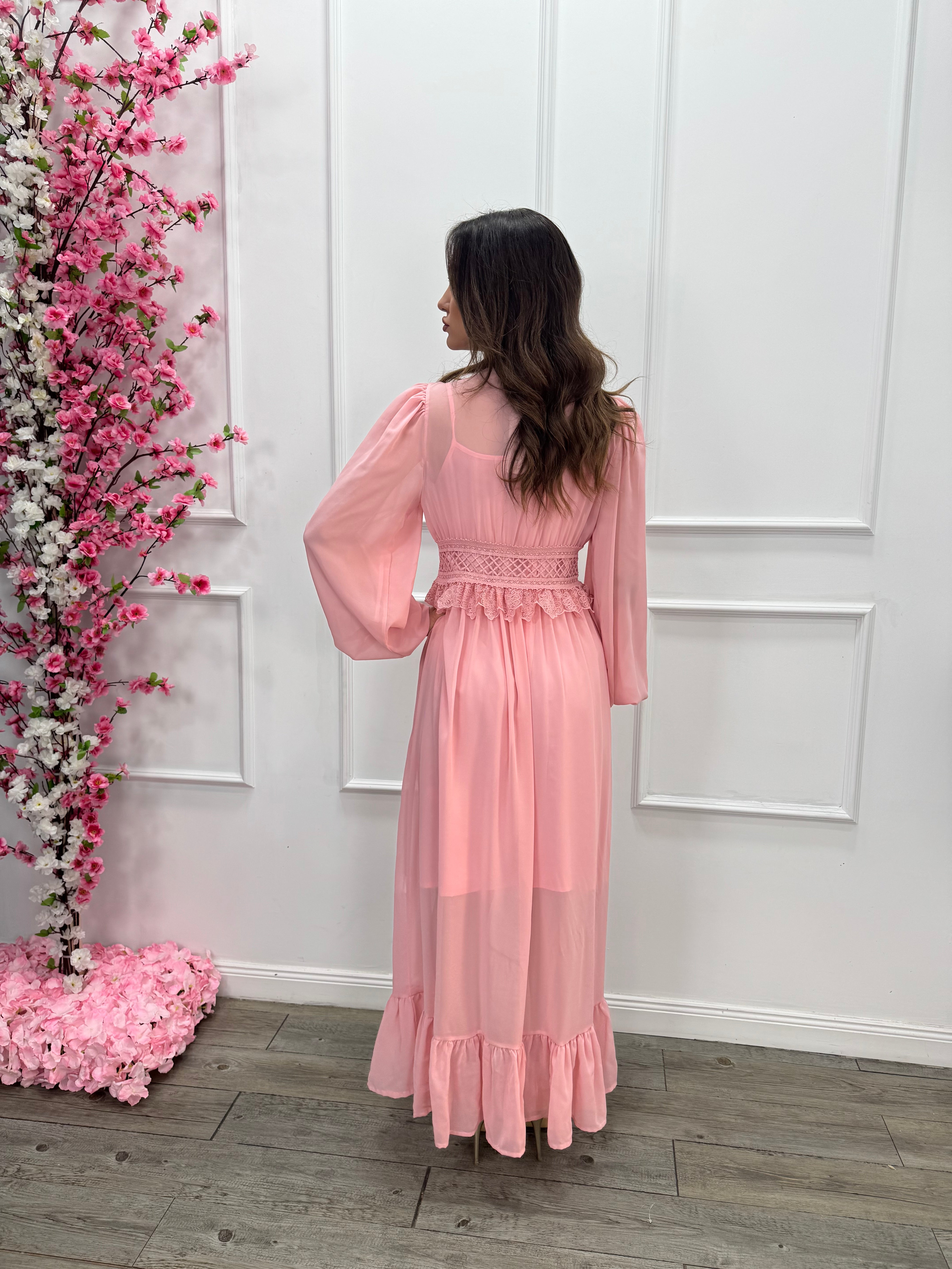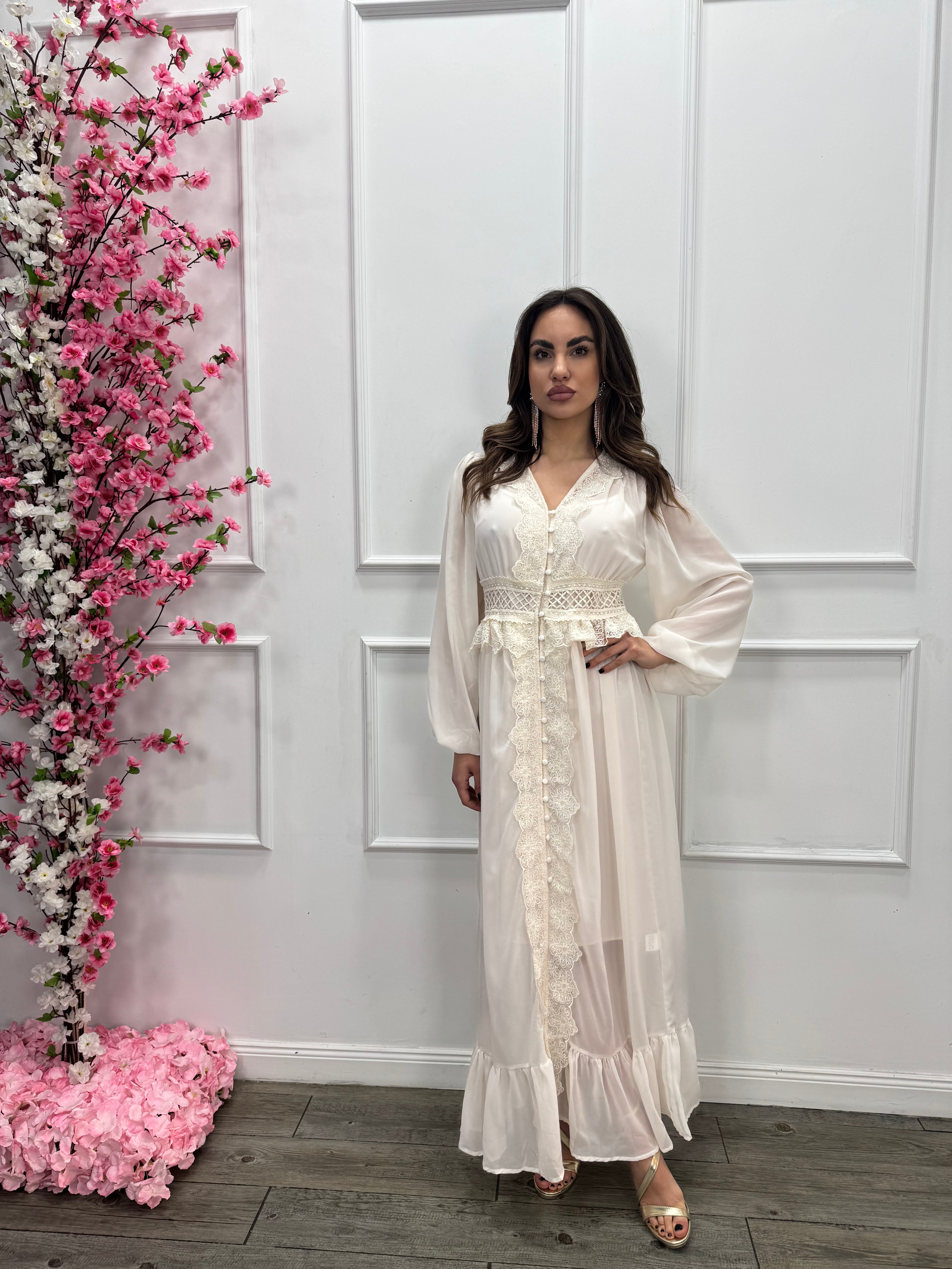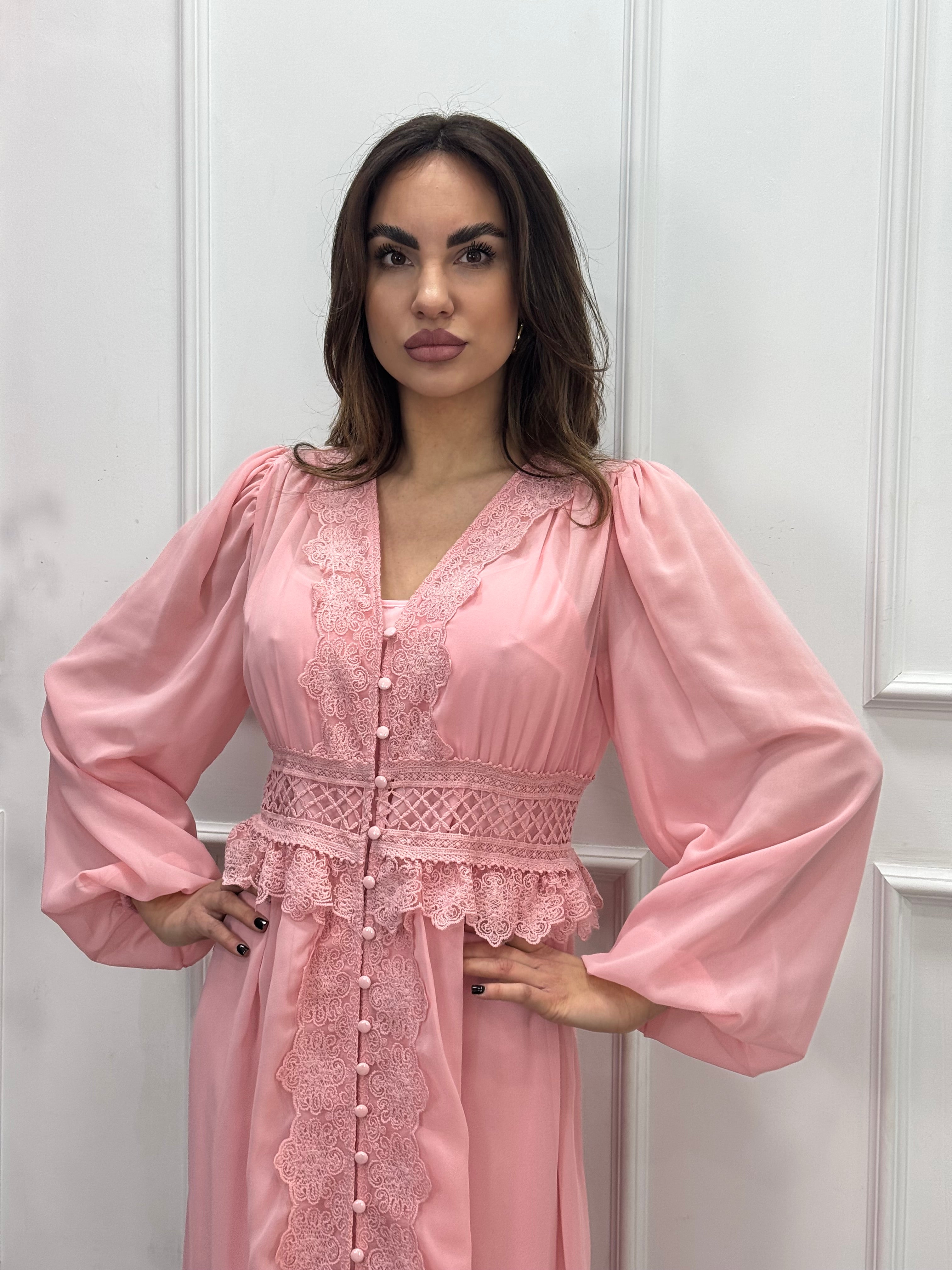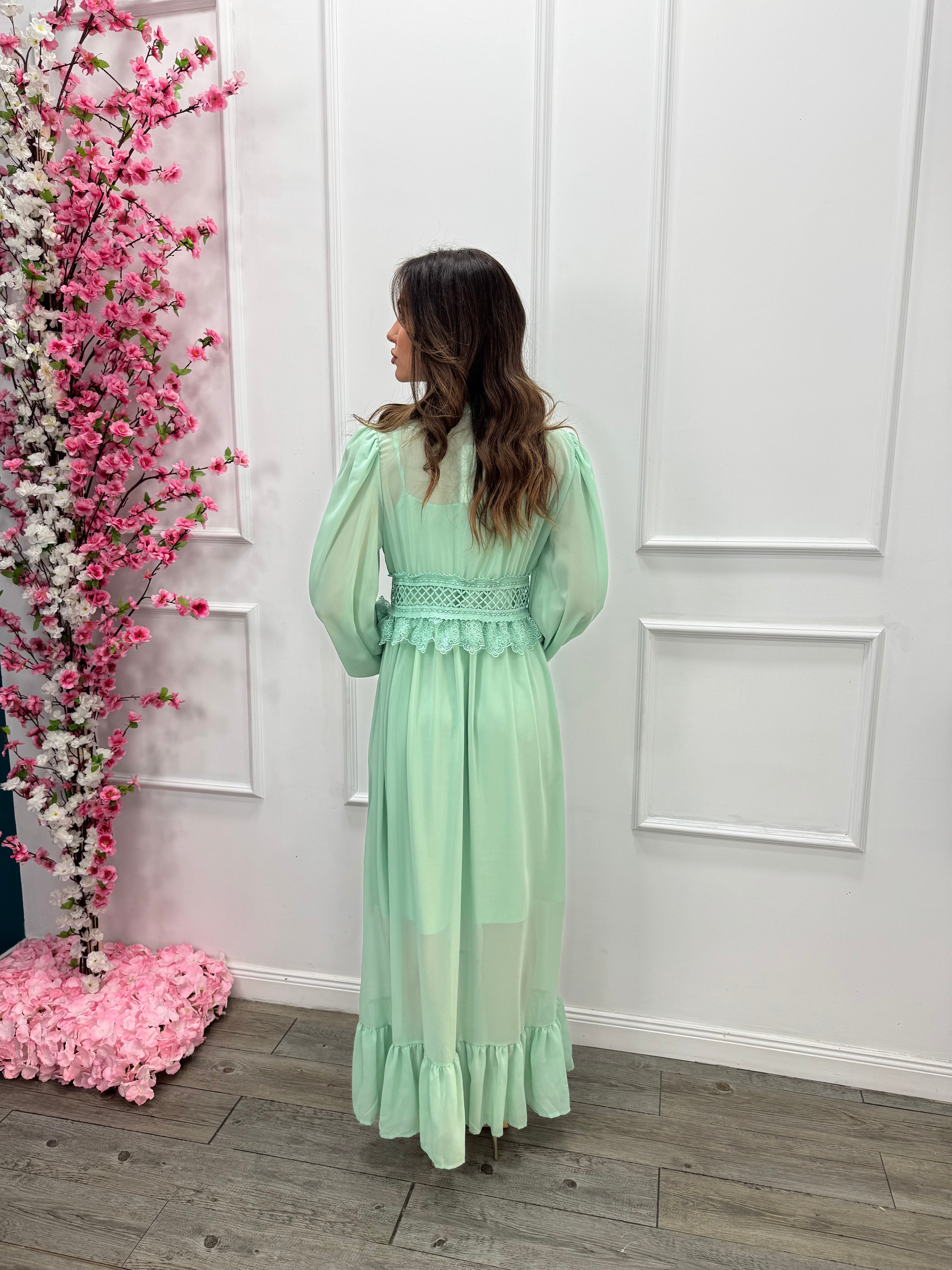 Bellissimo abito lungo in chiffon ,con chiusura frontale in tanti bottoni rivestiti.