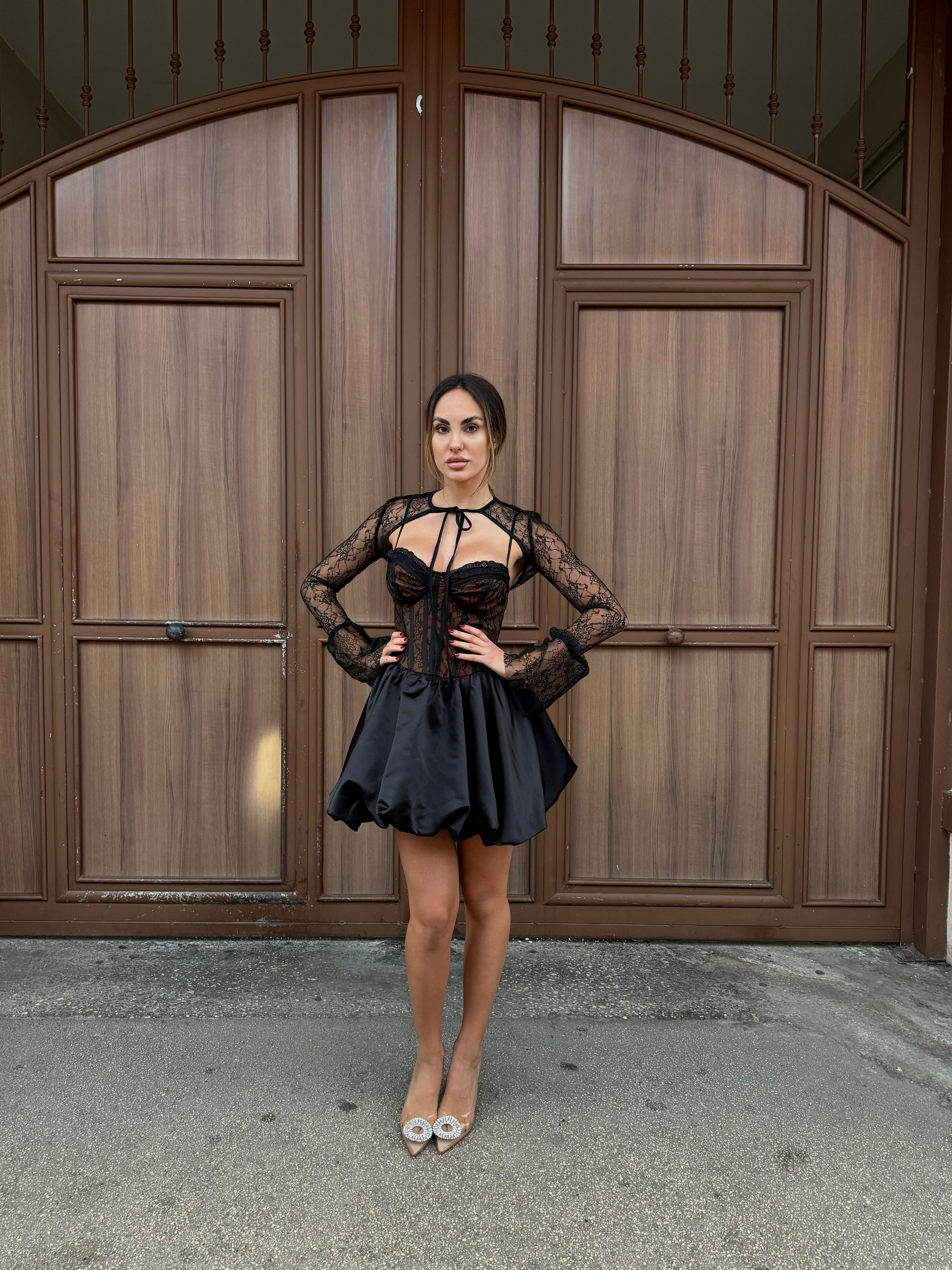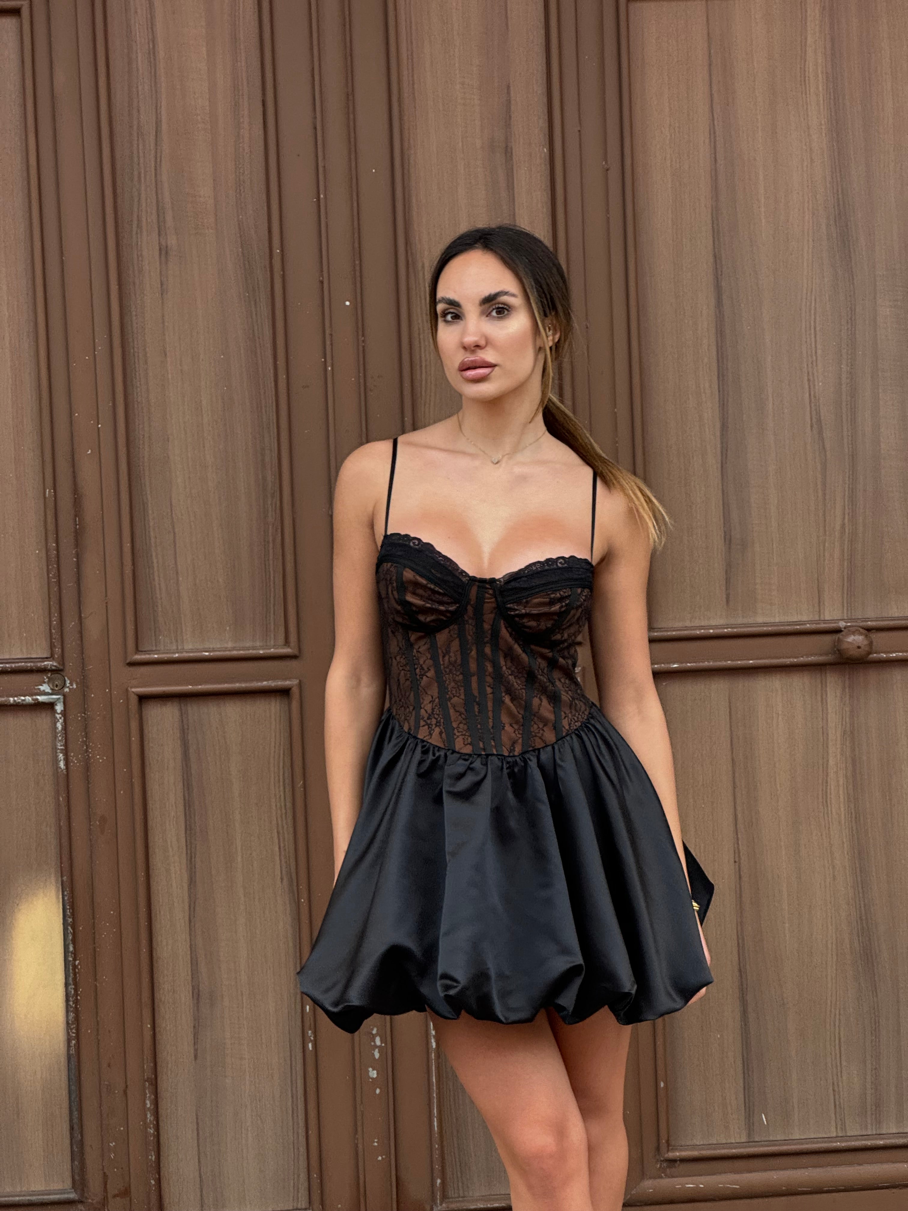 Bellissimo abito corto composto da corpetto in pizzo effetto bustier ,mentre la gonna in raso a palloncino da un tocco di tendenza e eleganza al tuo look.